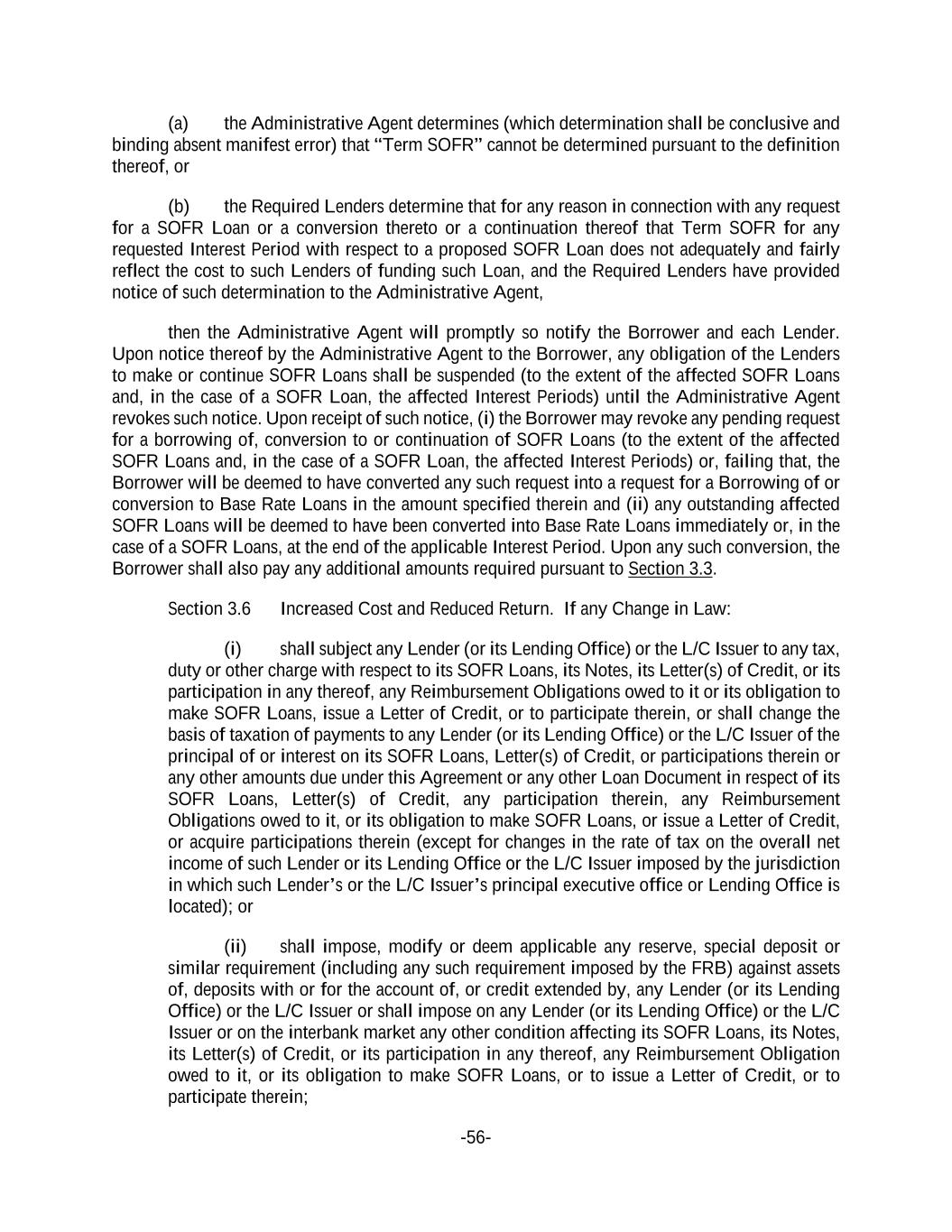-56- (a) the Administrative Agent determines (which determination shall be conclusive and binding absent manifest error) that “Term SOFR” cannot be determined pursuant to the definition thereof, or (b) the Required Lenders determine that for any reason in connection with any request for a SOFR Loan or a conversion thereto or a continuation thereof that Term SOFR for any requested Interest Period with respect to a proposed SOFR Loan does not adequately and fairly reflect the cost to such Lenders of funding such Loan, and the Required Lenders have provided notice of such determination to the Administrative Agent, then the Administrative Agent will promptly so notify the Borrower and each Lender. Upon notice thereof by the Administrative Agent to the Borrower, any obligation of the Lenders to make or continue SOFR Loans shall be suspended (to the extent of the affected SOFR Loans and, in the case of a SOFR Loan, the affected Interest Periods) until the Administrative Agent revokes such notice. Upon receipt of such notice, (i) the Borrower may revoke any pending request for a borrowing of, conversion to or continuation of SOFR Loans (to the extent of the affected SOFR Loans and, in the case of a SOFR Loan, the affected Interest Periods) or, failing that, the Borrower will be deemed to have converted any such request into a request for a Borrowing of or conversion to Base Rate Loans in the amount specified therein and (ii) any outstanding affected SOFR Loans will be deemed to have been converted into Base Rate Loans immediately or, in the case of a SOFR Loans, at the end of the applicable Interest Period. Upon any such conversion, the Borrower shall also pay any additional amounts required pursuant to Section 3.3. Section 3.6 Increased Cost and Reduced Return. If any Change in Law: (i) shall subject any Lender (or its Lending Office) or the L/C Issuer to any tax, duty or other charge with respect to its SOFR Loans, its Notes, its Letter(s) of Credit, or its participation in any thereof, any Reimbursement Obligations owed to it or its obligation to make SOFR Loans, issue a Letter of Credit, or to participate therein, or shall change the basis of taxation of payments to any Lender (or its Lending Office) or the L/C Issuer of the principal of or interest on its SOFR Loans, Letter(s) of Credit, or participations therein or any other amounts due under this Agreement or any other Loan Document in respect of its SOFR Loans, Letter(s) of Credit, any participation therein, any Reimbursement Obligations owed to it, or its obligation to make SOFR Loans, or issue a Letter of Credit, or acquire participations therein (except for changes in the rate of tax on the overall net income of such Lender or its Lending Office or the L/C Issuer imposed by the jurisdiction in which such Lender’s or the L/C Issuer’s principal executive office or Lending Office is located); or (ii) shall impose, modify or deem applicable any reserve, special deposit or similar requirement (including any such requirement imposed by the FRB) against assets of, deposits with or for the account of, or credit extended by, any Lender (or its Lending Office) or the L/C Issuer or shall impose on any Lender (or its Lending Office) or the L/C Issuer or on the interbank market any other condition affecting its SOFR Loans, its Notes, its Letter(s) of Credit, or its participation in any thereof, any Reimbursement Obligation owed to it, or its obligation to make SOFR Loans, or to issue a Letter of Credit, or to participate therein;