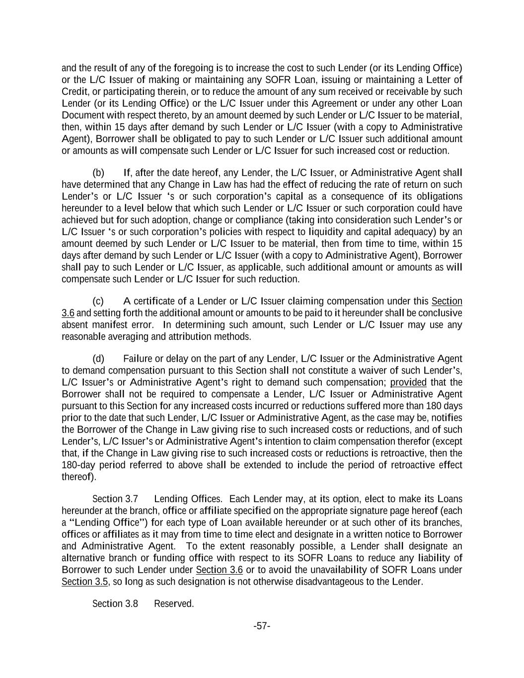 -57- and the result of any of the foregoing is to increase the cost to such Lender (or its Lending Office) or the L/C Issuer of making or maintaining any SOFR Loan, issuing or maintaining a Letter of Credit, or participating therein, or to reduce the amount of any sum received or receivable by such Lender (or its Lending Office) or the L/C Issuer under this Agreement or under any other Loan Document with respect thereto, by an amount deemed by such Lender or L/C Issuer to be material, then, within 15 days after demand by such Lender or L/C Issuer (with a copy to Administrative Agent), Borrower shall be obligated to pay to such Lender or L/C Issuer such additional amount or amounts as will compensate such Lender or L/C Issuer for such increased cost or reduction. (b) If, after the date hereof, any Lender, the L/C Issuer, or Administrative Agent shall have determined that any Change in Law has had the effect of reducing the rate of return on such Lender’s or L/C Issuer ‘s or such corporation’s capital as a consequence of its obligations hereunder to a level below that which such Lender or L/C Issuer or such corporation could have achieved but for such adoption, change or compliance (taking into consideration such Lender’s or L/C Issuer ‘s or such corporation’s policies with respect to liquidity and capital adequacy) by an amount deemed by such Lender or L/C Issuer to be material, then from time to time, within 15 days after demand by such Lender or L/C Issuer (with a copy to Administrative Agent), Borrower shall pay to such Lender or L/C Issuer, as applicable, such additional amount or amounts as will compensate such Lender or L/C Issuer for such reduction. (c) A certificate of a Lender or L/C Issuer claiming compensation under this Section 3.6 and setting forth the additional amount or amounts to be paid to it hereunder shall be conclusive absent manifest error. In determining such amount, such Lender or L/C Issuer may use any reasonable averaging and attribution methods. (d) Failure or delay on the part of any Lender, L/C Issuer or the Administrative Agent to demand compensation pursuant to this Section shall not constitute a waiver of such Lender’s, L/C Issuer’s or Administrative Agent’s right to demand such compensation; provided that the Borrower shall not be required to compensate a Lender, L/C Issuer or Administrative Agent pursuant to this Section for any increased costs incurred or reductions suffered more than 180 days prior to the date that such Lender, L/C Issuer or Administrative Agent, as the case may be, notifies the Borrower of the Change in Law giving rise to such increased costs or reductions, and of such Lender’s, L/C Issuer’s or Administrative Agent’s intention to claim compensation therefor (except that, if the Change in Law giving rise to such increased costs or reductions is retroactive, then the 180-day period referred to above shall be extended to include the period of retroactive effect thereof). Section 3.7 Lending Offices. Each Lender may, at its option, elect to make its Loans hereunder at the branch, office or affiliate specified on the appropriate signature page hereof (each a “Lending Office”) for each type of Loan available hereunder or at such other of its branches, offices or affiliates as it may from time to time elect and designate in a written notice to Borrower and Administrative Agent. To the extent reasonably possible, a Lender shall designate an alternative branch or funding office with respect to its SOFR Loans to reduce any liability of Borrower to such Lender under Section 3.6 or to avoid the unavailability of SOFR Loans under Section 3.5, so long as such designation is not otherwise disadvantageous to the Lender. Section 3.8 Reserved.