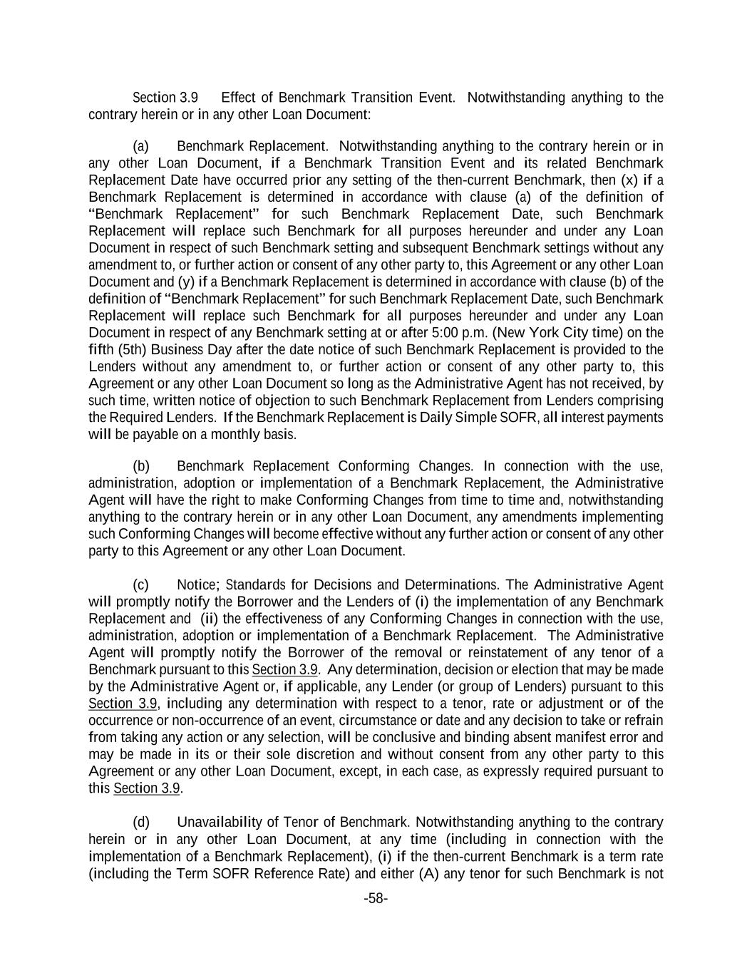-58- Section 3.9 Effect of Benchmark Transition Event. Notwithstanding anything to the contrary herein or in any other Loan Document: (a) Benchmark Replacement. Notwithstanding anything to the contrary herein or in any other Loan Document, if a Benchmark Transition Event and its related Benchmark Replacement Date have occurred prior any setting of the then-current Benchmark, then (x) if a Benchmark Replacement is determined in accordance with clause (a) of the definition of “Benchmark Replacement” for such Benchmark Replacement Date, such Benchmark Replacement will replace such Benchmark for all purposes hereunder and under any Loan Document in respect of such Benchmark setting and subsequent Benchmark settings without any amendment to, or further action or consent of any other party to, this Agreement or any other Loan Document and (y) if a Benchmark Replacement is determined in accordance with clause (b) of the definition of “Benchmark Replacement” for such Benchmark Replacement Date, such Benchmark Replacement will replace such Benchmark for all purposes hereunder and under any Loan Document in respect of any Benchmark setting at or after 5:00 p.m. (New York City time) on the fifth (5th) Business Day after the date notice of such Benchmark Replacement is provided to the Lenders without any amendment to, or further action or consent of any other party to, this Agreement or any other Loan Document so long as the Administrative Agent has not received, by such time, written notice of objection to such Benchmark Replacement from Lenders comprising the Required Lenders. If the Benchmark Replacement is Daily Simple SOFR, all interest payments will be payable on a monthly basis. (b) Benchmark Replacement Conforming Changes. In connection with the use, administration, adoption or implementation of a Benchmark Replacement, the Administrative Agent will have the right to make Conforming Changes from time to time and, notwithstanding anything to the contrary herein or in any other Loan Document, any amendments implementing such Conforming Changes will become effective without any further action or consent of any other party to this Agreement or any other Loan Document. (c) Notice; Standards for Decisions and Determinations. The Administrative Agent will promptly notify the Borrower and the Lenders of (i) the implementation of any Benchmark Replacement and (ii) the effectiveness of any Conforming Changes in connection with the use, administration, adoption or implementation of a Benchmark Replacement. The Administrative Agent will promptly notify the Borrower of the removal or reinstatement of any tenor of a Benchmark pursuant to this Section 3.9. Any determination, decision or election that may be made by the Administrative Agent or, if applicable, any Lender (or group of Lenders) pursuant to this Section 3.9, including any determination with respect to a tenor, rate or adjustment or of the occurrence or non-occurrence of an event, circumstance or date and any decision to take or refrain from taking any action or any selection, will be conclusive and binding absent manifest error and may be made in its or their sole discretion and without consent from any other party to this Agreement or any other Loan Document, except, in each case, as expressly required pursuant to this Section 3.9. (d) Unavailability of Tenor of Benchmark. Notwithstanding anything to the contrary herein or in any other Loan Document, at any time (including in connection with the implementation of a Benchmark Replacement), (i) if the then-current Benchmark is a term rate (including the Term SOFR Reference Rate) and either (A) any tenor for such Benchmark is not