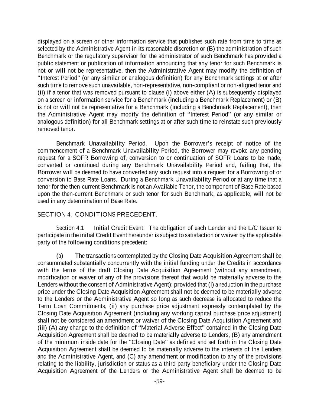 -59- displayed on a screen or other information service that publishes such rate from time to time as selected by the Administrative Agent in its reasonable discretion or (B) the administration of such Benchmark or the regulatory supervisor for the administrator of such Benchmark has provided a public statement or publication of information announcing that any tenor for such Benchmark is not or will not be representative, then the Administrative Agent may modify the definition of “Interest Period” (or any similar or analogous definition) for any Benchmark settings at or after such time to remove such unavailable, non-representative, non-compliant or non-aligned tenor and (ii) if a tenor that was removed pursuant to clause (i) above either (A) is subsequently displayed on a screen or information service for a Benchmark (including a Benchmark Replacement) or (B) is not or will not be representative for a Benchmark (including a Benchmark Replacement), then the Administrative Agent may modify the definition of “Interest Period” (or any similar or analogous definition) for all Benchmark settings at or after such time to reinstate such previously removed tenor. Benchmark Unavailability Period. Upon the Borrower’s receipt of notice of the commencement of a Benchmark Unavailability Period, the Borrower may revoke any pending request for a SOFR Borrowing of, conversion to or continuation of SOFR Loans to be made, converted or continued during any Benchmark Unavailability Period and, failing that, the Borrower will be deemed to have converted any such request into a request for a Borrowing of or conversion to Base Rate Loans. During a Benchmark Unavailability Period or at any time that a tenor for the then-current Benchmark is not an Available Tenor, the component of Base Rate based upon the then-current Benchmark or such tenor for such Benchmark, as applicable, will not be used in any determination of Base Rate. SECTION 4. CONDITIONS PRECEDENT. Section 4.1 Initial Credit Event. The obligation of each Lender and the L/C Issuer to participate in the initial Credit Event hereunder is subject to satisfaction or waiver by the applicable party of the following conditions precedent: (a) The transactions contemplated by the Closing Date Acquisition Agreement shall be consummated substantially concurrently with the initial funding under the Credits in accordance with the terms of the draft Closing Date Acquisition Agreement (without any amendment, modification or waiver of any of the provisions thereof that would be materially adverse to the Lenders without the consent of Administrative Agent); provided that (i) a reduction in the purchase price under the Closing Date Acquisition Agreement shall not be deemed to be materially adverse to the Lenders or the Administrative Agent so long as such decrease is allocated to reduce the Term Loan Commitments, (ii) any purchase price adjustment expressly contemplated by the Closing Date Acquisition Agreement (including any working capital purchase price adjustment) shall not be considered an amendment or waiver of the Closing Date Acquisition Agreement and (iii) (A) any change to the definition of “Material Adverse Effect” contained in the Closing Date Acquisition Agreement shall be deemed to be materially adverse to Lenders, (B) any amendment of the minimum inside date for the “Closing Date” as defined and set forth in the Closing Date Acquisition Agreement shall be deemed to be materially adverse to the interests of the Lenders and the Administrative Agent, and (C) any amendment or modification to any of the provisions relating to the liability, jurisdiction or status as a third party beneficiary under the Closing Date Acquisition Agreement of the Lenders or the Administrative Agent shall be deemed to be