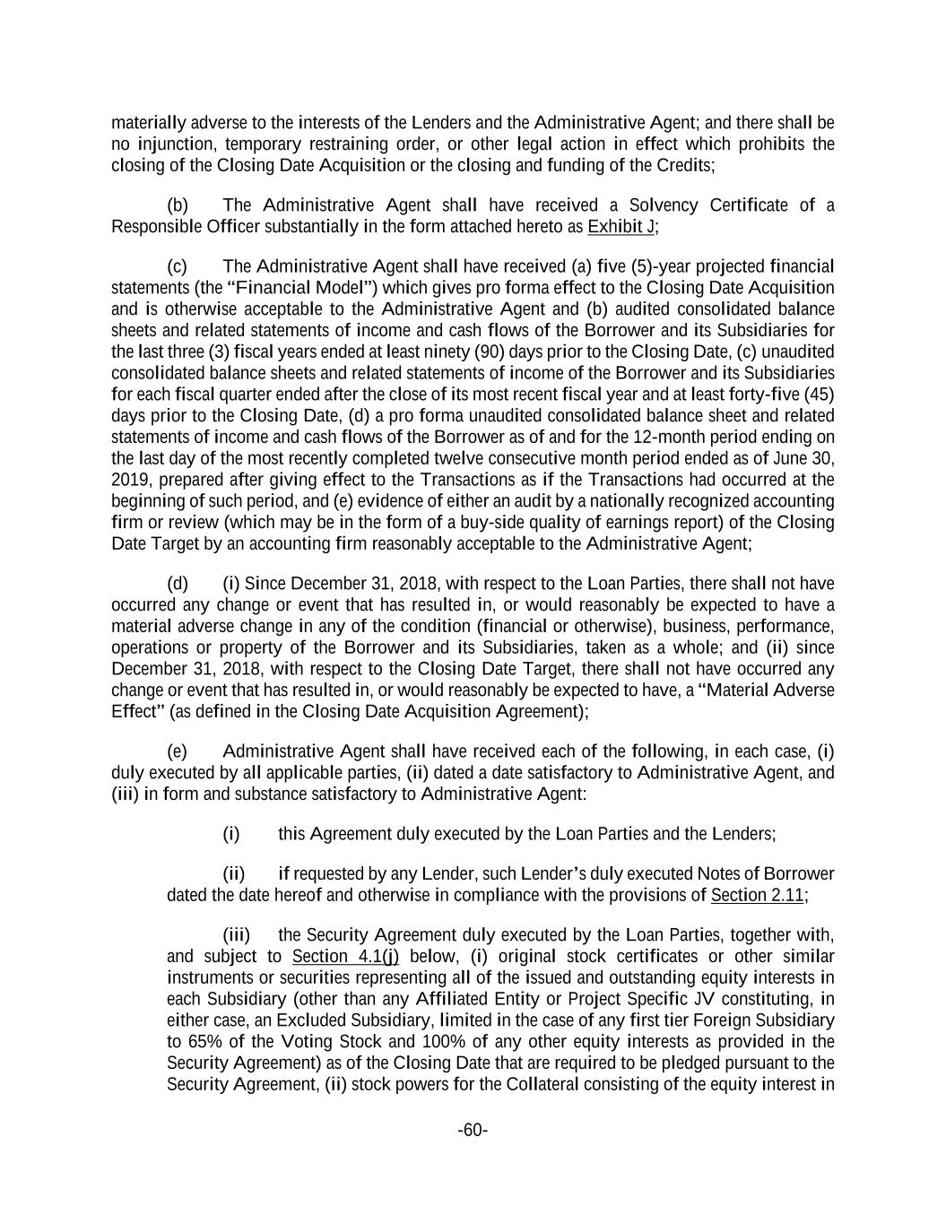 -60- materially adverse to the interests of the Lenders and the Administrative Agent; and there shall be no injunction, temporary restraining order, or other legal action in effect which prohibits the closing of the Closing Date Acquisition or the closing and funding of the Credits; (b) The Administrative Agent shall have received a Solvency Certificate of a Responsible Officer substantially in the form attached hereto as Exhibit J; (c) The Administrative Agent shall have received (a) five (5)-year projected financial statements (the “Financial Model”) which gives pro forma effect to the Closing Date Acquisition and is otherwise acceptable to the Administrative Agent and (b) audited consolidated balance sheets and related statements of income and cash flows of the Borrower and its Subsidiaries for the last three (3) fiscal years ended at least ninety (90) days prior to the Closing Date, (c) unaudited consolidated balance sheets and related statements of income of the Borrower and its Subsidiaries for each fiscal quarter ended after the close of its most recent fiscal year and at least forty-five (45) days prior to the Closing Date, (d) a pro forma unaudited consolidated balance sheet and related statements of income and cash flows of the Borrower as of and for the 12-month period ending on the last day of the most recently completed twelve consecutive month period ended as of June 30, 2019, prepared after giving effect to the Transactions as if the Transactions had occurred at the beginning of such period, and (e) evidence of either an audit by a nationally recognized accounting firm or review (which may be in the form of a buy-side quality of earnings report) of the Closing Date Target by an accounting firm reasonably acceptable to the Administrative Agent; (d) (i) Since December 31, 2018, with respect to the Loan Parties, there shall not have occurred any change or event that has resulted in, or would reasonably be expected to have a material adverse change in any of the condition (financial or otherwise), business, performance, operations or property of the Borrower and its Subsidiaries, taken as a whole; and (ii) since December 31, 2018, with respect to the Closing Date Target, there shall not have occurred any change or event that has resulted in, or would reasonably be expected to have, a “Material Adverse Effect” (as defined in the Closing Date Acquisition Agreement); (e) Administrative Agent shall have received each of the following, in each case, (i) duly executed by all applicable parties, (ii) dated a date satisfactory to Administrative Agent, and (iii) in form and substance satisfactory to Administrative Agent: (i) this Agreement duly executed by the Loan Parties and the Lenders; (ii) if requested by any Lender, such Lender’s duly executed Notes of Borrower dated the date hereof and otherwise in compliance with the provisions of Section 2.11; (iii) the Security Agreement duly executed by the Loan Parties, together with, and subject to Section 4.1(j) below, (i) original stock certificates or other similar instruments or securities representing all of the issued and outstanding equity interests in each Subsidiary (other than any Affiliated Entity or Project Specific JV constituting, in either case, an Excluded Subsidiary, limited in the case of any first tier Foreign Subsidiary to 65% of the Voting Stock and 100% of any other equity interests as provided in the Security Agreement) as of the Closing Date that are required to be pledged pursuant to the Security Agreement, (ii) stock powers for the Collateral consisting of the equity interest in