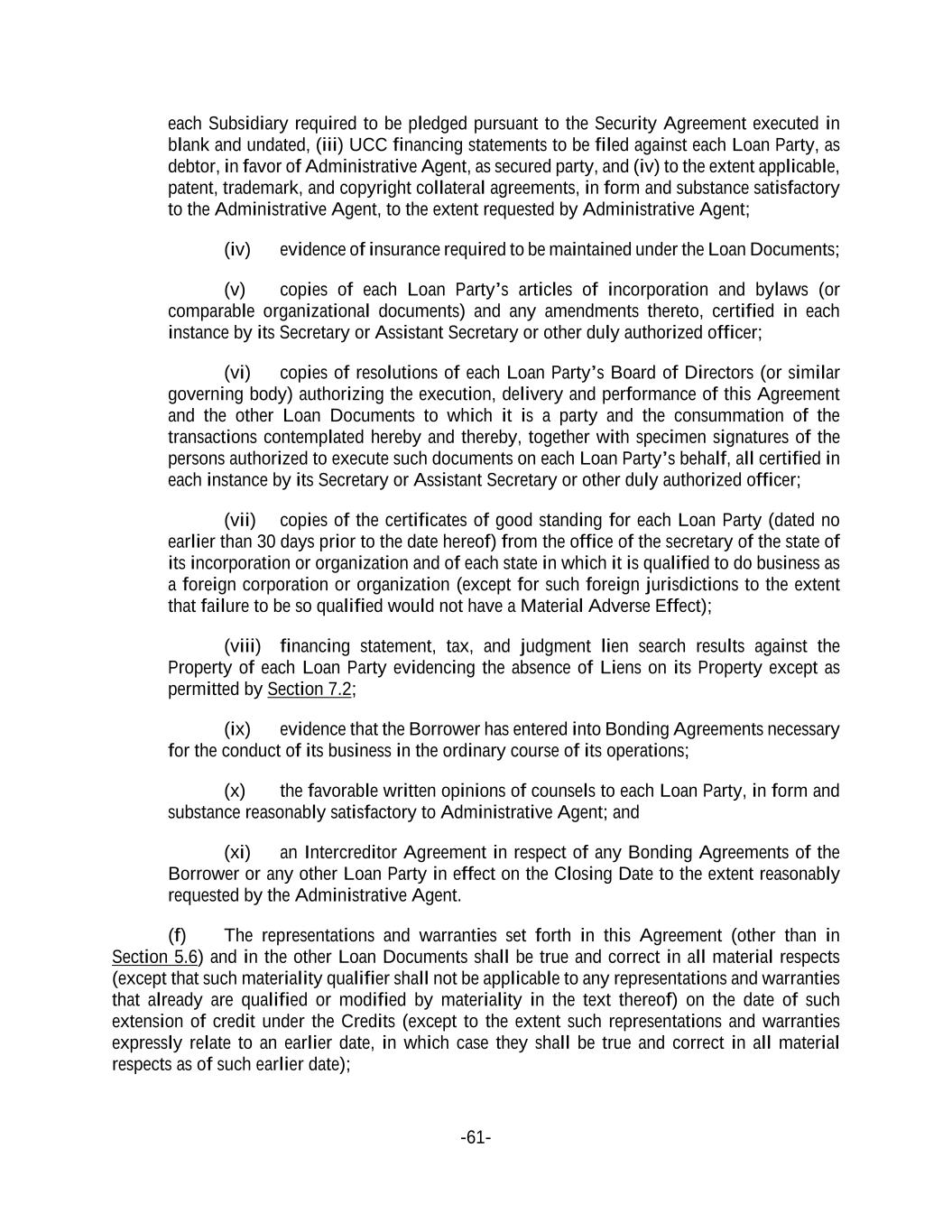 -61- each Subsidiary required to be pledged pursuant to the Security Agreement executed in blank and undated, (iii) UCC financing statements to be filed against each Loan Party, as debtor, in favor of Administrative Agent, as secured party, and (iv) to the extent applicable, patent, trademark, and copyright collateral agreements, in form and substance satisfactory to the Administrative Agent, to the extent requested by Administrative Agent; (iv) evidence of insurance required to be maintained under the Loan Documents; (v) copies of each Loan Party’s articles of incorporation and bylaws (or comparable organizational documents) and any amendments thereto, certified in each instance by its Secretary or Assistant Secretary or other duly authorized officer; (vi) copies of resolutions of each Loan Party’s Board of Directors (or similar governing body) authorizing the execution, delivery and performance of this Agreement and the other Loan Documents to which it is a party and the consummation of the transactions contemplated hereby and thereby, together with specimen signatures of the persons authorized to execute such documents on each Loan Party’s behalf, all certified in each instance by its Secretary or Assistant Secretary or other duly authorized officer; (vii) copies of the certificates of good standing for each Loan Party (dated no earlier than 30 days prior to the date hereof) from the office of the secretary of the state of its incorporation or organization and of each state in which it is qualified to do business as a foreign corporation or organization (except for such foreign jurisdictions to the extent that failure to be so qualified would not have a Material Adverse Effect); (viii) financing statement, tax, and judgment lien search results against the Property of each Loan Party evidencing the absence of Liens on its Property except as permitted by Section 7.2; (ix) evidence that the Borrower has entered into Bonding Agreements necessary for the conduct of its business in the ordinary course of its operations; (x) the favorable written opinions of counsels to each Loan Party, in form and substance reasonably satisfactory to Administrative Agent; and (xi) an Intercreditor Agreement in respect of any Bonding Agreements of the Borrower or any other Loan Party in effect on the Closing Date to the extent reasonably requested by the Administrative Agent. (f) The representations and warranties set forth in this Agreement (other than in Section 5.6) and in the other Loan Documents shall be true and correct in all material respects (except that such materiality qualifier shall not be applicable to any representations and warranties that already are qualified or modified by materiality in the text thereof) on the date of such extension of credit under the Credits (except to the extent such representations and warranties expressly relate to an earlier date, in which case they shall be true and correct in all material respects as of such earlier date);