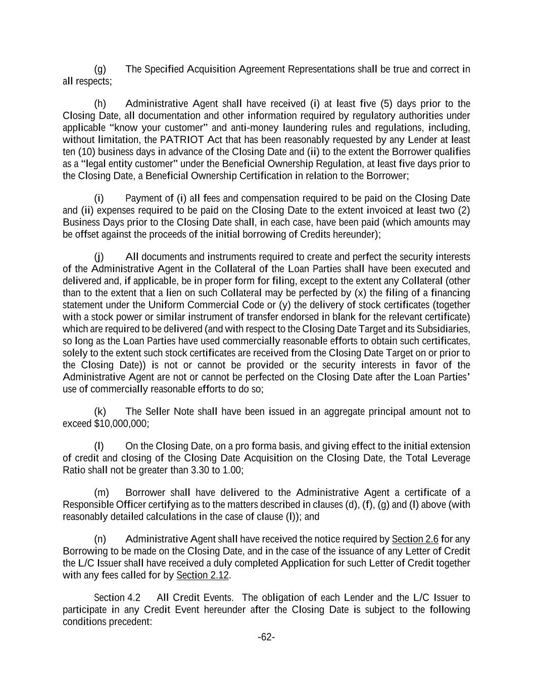 -62- (g) The Specified Acquisition Agreement Representations shall be true and correct in all respects; (h) Administrative Agent shall have received (i) at least five (5) days prior to the Closing Date, all documentation and other information required by regulatory authorities under applicable “know your customer” and anti-money laundering rules and regulations, including, without limitation, the PATRIOT Act that has been reasonably requested by any Lender at least ten (10) business days in advance of the Closing Date and (ii) to the extent the Borrower qualifies as a “legal entity customer” under the Beneficial Ownership Regulation, at least five days prior to the Closing Date, a Beneficial Ownership Certification in relation to the Borrower; (i) Payment of (i) all fees and compensation required to be paid on the Closing Date and (ii) expenses required to be paid on the Closing Date to the extent invoiced at least two (2) Business Days prior to the Closing Date shall, in each case, have been paid (which amounts may be offset against the proceeds of the initial borrowing of Credits hereunder); (j) All documents and instruments required to create and perfect the security interests of the Administrative Agent in the Collateral of the Loan Parties shall have been executed and delivered and, if applicable, be in proper form for filing, except to the extent any Collateral (other than to the extent that a lien on such Collateral may be perfected by (x) the filing of a financing statement under the Uniform Commercial Code or (y) the delivery of stock certificates (together with a stock power or similar instrument of transfer endorsed in blank for the relevant certificate) which are required to be delivered (and with respect to the Closing Date Target and its Subsidiaries, so long as the Loan Parties have used commercially reasonable efforts to obtain such certificates, solely to the extent such stock certificates are received from the Closing Date Target on or prior to the Closing Date)) is not or cannot be provided or the security interests in favor of the Administrative Agent are not or cannot be perfected on the Closing Date after the Loan Parties’ use of commercially reasonable efforts to do so; (k) The Seller Note shall have been issued in an aggregate principal amount not to exceed $10,000,000; (l) On the Closing Date, on a pro forma basis, and giving effect to the initial extension of credit and closing of the Closing Date Acquisition on the Closing Date, the Total Leverage Ratio shall not be greater than 3.30 to 1.00; (m) Borrower shall have delivered to the Administrative Agent a certificate of a Responsible Officer certifying as to the matters described in clauses (d), (f), (g) and (l) above (with reasonably detailed calculations in the case of clause (l)); and (n) Administrative Agent shall have received the notice required by Section 2.6 for any Borrowing to be made on the Closing Date, and in the case of the issuance of any Letter of Credit the L/C Issuer shall have received a duly completed Application for such Letter of Credit together with any fees called for by Section 2.12. Section 4.2 All Credit Events. The obligation of each Lender and the L/C Issuer to participate in any Credit Event hereunder after the Closing Date is subject to the following conditions precedent: