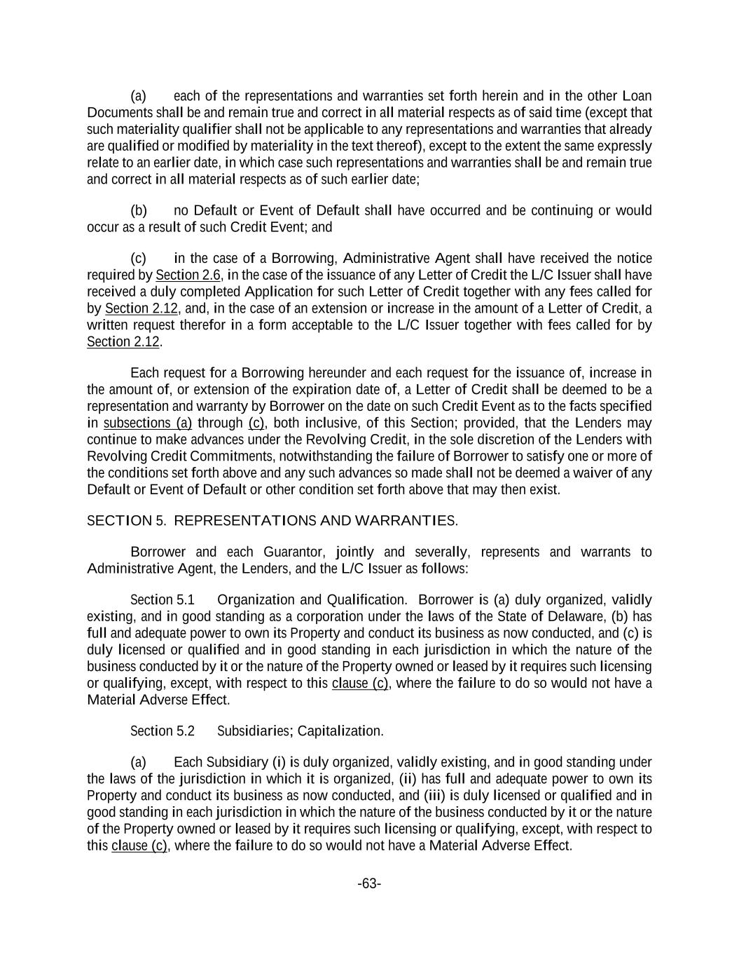 -63- (a) each of the representations and warranties set forth herein and in the other Loan Documents shall be and remain true and correct in all material respects as of said time (except that such materiality qualifier shall not be applicable to any representations and warranties that already are qualified or modified by materiality in the text thereof), except to the extent the same expressly relate to an earlier date, in which case such representations and warranties shall be and remain true and correct in all material respects as of such earlier date; (b) no Default or Event of Default shall have occurred and be continuing or would occur as a result of such Credit Event; and (c) in the case of a Borrowing, Administrative Agent shall have received the notice required by Section 2.6, in the case of the issuance of any Letter of Credit the L/C Issuer shall have received a duly completed Application for such Letter of Credit together with any fees called for by Section 2.12, and, in the case of an extension or increase in the amount of a Letter of Credit, a written request therefor in a form acceptable to the L/C Issuer together with fees called for by Section 2.12. Each request for a Borrowing hereunder and each request for the issuance of, increase in the amount of, or extension of the expiration date of, a Letter of Credit shall be deemed to be a representation and warranty by Borrower on the date on such Credit Event as to the facts specified in subsections (a) through (c), both inclusive, of this Section; provided, that the Lenders may continue to make advances under the Revolving Credit, in the sole discretion of the Lenders with Revolving Credit Commitments, notwithstanding the failure of Borrower to satisfy one or more of the conditions set forth above and any such advances so made shall not be deemed a waiver of any Default or Event of Default or other condition set forth above that may then exist. SECTION 5. REPRESENTATIONS AND WARRANTIES. Borrower and each Guarantor, jointly and severally, represents and warrants to Administrative Agent, the Lenders, and the L/C Issuer as follows: Section 5.1 Organization and Qualification. Borrower is (a) duly organized, validly existing, and in good standing as a corporation under the laws of the State of Delaware, (b) has full and adequate power to own its Property and conduct its business as now conducted, and (c) is duly licensed or qualified and in good standing in each jurisdiction in which the nature of the business conducted by it or the nature of the Property owned or leased by it requires such licensing or qualifying, except, with respect to this clause (c), where the failure to do so would not have a Material Adverse Effect. Section 5.2 Subsidiaries; Capitalization. (a) Each Subsidiary (i) is duly organized, validly existing, and in good standing under the laws of the jurisdiction in which it is organized, (ii) has full and adequate power to own its Property and conduct its business as now conducted, and (iii) is duly licensed or qualified and in good standing in each jurisdiction in which the nature of the business conducted by it or the nature of the Property owned or leased by it requires such licensing or qualifying, except, with respect to this clause (c), where the failure to do so would not have a Material Adverse Effect.