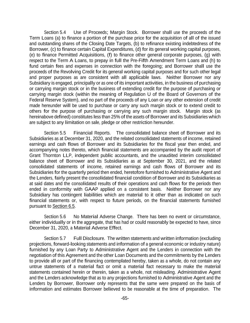 -65- Section 5.4 Use of Proceeds; Margin Stock. Borrower shall use the proceeds of the Term Loans (a) to finance a portion of the purchase price for the acquisition of all of the issued and outstanding shares of the Closing Date Targets, (b) to refinance existing indebtedness of the Borrower, (c) to finance certain Capital Expenditures, (d) for its general working capital purposes, (e) to finance Permitted Acquisitions, (f) to finance other general corporate purposes, (g) with respect to the Term A Loans, to prepay in full the Pre-Fifth Amendment Term Loans and (h) to fund certain fees and expenses in connection with the foregoing; and Borrower shall use the proceeds of the Revolving Credit for its general working capital purposes and for such other legal and proper purposes as are consistent with all applicable laws. Neither Borrower nor any Subsidiary is engaged, principally or as one of its important activities, in the business of purchasing or carrying margin stock or in the business of extending credit for the purpose of purchasing or carrying margin stock (within the meaning of Regulation U of the Board of Governors of the Federal Reserve System), and no part of the proceeds of any Loan or any other extension of credit made hereunder will be used to purchase or carry any such margin stock or to extend credit to others for the purpose of purchasing or carrying any such margin stock. Margin stock (as hereinabove defined) constitutes less than 25% of the assets of Borrower and its Subsidiaries which are subject to any limitation on sale, pledge or other restriction hereunder. Section 5.5 Financial Reports. The consolidated balance sheet of Borrower and its Subsidiaries as at December 31, 2020, and the related consolidated statements of income, retained earnings and cash flows of Borrower and its Subsidiaries for the fiscal year then ended, and accompanying notes thereto, which financial statements are accompanied by the audit report of Grant Thornton LLP, independent public accountants, and the unaudited interim consolidated balance sheet of Borrower and its Subsidiaries as at September 30, 2021, and the related consolidated statements of income, retained earnings and cash flows of Borrower and its Subsidiaries for the quarterly period then ended, heretofore furnished to Administrative Agent and the Lenders, fairly present the consolidated financial condition of Borrower and its Subsidiaries as at said dates and the consolidated results of their operations and cash flows for the periods then ended in conformity with GAAP applied on a consistent basis. Neither Borrower nor any Subsidiary has contingent liabilities which are material to it other than as indicated on such financial statements or, with respect to future periods, on the financial statements furnished pursuant to Section 6.5. Section 5.6 No Material Adverse Change. There has been no event or circumstance, either individually or in the aggregate, that has had or could reasonably be expected to have, since December 31, 2020, a Material Adverse Effect. Section 5.7 Full Disclosure. The written statements and written information (excluding projections, forward-looking statements and information of a general economic or industry nature) furnished by any Loan Party to Administrative Agent and the Lenders in connection with the negotiation of this Agreement and the other Loan Documents and the commitments by the Lenders to provide all or part of the financing contemplated hereby, taken as a whole, do not contain any untrue statements of a material fact or omit a material fact necessary to make the material statements contained herein or therein, taken as a whole, not misleading. Administrative Agent and the Lenders acknowledge that as to any projections furnished to Administrative Agent and the Lenders by Borrower, Borrower only represents that the same were prepared on the basis of information and estimates Borrower believed to be reasonable at the time of preparation. The