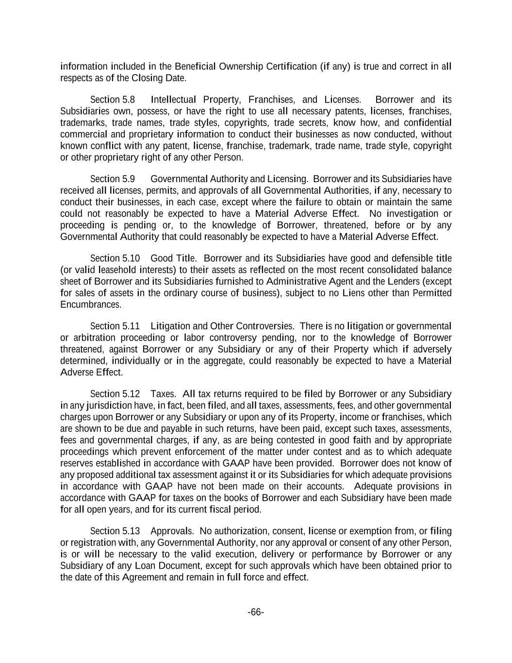 -66- information included in the Beneficial Ownership Certification (if any) is true and correct in all respects as of the Closing Date. Section 5.8 Intellectual Property, Franchises, and Licenses. Borrower and its Subsidiaries own, possess, or have the right to use all necessary patents, licenses, franchises, trademarks, trade names, trade styles, copyrights, trade secrets, know how, and confidential commercial and proprietary information to conduct their businesses as now conducted, without known conflict with any patent, license, franchise, trademark, trade name, trade style, copyright or other proprietary right of any other Person. Section 5.9 Governmental Authority and Licensing. Borrower and its Subsidiaries have received all licenses, permits, and approvals of all Governmental Authorities, if any, necessary to conduct their businesses, in each case, except where the failure to obtain or maintain the same could not reasonably be expected to have a Material Adverse Effect. No investigation or proceeding is pending or, to the knowledge of Borrower, threatened, before or by any Governmental Authority that could reasonably be expected to have a Material Adverse Effect. Section 5.10 Good Title. Borrower and its Subsidiaries have good and defensible title (or valid leasehold interests) to their assets as reflected on the most recent consolidated balance sheet of Borrower and its Subsidiaries furnished to Administrative Agent and the Lenders (except for sales of assets in the ordinary course of business), subject to no Liens other than Permitted Encumbrances. Section 5.11 Litigation and Other Controversies. There is no litigation or governmental or arbitration proceeding or labor controversy pending, nor to the knowledge of Borrower threatened, against Borrower or any Subsidiary or any of their Property which if adversely determined, individually or in the aggregate, could reasonably be expected to have a Material Adverse Effect. Section 5.12 Taxes. All tax returns required to be filed by Borrower or any Subsidiary in any jurisdiction have, in fact, been filed, and all taxes, assessments, fees, and other governmental charges upon Borrower or any Subsidiary or upon any of its Property, income or franchises, which are shown to be due and payable in such returns, have been paid, except such taxes, assessments, fees and governmental charges, if any, as are being contested in good faith and by appropriate proceedings which prevent enforcement of the matter under contest and as to which adequate reserves established in accordance with GAAP have been provided. Borrower does not know of any proposed additional tax assessment against it or its Subsidiaries for which adequate provisions in accordance with GAAP have not been made on their accounts. Adequate provisions in accordance with GAAP for taxes on the books of Borrower and each Subsidiary have been made for all open years, and for its current fiscal period. Section 5.13 Approvals. No authorization, consent, license or exemption from, or filing or registration with, any Governmental Authority, nor any approval or consent of any other Person, is or will be necessary to the valid execution, delivery or performance by Borrower or any Subsidiary of any Loan Document, except for such approvals which have been obtained prior to the date of this Agreement and remain in full force and effect.