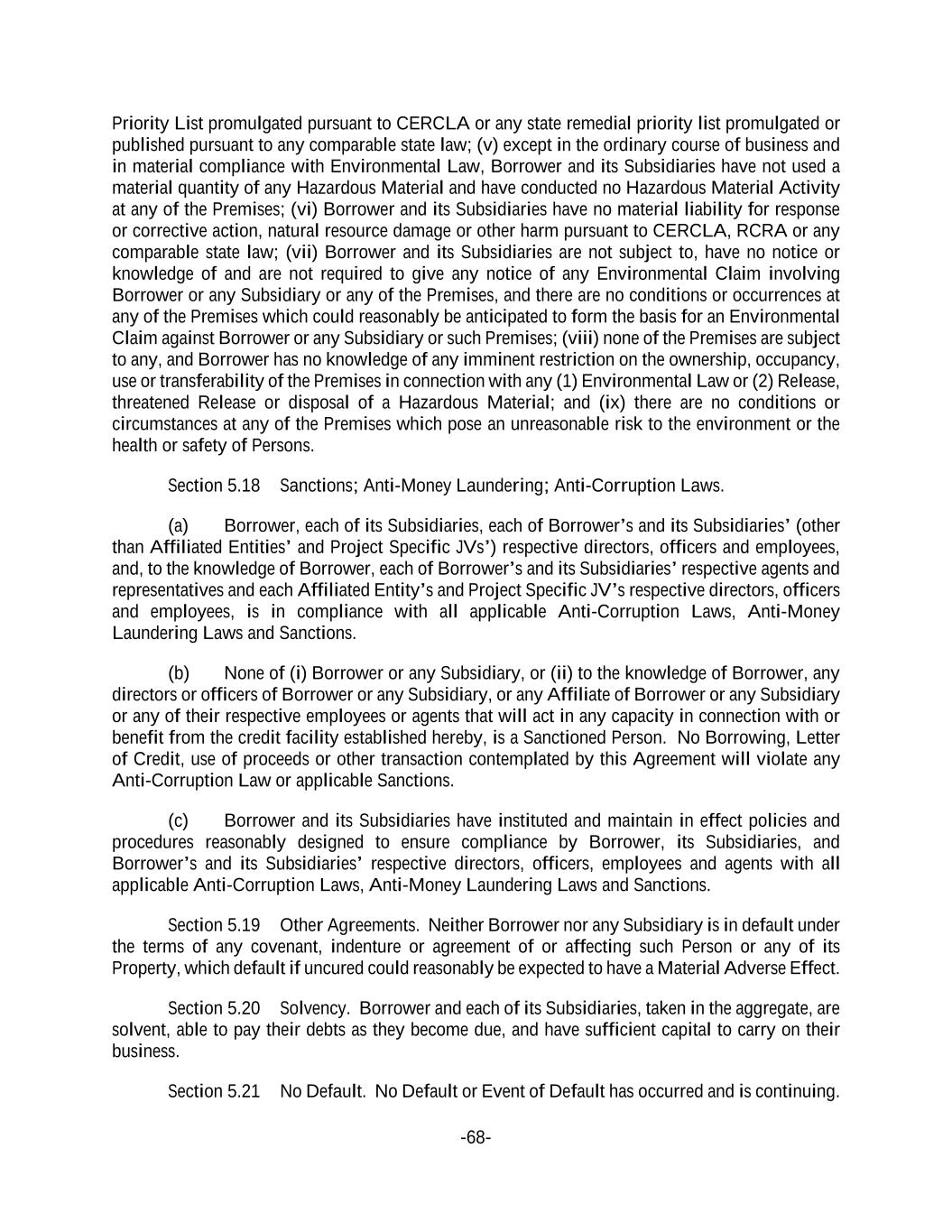 -68- Priority List promulgated pursuant to CERCLA or any state remedial priority list promulgated or published pursuant to any comparable state law; (v) except in the ordinary course of business and in material compliance with Environmental Law, Borrower and its Subsidiaries have not used a material quantity of any Hazardous Material and have conducted no Hazardous Material Activity at any of the Premises; (vi) Borrower and its Subsidiaries have no material liability for response or corrective action, natural resource damage or other harm pursuant to CERCLA, RCRA or any comparable state law; (vii) Borrower and its Subsidiaries are not subject to, have no notice or knowledge of and are not required to give any notice of any Environmental Claim involving Borrower or any Subsidiary or any of the Premises, and there are no conditions or occurrences at any of the Premises which could reasonably be anticipated to form the basis for an Environmental Claim against Borrower or any Subsidiary or such Premises; (viii) none of the Premises are subject to any, and Borrower has no knowledge of any imminent restriction on the ownership, occupancy, use or transferability of the Premises in connection with any (1) Environmental Law or (2) Release, threatened Release or disposal of a Hazardous Material; and (ix) there are no conditions or circumstances at any of the Premises which pose an unreasonable risk to the environment or the health or safety of Persons. Section 5.18 Sanctions; Anti-Money Laundering; Anti-Corruption Laws. (a) Borrower, each of its Subsidiaries, each of Borrower’s and its Subsidiaries’ (other than Affiliated Entities’ and Project Specific JVs’) respective directors, officers and employees, and, to the knowledge of Borrower, each of Borrower’s and its Subsidiaries’ respective agents and representatives and each Affiliated Entity’s and Project Specific JV’s respective directors, officers and employees, is in compliance with all applicable Anti-Corruption Laws, Anti-Money Laundering Laws and Sanctions. (b) None of (i) Borrower or any Subsidiary, or (ii) to the knowledge of Borrower, any directors or officers of Borrower or any Subsidiary, or any Affiliate of Borrower or any Subsidiary or any of their respective employees or agents that will act in any capacity in connection with or benefit from the credit facility established hereby, is a Sanctioned Person. No Borrowing, Letter of Credit, use of proceeds or other transaction contemplated by this Agreement will violate any Anti-Corruption Law or applicable Sanctions. (c) Borrower and its Subsidiaries have instituted and maintain in effect policies and procedures reasonably designed to ensure compliance by Borrower, its Subsidiaries, and Borrower’s and its Subsidiaries’ respective directors, officers, employees and agents with all applicable Anti-Corruption Laws, Anti-Money Laundering Laws and Sanctions. Section 5.19 Other Agreements. Neither Borrower nor any Subsidiary is in default under the terms of any covenant, indenture or agreement of or affecting such Person or any of its Property, which default if uncured could reasonably be expected to have a Material Adverse Effect. Section 5.20 Solvency. Borrower and each of its Subsidiaries, taken in the aggregate, are solvent, able to pay their debts as they become due, and have sufficient capital to carry on their business. Section 5.21 No Default. No Default or Event of Default has occurred and is continuing.
