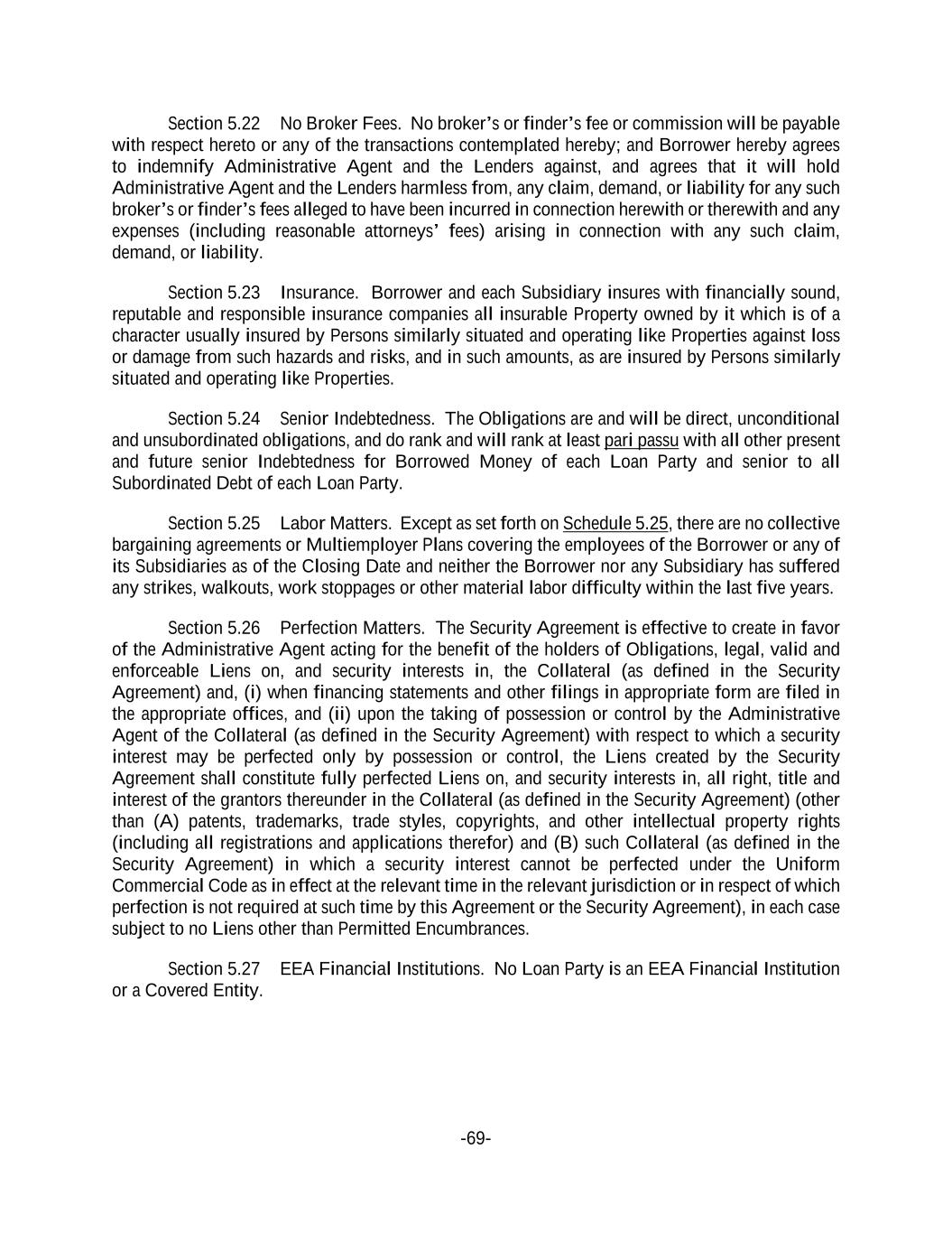 -69- Section 5.22 No Broker Fees. No broker’s or finder’s fee or commission will be payable with respect hereto or any of the transactions contemplated hereby; and Borrower hereby agrees to indemnify Administrative Agent and the Lenders against, and agrees that it will hold Administrative Agent and the Lenders harmless from, any claim, demand, or liability for any such broker’s or finder’s fees alleged to have been incurred in connection herewith or therewith and any expenses (including reasonable attorneys’ fees) arising in connection with any such claim, demand, or liability. Section 5.23 Insurance. Borrower and each Subsidiary insures with financially sound, reputable and responsible insurance companies all insurable Property owned by it which is of a character usually insured by Persons similarly situated and operating like Properties against loss or damage from such hazards and risks, and in such amounts, as are insured by Persons similarly situated and operating like Properties. Section 5.24 Senior Indebtedness. The Obligations are and will be direct, unconditional and unsubordinated obligations, and do rank and will rank at least pari passu with all other present and future senior Indebtedness for Borrowed Money of each Loan Party and senior to all Subordinated Debt of each Loan Party. Section 5.25 Labor Matters. Except as set forth on Schedule 5.25, there are no collective bargaining agreements or Multiemployer Plans covering the employees of the Borrower or any of its Subsidiaries as of the Closing Date and neither the Borrower nor any Subsidiary has suffered any strikes, walkouts, work stoppages or other material labor difficulty within the last five years. Section 5.26 Perfection Matters. The Security Agreement is effective to create in favor of the Administrative Agent acting for the benefit of the holders of Obligations, legal, valid and enforceable Liens on, and security interests in, the Collateral (as defined in the Security Agreement) and, (i) when financing statements and other filings in appropriate form are filed in the appropriate offices, and (ii) upon the taking of possession or control by the Administrative Agent of the Collateral (as defined in the Security Agreement) with respect to which a security interest may be perfected only by possession or control, the Liens created by the Security Agreement shall constitute fully perfected Liens on, and security interests in, all right, title and interest of the grantors thereunder in the Collateral (as defined in the Security Agreement) (other than (A) patents, trademarks, trade styles, copyrights, and other intellectual property rights (including all registrations and applications therefor) and (B) such Collateral (as defined in the Security Agreement) in which a security interest cannot be perfected under the Uniform Commercial Code as in effect at the relevant time in the relevant jurisdiction or in respect of which perfection is not required at such time by this Agreement or the Security Agreement), in each case subject to no Liens other than Permitted Encumbrances. Section 5.27 EEA Financial Institutions. No Loan Party is an EEA Financial Institution or a Covered Entity.
