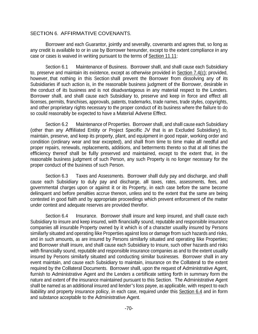 -70- SECTION 6. AFFIRMATIVE COVENANTS. Borrower and each Guarantor, jointly and severally, covenants and agrees that, so long as any credit is available to or in use by Borrower hereunder, except to the extent compliance in any case or cases is waived in writing pursuant to the terms of Section 11.11: Section 6.1 Maintenance of Business. Borrower shall, and shall cause each Subsidiary to, preserve and maintain its existence, except as otherwise provided in Section 7.4(c); provided, however, that nothing in this Section shall prevent the Borrower from dissolving any of its Subsidiaries if such action is, in the reasonable business judgment of the Borrower, desirable in the conduct of its business and is not disadvantageous in any material respect to the Lenders. Borrower shall, and shall cause each Subsidiary to, preserve and keep in force and effect all licenses, permits, franchises, approvals, patents, trademarks, trade names, trade styles, copyrights, and other proprietary rights necessary to the proper conduct of its business where the failure to do so could reasonably be expected to have a Material Adverse Effect. Section 6.2 Maintenance of Properties. Borrower shall, and shall cause each Subsidiary (other than any Affiliated Entity or Project Specific JV that is an Excluded Subsidiary) to, maintain, preserve, and keep its property, plant, and equipment in good repair, working order and condition (ordinary wear and tear excepted), and shall from time to time make all needful and proper repairs, renewals, replacements, additions, and betterments thereto so that at all times the efficiency thereof shall be fully preserved and maintained, except to the extent that, in the reasonable business judgment of such Person, any such Property is no longer necessary for the proper conduct of the business of such Person. Section 6.3 Taxes and Assessments. Borrower shall duly pay and discharge, and shall cause each Subsidiary to duly pay and discharge, all taxes, rates, assessments, fees, and governmental charges upon or against it or its Property, in each case before the same become delinquent and before penalties accrue thereon, unless and to the extent that the same are being contested in good faith and by appropriate proceedings which prevent enforcement of the matter under contest and adequate reserves are provided therefor. Section 6.4 Insurance. Borrower shall insure and keep insured, and shall cause each Subsidiary to insure and keep insured, with financially sound, reputable and responsible insurance companies all insurable Property owned by it which is of a character usually insured by Persons similarly situated and operating like Properties against loss or damage from such hazards and risks, and in such amounts, as are insured by Persons similarly situated and operating like Properties; and Borrower shall insure, and shall cause each Subsidiary to insure, such other hazards and risks with financially sound, reputable and responsible insurance companies as and to the extent usually insured by Persons similarly situated and conducting similar businesses. Borrower shall in any event maintain, and cause each Subsidiary to maintain, insurance on the Collateral to the extent required by the Collateral Documents. Borrower shall, upon the request of Administrative Agent, furnish to Administrative Agent and the Lenders a certificate setting forth in summary form the nature and extent of the insurance maintained pursuant to this Section. The Administrative Agent shall be named as an additional insured and lender’s loss payee, as applicable, with respect to each liability and property insurance policy, in each case, required under this Section 6.4 and in form and substance acceptable to the Administrative Agent.