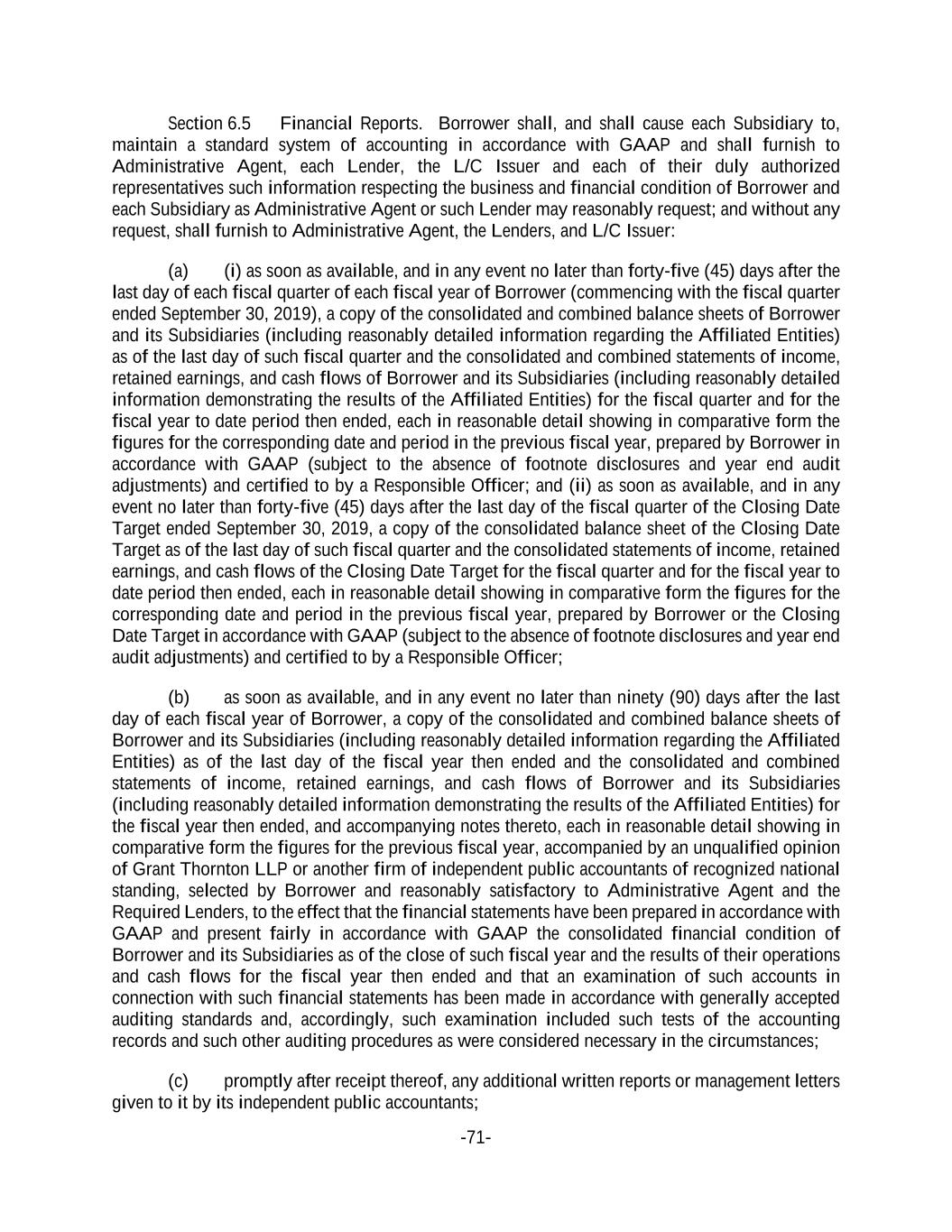 -71- Section 6.5 Financial Reports. Borrower shall, and shall cause each Subsidiary to, maintain a standard system of accounting in accordance with GAAP and shall furnish to Administrative Agent, each Lender, the L/C Issuer and each of their duly authorized representatives such information respecting the business and financial condition of Borrower and each Subsidiary as Administrative Agent or such Lender may reasonably request; and without any request, shall furnish to Administrative Agent, the Lenders, and L/C Issuer: (a) (i) as soon as available, and in any event no later than forty-five (45) days after the last day of each fiscal quarter of each fiscal year of Borrower (commencing with the fiscal quarter ended September 30, 2019), a copy of the consolidated and combined balance sheets of Borrower and its Subsidiaries (including reasonably detailed information regarding the Affiliated Entities) as of the last day of such fiscal quarter and the consolidated and combined statements of income, retained earnings, and cash flows of Borrower and its Subsidiaries (including reasonably detailed information demonstrating the results of the Affiliated Entities) for the fiscal quarter and for the fiscal year to date period then ended, each in reasonable detail showing in comparative form the figures for the corresponding date and period in the previous fiscal year, prepared by Borrower in accordance with GAAP (subject to the absence of footnote disclosures and year end audit adjustments) and certified to by a Responsible Officer; and (ii) as soon as available, and in any event no later than forty-five (45) days after the last day of the fiscal quarter of the Closing Date Target ended September 30, 2019, a copy of the consolidated balance sheet of the Closing Date Target as of the last day of such fiscal quarter and the consolidated statements of income, retained earnings, and cash flows of the Closing Date Target for the fiscal quarter and for the fiscal year to date period then ended, each in reasonable detail showing in comparative form the figures for the corresponding date and period in the previous fiscal year, prepared by Borrower or the Closing Date Target in accordance with GAAP (subject to the absence of footnote disclosures and year end audit adjustments) and certified to by a Responsible Officer; (b) as soon as available, and in any event no later than ninety (90) days after the last day of each fiscal year of Borrower, a copy of the consolidated and combined balance sheets of Borrower and its Subsidiaries (including reasonably detailed information regarding the Affiliated Entities) as of the last day of the fiscal year then ended and the consolidated and combined statements of income, retained earnings, and cash flows of Borrower and its Subsidiaries (including reasonably detailed information demonstrating the results of the Affiliated Entities) for the fiscal year then ended, and accompanying notes thereto, each in reasonable detail showing in comparative form the figures for the previous fiscal year, accompanied by an unqualified opinion of Grant Thornton LLP or another firm of independent public accountants of recognized national standing, selected by Borrower and reasonably satisfactory to Administrative Agent and the Required Lenders, to the effect that the financial statements have been prepared in accordance with GAAP and present fairly in accordance with GAAP the consolidated financial condition of Borrower and its Subsidiaries as of the close of such fiscal year and the results of their operations and cash flows for the fiscal year then ended and that an examination of such accounts in connection with such financial statements has been made in accordance with generally accepted auditing standards and, accordingly, such examination included such tests of the accounting records and such other auditing procedures as were considered necessary in the circumstances; (c) promptly after receipt thereof, any additional written reports or management letters given to it by its independent public accountants;
