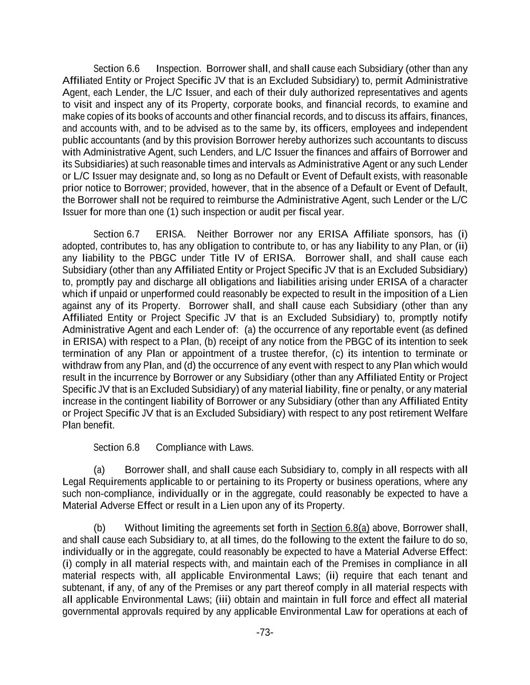 -73- Section 6.6 Inspection. Borrower shall, and shall cause each Subsidiary (other than any Affiliated Entity or Project Specific JV that is an Excluded Subsidiary) to, permit Administrative Agent, each Lender, the L/C Issuer, and each of their duly authorized representatives and agents to visit and inspect any of its Property, corporate books, and financial records, to examine and make copies of its books of accounts and other financial records, and to discuss its affairs, finances, and accounts with, and to be advised as to the same by, its officers, employees and independent public accountants (and by this provision Borrower hereby authorizes such accountants to discuss with Administrative Agent, such Lenders, and L/C Issuer the finances and affairs of Borrower and its Subsidiaries) at such reasonable times and intervals as Administrative Agent or any such Lender or L/C Issuer may designate and, so long as no Default or Event of Default exists, with reasonable prior notice to Borrower; provided, however, that in the absence of a Default or Event of Default, the Borrower shall not be required to reimburse the Administrative Agent, such Lender or the L/C Issuer for more than one (1) such inspection or audit per fiscal year. Section 6.7 ERISA. Neither Borrower nor any ERISA Affiliate sponsors, has (i) adopted, contributes to, has any obligation to contribute to, or has any liability to any Plan, or (ii) any liability to the PBGC under Title IV of ERISA. Borrower shall, and shall cause each Subsidiary (other than any Affiliated Entity or Project Specific JV that is an Excluded Subsidiary) to, promptly pay and discharge all obligations and liabilities arising under ERISA of a character which if unpaid or unperformed could reasonably be expected to result in the imposition of a Lien against any of its Property. Borrower shall, and shall cause each Subsidiary (other than any Affiliated Entity or Project Specific JV that is an Excluded Subsidiary) to, promptly notify Administrative Agent and each Lender of: (a) the occurrence of any reportable event (as defined in ERISA) with respect to a Plan, (b) receipt of any notice from the PBGC of its intention to seek termination of any Plan or appointment of a trustee therefor, (c) its intention to terminate or withdraw from any Plan, and (d) the occurrence of any event with respect to any Plan which would result in the incurrence by Borrower or any Subsidiary (other than any Affiliated Entity or Project Specific JV that is an Excluded Subsidiary) of any material liability, fine or penalty, or any material increase in the contingent liability of Borrower or any Subsidiary (other than any Affiliated Entity or Project Specific JV that is an Excluded Subsidiary) with respect to any post retirement Welfare Plan benefit. Section 6.8 Compliance with Laws. (a) Borrower shall, and shall cause each Subsidiary to, comply in all respects with all Legal Requirements applicable to or pertaining to its Property or business operations, where any such non-compliance, individually or in the aggregate, could reasonably be expected to have a Material Adverse Effect or result in a Lien upon any of its Property. (b) Without limiting the agreements set forth in Section 6.8(a) above, Borrower shall, and shall cause each Subsidiary to, at all times, do the following to the extent the failure to do so, individually or in the aggregate, could reasonably be expected to have a Material Adverse Effect: (i) comply in all material respects with, and maintain each of the Premises in compliance in all material respects with, all applicable Environmental Laws; (ii) require that each tenant and subtenant, if any, of any of the Premises or any part thereof comply in all material respects with all applicable Environmental Laws; (iii) obtain and maintain in full force and effect all material governmental approvals required by any applicable Environmental Law for operations at each of