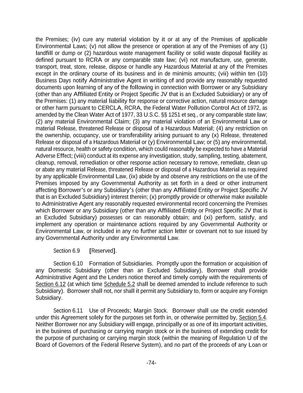 -74- the Premises; (iv) cure any material violation by it or at any of the Premises of applicable Environmental Laws; (v) not allow the presence or operation at any of the Premises of any (1) landfill or dump or (2) hazardous waste management facility or solid waste disposal facility as defined pursuant to RCRA or any comparable state law; (vi) not manufacture, use, generate, transport, treat, store, release, dispose or handle any Hazardous Material at any of the Premises except in the ordinary course of its business and in de minimis amounts; (vii) within ten (10) Business Days notify Administrative Agent in writing of and provide any reasonably requested documents upon learning of any of the following in connection with Borrower or any Subsidiary (other than any Affiliated Entity or Project Specific JV that is an Excluded Subsidiary) or any of the Premises: (1) any material liability for response or corrective action, natural resource damage or other harm pursuant to CERCLA, RCRA, the Federal Water Pollution Control Act of 1972, as amended by the Clean Water Act of 1977, 33 U.S.C. §§ 1251 et seq., or any comparable state law; (2) any material Environmental Claim; (3) any material violation of an Environmental Law or material Release, threatened Release or disposal of a Hazardous Material; (4) any restriction on the ownership, occupancy, use or transferability arising pursuant to any (x) Release, threatened Release or disposal of a Hazardous Material or (y) Environmental Law; or (5) any environmental, natural resource, health or safety condition, which could reasonably be expected to have a Material Adverse Effect; (viii) conduct at its expense any investigation, study, sampling, testing, abatement, cleanup, removal, remediation or other response action necessary to remove, remediate, clean up or abate any material Release, threatened Release or disposal of a Hazardous Material as required by any applicable Environmental Law, (ix) abide by and observe any restrictions on the use of the Premises imposed by any Governmental Authority as set forth in a deed or other instrument affecting Borrower’s or any Subsidiary’s (other than any Affiliated Entity or Project Specific JV that is an Excluded Subsidiary) interest therein; (x) promptly provide or otherwise make available to Administrative Agent any reasonably requested environmental record concerning the Premises which Borrower or any Subsidiary (other than any Affiliated Entity or Project Specific JV that is an Excluded Subsidiary) possesses or can reasonably obtain; and (xi) perform, satisfy, and implement any operation or maintenance actions required by any Governmental Authority or Environmental Law, or included in any no further action letter or covenant not to sue issued by any Governmental Authority under any Environmental Law. Section 6.9 [Reserved]. Section 6.10 Formation of Subsidiaries. Promptly upon the formation or acquisition of any Domestic Subsidiary (other than an Excluded Subsidiary), Borrower shall provide Administrative Agent and the Lenders notice thereof and timely comply with the requirements of Section 6.12 (at which time Schedule 5.2 shall be deemed amended to include reference to such Subsidiary). Borrower shall not, nor shall it permit any Subsidiary to, form or acquire any Foreign Subsidiary. Section 6.11 Use of Proceeds; Margin Stock. Borrower shall use the credit extended under this Agreement solely for the purposes set forth in, or otherwise permitted by, Section 5.4. Neither Borrower nor any Subsidiary will engage, principally or as one of its important activities, in the business of purchasing or carrying margin stock or in the business of extending credit for the purpose of purchasing or carrying margin stock (within the meaning of Regulation U of the Board of Governors of the Federal Reserve System), and no part of the proceeds of any Loan or
