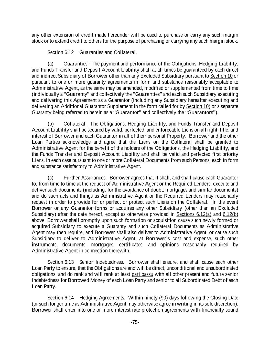 -75- any other extension of credit made hereunder will be used to purchase or carry any such margin stock or to extend credit to others for the purpose of purchasing or carrying any such margin stock. Section 6.12 Guaranties and Collateral. (a) Guaranties. The payment and performance of the Obligations, Hedging Liability, and Funds Transfer and Deposit Account Liability shall at all times be guaranteed by each direct and indirect Subsidiary of Borrower other than any Excluded Subsidiary pursuant to Section 10 or pursuant to one or more guaranty agreements in form and substance reasonably acceptable to Administrative Agent, as the same may be amended, modified or supplemented from time to time (individually a “Guaranty” and collectively the “Guaranties” and each such Subsidiary executing and delivering this Agreement as a Guarantor (including any Subsidiary hereafter executing and delivering an Additional Guarantor Supplement in the form called for by Section 10) or a separate Guaranty being referred to herein as a “Guarantor” and collectively the “Guarantors”). (b) Collateral. The Obligations, Hedging Liability, and Funds Transfer and Deposit Account Liability shall be secured by valid, perfected, and enforceable Liens on all right, title, and interest of Borrower and each Guarantor in all of their personal Property. Borrower and the other Loan Parties acknowledge and agree that the Liens on the Collateral shall be granted to Administrative Agent for the benefit of the holders of the Obligations, the Hedging Liability, and the Funds Transfer and Deposit Account Liability and shall be valid and perfected first priority Liens, in each case pursuant to one or more Collateral Documents from such Persons, each in form and substance satisfactory to Administrative Agent. (c) Further Assurances. Borrower agrees that it shall, and shall cause each Guarantor to, from time to time at the request of Administrative Agent or the Required Lenders, execute and deliver such documents (including, for the avoidance of doubt, mortgages and similar documents) and do such acts and things as Administrative Agent or the Required Lenders may reasonably request in order to provide for or perfect or protect such Liens on the Collateral. In the event Borrower or any Guarantor forms or acquires any other Subsidiary (other than an Excluded Subsidiary) after the date hereof, except as otherwise provided in Sections 6.12(a) and 6.12(b) above, Borrower shall promptly upon such formation or acquisition cause such newly formed or acquired Subsidiary to execute a Guaranty and such Collateral Documents as Administrative Agent may then require, and Borrower shall also deliver to Administrative Agent, or cause such Subsidiary to deliver to Administrative Agent, at Borrower’s cost and expense, such other instruments, documents, mortgages, certificates, and opinions reasonably required by Administrative Agent in connection therewith. Section 6.13 Senior Indebtedness. Borrower shall ensure, and shall cause each other Loan Party to ensure, that the Obligations are and will be direct, unconditional and unsubordinated obligations, and do rank and will rank at least pari passu with all other present and future senior Indebtedness for Borrowed Money of each Loan Party and senior to all Subordinated Debt of each Loan Party. Section 6.14 Hedging Agreements. Within ninety (90) days following the Closing Date (or such longer time as Administrative Agent may otherwise agree in writing in its sole discretion), Borrower shall enter into one or more interest rate protection agreements with financially sound