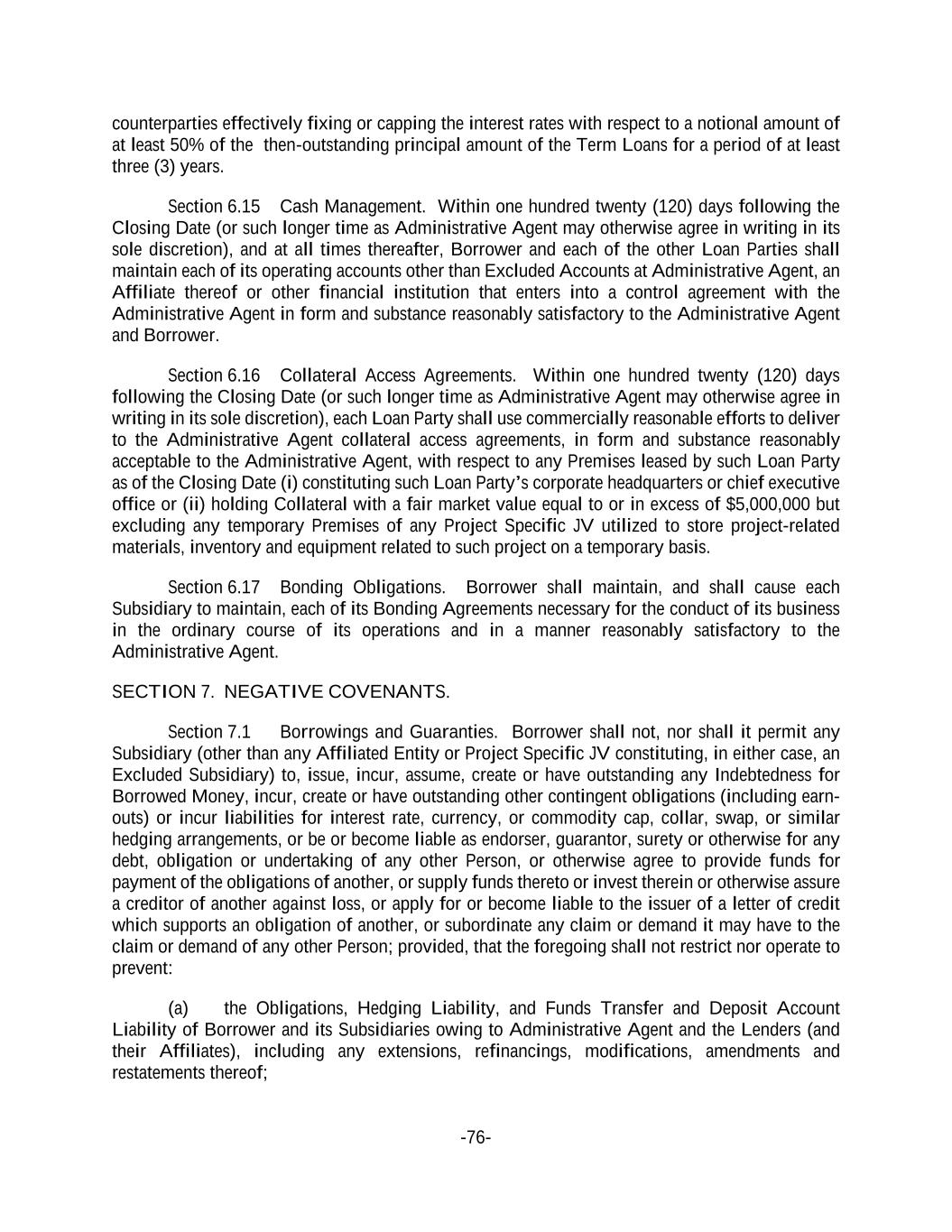-76- counterparties effectively fixing or capping the interest rates with respect to a notional amount of at least 50% of the then-outstanding principal amount of the Term Loans for a period of at least three (3) years. Section 6.15 Cash Management. Within one hundred twenty (120) days following the Closing Date (or such longer time as Administrative Agent may otherwise agree in writing in its sole discretion), and at all times thereafter, Borrower and each of the other Loan Parties shall maintain each of its operating accounts other than Excluded Accounts at Administrative Agent, an Affiliate thereof or other financial institution that enters into a control agreement with the Administrative Agent in form and substance reasonably satisfactory to the Administrative Agent and Borrower. Section 6.16 Collateral Access Agreements. Within one hundred twenty (120) days following the Closing Date (or such longer time as Administrative Agent may otherwise agree in writing in its sole discretion), each Loan Party shall use commercially reasonable efforts to deliver to the Administrative Agent collateral access agreements, in form and substance reasonably acceptable to the Administrative Agent, with respect to any Premises leased by such Loan Party as of the Closing Date (i) constituting such Loan Party’s corporate headquarters or chief executive office or (ii) holding Collateral with a fair market value equal to or in excess of $5,000,000 but excluding any temporary Premises of any Project Specific JV utilized to store project-related materials, inventory and equipment related to such project on a temporary basis. Section 6.17 Bonding Obligations. Borrower shall maintain, and shall cause each Subsidiary to maintain, each of its Bonding Agreements necessary for the conduct of its business in the ordinary course of its operations and in a manner reasonably satisfactory to the Administrative Agent. SECTION 7. NEGATIVE COVENANTS. Section 7.1 Borrowings and Guaranties. Borrower shall not, nor shall it permit any Subsidiary (other than any Affiliated Entity or Project Specific JV constituting, in either case, an Excluded Subsidiary) to, issue, incur, assume, create or have outstanding any Indebtedness for Borrowed Money, incur, create or have outstanding other contingent obligations (including earn- outs) or incur liabilities for interest rate, currency, or commodity cap, collar, swap, or similar hedging arrangements, or be or become liable as endorser, guarantor, surety or otherwise for any debt, obligation or undertaking of any other Person, or otherwise agree to provide funds for payment of the obligations of another, or supply funds thereto or invest therein or otherwise assure a creditor of another against loss, or apply for or become liable to the issuer of a letter of credit which supports an obligation of another, or subordinate any claim or demand it may have to the claim or demand of any other Person; provided, that the foregoing shall not restrict nor operate to prevent: (a) the Obligations, Hedging Liability, and Funds Transfer and Deposit Account Liability of Borrower and its Subsidiaries owing to Administrative Agent and the Lenders (and their Affiliates), including any extensions, refinancings, modifications, amendments and restatements thereof;