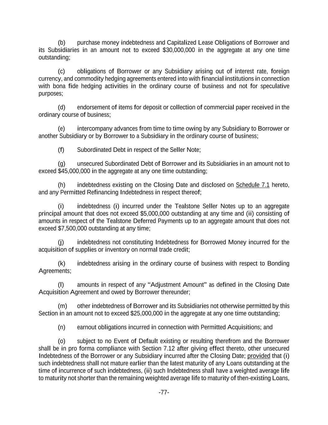 -77- (b) purchase money indebtedness and Capitalized Lease Obligations of Borrower and its Subsidiaries in an amount not to exceed $30,000,000 in the aggregate at any one time outstanding; (c) obligations of Borrower or any Subsidiary arising out of interest rate, foreign currency, and commodity hedging agreements entered into with financial institutions in connection with bona fide hedging activities in the ordinary course of business and not for speculative purposes; (d) endorsement of items for deposit or collection of commercial paper received in the ordinary course of business; (e) intercompany advances from time to time owing by any Subsidiary to Borrower or another Subsidiary or by Borrower to a Subsidiary in the ordinary course of business; (f) Subordinated Debt in respect of the Seller Note; (g) unsecured Subordinated Debt of Borrower and its Subsidiaries in an amount not to exceed $45,000,000 in the aggregate at any one time outstanding; (h) indebtedness existing on the Closing Date and disclosed on Schedule 7.1 hereto, and any Permitted Refinancing Indebtedness in respect thereof; (i) indebtedness (i) incurred under the Tealstone Seller Notes up to an aggregate principal amount that does not exceed $5,000,000 outstanding at any time and (ii) consisting of amounts in respect of the Tealstone Deferred Payments up to an aggregate amount that does not exceed $7,500,000 outstanding at any time; (j) indebtedness not constituting Indebtedness for Borrowed Money incurred for the acquisition of supplies or inventory on normal trade credit; (k) indebtedness arising in the ordinary course of business with respect to Bonding Agreements; (l) amounts in respect of any “Adjustment Amount” as defined in the Closing Date Acquisition Agreement and owed by Borrower thereunder; (m) other indebtedness of Borrower and its Subsidiaries not otherwise permitted by this Section in an amount not to exceed $25,000,000 in the aggregate at any one time outstanding; (n) earnout obligations incurred in connection with Permitted Acquisitions; and (o) subject to no Event of Default existing or resulting therefrom and the Borrower shall be in pro forma compliance with Section 7.12 after giving effect thereto, other unsecured Indebtedness of the Borrower or any Subsidiary incurred after the Closing Date; provided that (i) such indebtedness shall not mature earlier than the latest maturity of any Loans outstanding at the time of incurrence of such indebtedness, (ii) such Indebtedness shall have a weighted average life to maturity not shorter than the remaining weighted average life to maturity of then-existing Loans,