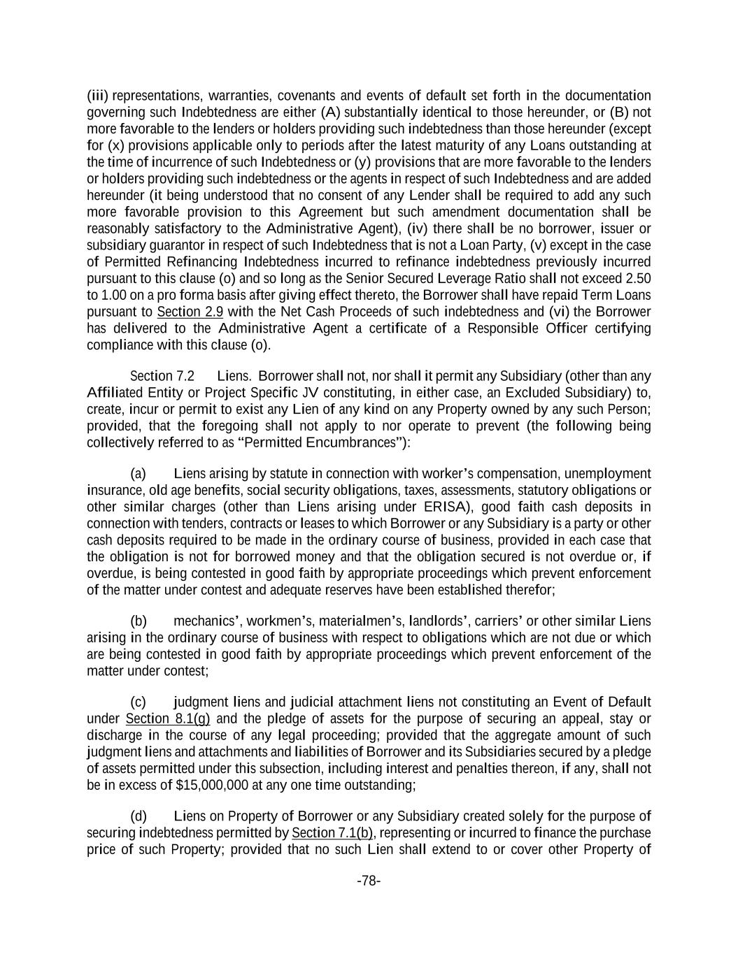 -78- (iii) representations, warranties, covenants and events of default set forth in the documentation governing such Indebtedness are either (A) substantially identical to those hereunder, or (B) not more favorable to the lenders or holders providing such indebtedness than those hereunder (except for (x) provisions applicable only to periods after the latest maturity of any Loans outstanding at the time of incurrence of such Indebtedness or (y) provisions that are more favorable to the lenders or holders providing such indebtedness or the agents in respect of such Indebtedness and are added hereunder (it being understood that no consent of any Lender shall be required to add any such more favorable provision to this Agreement but such amendment documentation shall be reasonably satisfactory to the Administrative Agent), (iv) there shall be no borrower, issuer or subsidiary guarantor in respect of such Indebtedness that is not a Loan Party, (v) except in the case of Permitted Refinancing Indebtedness incurred to refinance indebtedness previously incurred pursuant to this clause (o) and so long as the Senior Secured Leverage Ratio shall not exceed 2.50 to 1.00 on a pro forma basis after giving effect thereto, the Borrower shall have repaid Term Loans pursuant to Section 2.9 with the Net Cash Proceeds of such indebtedness and (vi) the Borrower has delivered to the Administrative Agent a certificate of a Responsible Officer certifying compliance with this clause (o). Section 7.2 Liens. Borrower shall not, nor shall it permit any Subsidiary (other than any Affiliated Entity or Project Specific JV constituting, in either case, an Excluded Subsidiary) to, create, incur or permit to exist any Lien of any kind on any Property owned by any such Person; provided, that the foregoing shall not apply to nor operate to prevent (the following being collectively referred to as “Permitted Encumbrances”): (a) Liens arising by statute in connection with worker’s compensation, unemployment insurance, old age benefits, social security obligations, taxes, assessments, statutory obligations or other similar charges (other than Liens arising under ERISA), good faith cash deposits in connection with tenders, contracts or leases to which Borrower or any Subsidiary is a party or other cash deposits required to be made in the ordinary course of business, provided in each case that the obligation is not for borrowed money and that the obligation secured is not overdue or, if overdue, is being contested in good faith by appropriate proceedings which prevent enforcement of the matter under contest and adequate reserves have been established therefor; (b) mechanics’, workmen’s, materialmen’s, landlords’, carriers’ or other similar Liens arising in the ordinary course of business with respect to obligations which are not due or which are being contested in good faith by appropriate proceedings which prevent enforcement of the matter under contest; (c) judgment liens and judicial attachment liens not constituting an Event of Default under Section 8.1(g) and the pledge of assets for the purpose of securing an appeal, stay or discharge in the course of any legal proceeding; provided that the aggregate amount of such judgment liens and attachments and liabilities of Borrower and its Subsidiaries secured by a pledge of assets permitted under this subsection, including interest and penalties thereon, if any, shall not be in excess of $15,000,000 at any one time outstanding; (d) Liens on Property of Borrower or any Subsidiary created solely for the purpose of securing indebtedness permitted by Section 7.1(b), representing or incurred to finance the purchase price of such Property; provided that no such Lien shall extend to or cover other Property of
