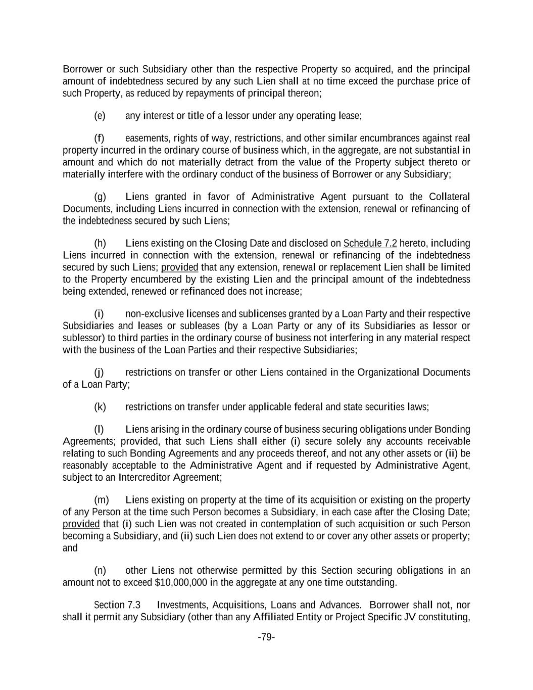 -79- Borrower or such Subsidiary other than the respective Property so acquired, and the principal amount of indebtedness secured by any such Lien shall at no time exceed the purchase price of such Property, as reduced by repayments of principal thereon; (e) any interest or title of a lessor under any operating lease; (f) easements, rights of way, restrictions, and other similar encumbrances against real property incurred in the ordinary course of business which, in the aggregate, are not substantial in amount and which do not materially detract from the value of the Property subject thereto or materially interfere with the ordinary conduct of the business of Borrower or any Subsidiary; (g) Liens granted in favor of Administrative Agent pursuant to the Collateral Documents, including Liens incurred in connection with the extension, renewal or refinancing of the indebtedness secured by such Liens; (h) Liens existing on the Closing Date and disclosed on Schedule 7.2 hereto, including Liens incurred in connection with the extension, renewal or refinancing of the indebtedness secured by such Liens; provided that any extension, renewal or replacement Lien shall be limited to the Property encumbered by the existing Lien and the principal amount of the indebtedness being extended, renewed or refinanced does not increase; (i) non-exclusive licenses and sublicenses granted by a Loan Party and their respective Subsidiaries and leases or subleases (by a Loan Party or any of its Subsidiaries as lessor or sublessor) to third parties in the ordinary course of business not interfering in any material respect with the business of the Loan Parties and their respective Subsidiaries; (j) restrictions on transfer or other Liens contained in the Organizational Documents of a Loan Party; (k) restrictions on transfer under applicable federal and state securities laws; (l) Liens arising in the ordinary course of business securing obligations under Bonding Agreements; provided, that such Liens shall either (i) secure solely any accounts receivable relating to such Bonding Agreements and any proceeds thereof, and not any other assets or (ii) be reasonably acceptable to the Administrative Agent and if requested by Administrative Agent, subject to an Intercreditor Agreement; (m) Liens existing on property at the time of its acquisition or existing on the property of any Person at the time such Person becomes a Subsidiary, in each case after the Closing Date; provided that (i) such Lien was not created in contemplation of such acquisition or such Person becoming a Subsidiary, and (ii) such Lien does not extend to or cover any other assets or property; and (n) other Liens not otherwise permitted by this Section securing obligations in an amount not to exceed $10,000,000 in the aggregate at any one time outstanding. Section 7.3 Investments, Acquisitions, Loans and Advances. Borrower shall not, nor shall it permit any Subsidiary (other than any Affiliated Entity or Project Specific JV constituting,