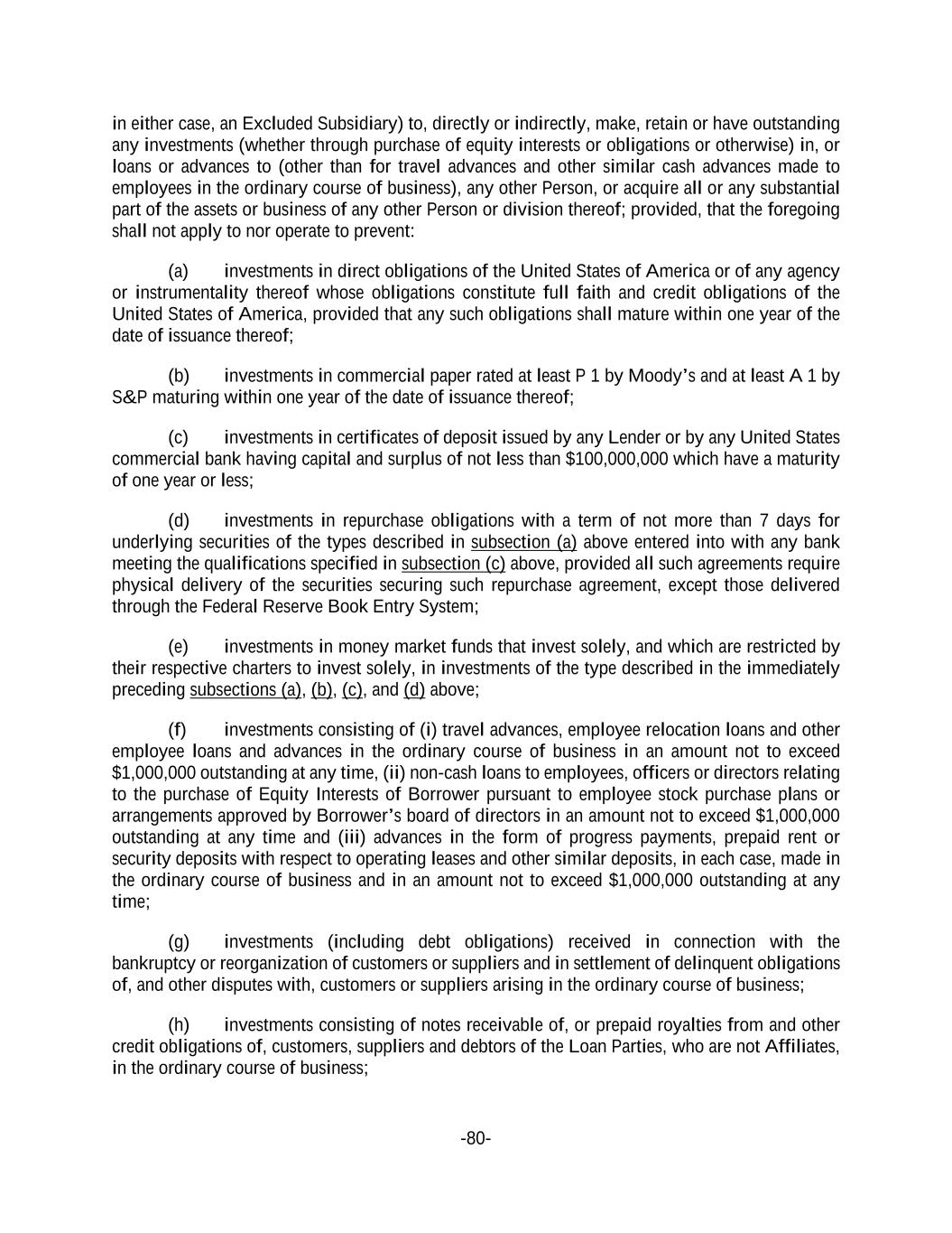 -80- in either case, an Excluded Subsidiary) to, directly or indirectly, make, retain or have outstanding any investments (whether through purchase of equity interests or obligations or otherwise) in, or loans or advances to (other than for travel advances and other similar cash advances made to employees in the ordinary course of business), any other Person, or acquire all or any substantial part of the assets or business of any other Person or division thereof; provided, that the foregoing shall not apply to nor operate to prevent: (a) investments in direct obligations of the United States of America or of any agency or instrumentality thereof whose obligations constitute full faith and credit obligations of the United States of America, provided that any such obligations shall mature within one year of the date of issuance thereof; (b) investments in commercial paper rated at least P 1 by Moody’s and at least A 1 by S&P maturing within one year of the date of issuance thereof; (c) investments in certificates of deposit issued by any Lender or by any United States commercial bank having capital and surplus of not less than $100,000,000 which have a maturity of one year or less; (d) investments in repurchase obligations with a term of not more than 7 days for underlying securities of the types described in subsection (a) above entered into with any bank meeting the qualifications specified in subsection (c) above, provided all such agreements require physical delivery of the securities securing such repurchase agreement, except those delivered through the Federal Reserve Book Entry System; (e) investments in money market funds that invest solely, and which are restricted by their respective charters to invest solely, in investments of the type described in the immediately preceding subsections (a), (b), (c), and (d) above; (f) investments consisting of (i) travel advances, employee relocation loans and other employee loans and advances in the ordinary course of business in an amount not to exceed $1,000,000 outstanding at any time, (ii) non-cash loans to employees, officers or directors relating to the purchase of Equity Interests of Borrower pursuant to employee stock purchase plans or arrangements approved by Borrower’s board of directors in an amount not to exceed $1,000,000 outstanding at any time and (iii) advances in the form of progress payments, prepaid rent or security deposits with respect to operating leases and other similar deposits, in each case, made in the ordinary course of business and in an amount not to exceed $1,000,000 outstanding at any time; (g) investments (including debt obligations) received in connection with the bankruptcy or reorganization of customers or suppliers and in settlement of delinquent obligations of, and other disputes with, customers or suppliers arising in the ordinary course of business; (h) investments consisting of notes receivable of, or prepaid royalties from and other credit obligations of, customers, suppliers and debtors of the Loan Parties, who are not Affiliates, in the ordinary course of business;