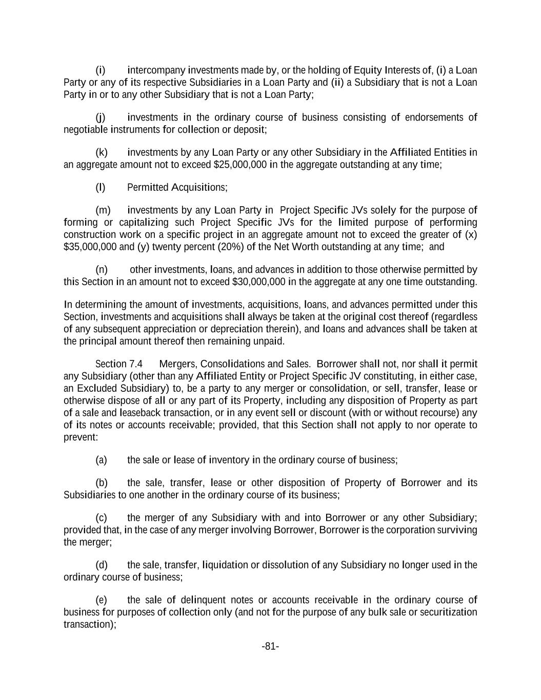 -81- (i) intercompany investments made by, or the holding of Equity Interests of, (i) a Loan Party or any of its respective Subsidiaries in a Loan Party and (ii) a Subsidiary that is not a Loan Party in or to any other Subsidiary that is not a Loan Party; (j) investments in the ordinary course of business consisting of endorsements of negotiable instruments for collection or deposit; (k) investments by any Loan Party or any other Subsidiary in the Affiliated Entities in an aggregate amount not to exceed $25,000,000 in the aggregate outstanding at any time; (l) Permitted Acquisitions; (m) investments by any Loan Party in Project Specific JVs solely for the purpose of forming or capitalizing such Project Specific JVs for the limited purpose of performing construction work on a specific project in an aggregate amount not to exceed the greater of (x) $35,000,000 and (y) twenty percent (20%) of the Net Worth outstanding at any time; and (n) other investments, loans, and advances in addition to those otherwise permitted by this Section in an amount not to exceed $30,000,000 in the aggregate at any one time outstanding. In determining the amount of investments, acquisitions, loans, and advances permitted under this Section, investments and acquisitions shall always be taken at the original cost thereof (regardless of any subsequent appreciation or depreciation therein), and loans and advances shall be taken at the principal amount thereof then remaining unpaid. Section 7.4 Mergers, Consolidations and Sales. Borrower shall not, nor shall it permit any Subsidiary (other than any Affiliated Entity or Project Specific JV constituting, in either case, an Excluded Subsidiary) to, be a party to any merger or consolidation, or sell, transfer, lease or otherwise dispose of all or any part of its Property, including any disposition of Property as part of a sale and leaseback transaction, or in any event sell or discount (with or without recourse) any of its notes or accounts receivable; provided, that this Section shall not apply to nor operate to prevent: (a) the sale or lease of inventory in the ordinary course of business; (b) the sale, transfer, lease or other disposition of Property of Borrower and its Subsidiaries to one another in the ordinary course of its business; (c) the merger of any Subsidiary with and into Borrower or any other Subsidiary; provided that, in the case of any merger involving Borrower, Borrower is the corporation surviving the merger; (d) the sale, transfer, liquidation or dissolution of any Subsidiary no longer used in the ordinary course of business; (e) the sale of delinquent notes or accounts receivable in the ordinary course of business for purposes of collection only (and not for the purpose of any bulk sale or securitization transaction);