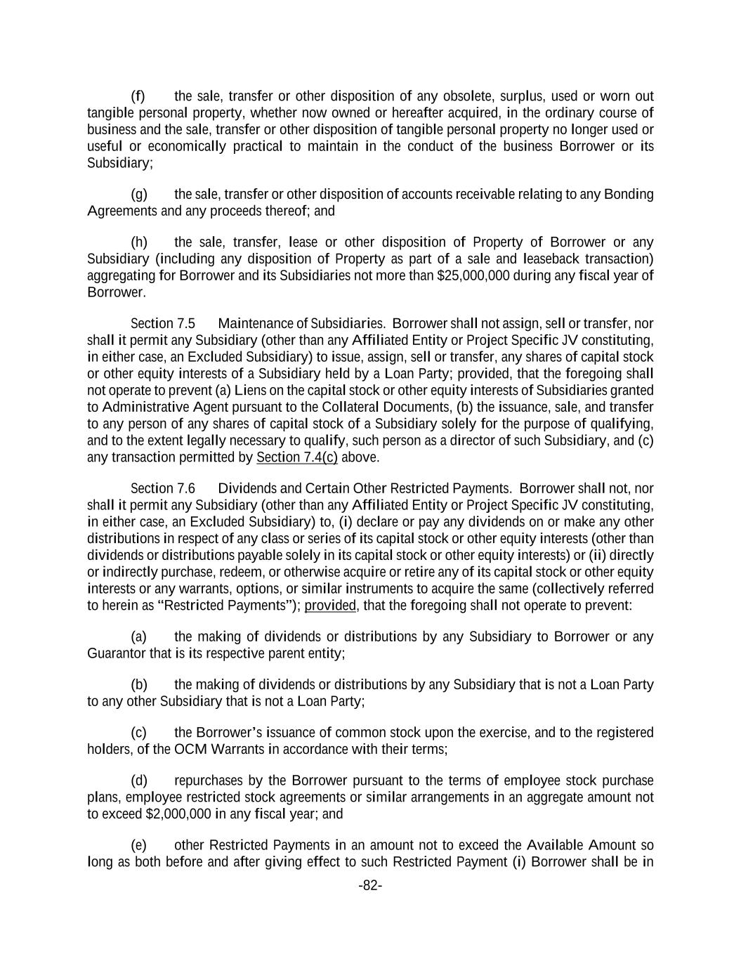 -82- (f) the sale, transfer or other disposition of any obsolete, surplus, used or worn out tangible personal property, whether now owned or hereafter acquired, in the ordinary course of business and the sale, transfer or other disposition of tangible personal property no longer used or useful or economically practical to maintain in the conduct of the business Borrower or its Subsidiary; (g) the sale, transfer or other disposition of accounts receivable relating to any Bonding Agreements and any proceeds thereof; and (h) the sale, transfer, lease or other disposition of Property of Borrower or any Subsidiary (including any disposition of Property as part of a sale and leaseback transaction) aggregating for Borrower and its Subsidiaries not more than $25,000,000 during any fiscal year of Borrower. Section 7.5 Maintenance of Subsidiaries. Borrower shall not assign, sell or transfer, nor shall it permit any Subsidiary (other than any Affiliated Entity or Project Specific JV constituting, in either case, an Excluded Subsidiary) to issue, assign, sell or transfer, any shares of capital stock or other equity interests of a Subsidiary held by a Loan Party; provided, that the foregoing shall not operate to prevent (a) Liens on the capital stock or other equity interests of Subsidiaries granted to Administrative Agent pursuant to the Collateral Documents, (b) the issuance, sale, and transfer to any person of any shares of capital stock of a Subsidiary solely for the purpose of qualifying, and to the extent legally necessary to qualify, such person as a director of such Subsidiary, and (c) any transaction permitted by Section 7.4(c) above. Section 7.6 Dividends and Certain Other Restricted Payments. Borrower shall not, nor shall it permit any Subsidiary (other than any Affiliated Entity or Project Specific JV constituting, in either case, an Excluded Subsidiary) to, (i) declare or pay any dividends on or make any other distributions in respect of any class or series of its capital stock or other equity interests (other than dividends or distributions payable solely in its capital stock or other equity interests) or (ii) directly or indirectly purchase, redeem, or otherwise acquire or retire any of its capital stock or other equity interests or any warrants, options, or similar instruments to acquire the same (collectively referred to herein as “Restricted Payments”); provided, that the foregoing shall not operate to prevent: (a) the making of dividends or distributions by any Subsidiary to Borrower or any Guarantor that is its respective parent entity; (b) the making of dividends or distributions by any Subsidiary that is not a Loan Party to any other Subsidiary that is not a Loan Party; (c) the Borrower’s issuance of common stock upon the exercise, and to the registered holders, of the OCM Warrants in accordance with their terms; (d) repurchases by the Borrower pursuant to the terms of employee stock purchase plans, employee restricted stock agreements or similar arrangements in an aggregate amount not to exceed $2,000,000 in any fiscal year; and (e) other Restricted Payments in an amount not to exceed the Available Amount so long as both before and after giving effect to such Restricted Payment (i) Borrower shall be in