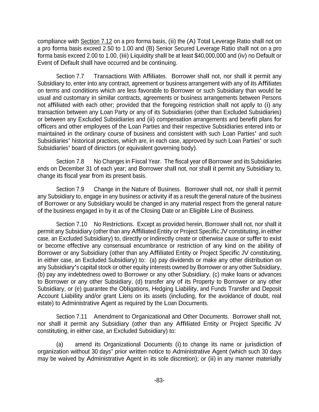 -83- compliance with Section 7.12 on a pro forma basis, (ii) the (A) Total Leverage Ratio shall not on a pro forma basis exceed 2.50 to 1.00 and (B) Senior Secured Leverage Ratio shall not on a pro forma basis exceed 2.00 to 1.00, (iii) Liquidity shall be at least $40,000,000 and (iv) no Default or Event of Default shall have occurred and be continuing. Section 7.7 Transactions With Affiliates. Borrower shall not, nor shall it permit any Subsidiary to, enter into any contract, agreement or business arrangement with any of its Affiliates on terms and conditions which are less favorable to Borrower or such Subsidiary than would be usual and customary in similar contracts, agreements or business arrangements between Persons not affiliated with each other; provided that the foregoing restriction shall not apply to (i) any transaction between any Loan Party or any of its Subsidiaries (other than Excluded Subsidiaries) or between any Excluded Subsidiaries and (ii) compensation arrangements and benefit plans for officers and other employees of the Loan Parties and their respective Subsidiaries entered into or maintained in the ordinary course of business and consistent with such Loan Parties’ and such Subsidiaries’ historical practices, which are, in each case, approved by such Loan Parties’ or such Subsidiaries’ board of directors (or equivalent governing body). Section 7.8 No Changes in Fiscal Year. The fiscal year of Borrower and its Subsidiaries ends on December 31 of each year; and Borrower shall not, nor shall it permit any Subsidiary to, change its fiscal year from its present basis. Section 7.9 Change in the Nature of Business. Borrower shall not, nor shall it permit any Subsidiary to, engage in any business or activity if as a result the general nature of the business of Borrower or any Subsidiary would be changed in any material respect from the general nature of the business engaged in by it as of the Closing Date or an Eligible Line of Business. Section 7.10 No Restrictions. Except as provided herein, Borrower shall not, nor shall it permit any Subsidiary (other than any Affiliated Entity or Project Specific JV constituting, in either case, an Excluded Subsidiary) to, directly or indirectly create or otherwise cause or suffer to exist or become effective any consensual encumbrance or restriction of any kind on the ability of Borrower or any Subsidiary (other than any Affiliated Entity or Project Specific JV constituting, in either case, an Excluded Subsidiary) to: (a) pay dividends or make any other distribution on any Subsidiary’s capital stock or other equity interests owned by Borrower or any other Subsidiary, (b) pay any indebtedness owed to Borrower or any other Subsidiary, (c) make loans or advances to Borrower or any other Subsidiary, (d) transfer any of its Property to Borrower or any other Subsidiary, or (e) guarantee the Obligations, Hedging Liability, and Funds Transfer and Deposit Account Liability and/or grant Liens on its assets (including, for the avoidance of doubt, real estate) to Administrative Agent as required by the Loan Documents. Section 7.11 Amendment to Organizational and Other Documents. Borrower shall not, nor shall it permit any Subsidiary (other than any Affiliated Entity or Project Specific JV constituting, in either case, an Excluded Subsidiary) to: (a) amend its Organizational Documents (i) to change its name or jurisdiction of organization without 30 days’ prior written notice to Administrative Agent (which such 30 days may be waived by Administrative Agent in its sole discretion); or (ii) in any manner materially