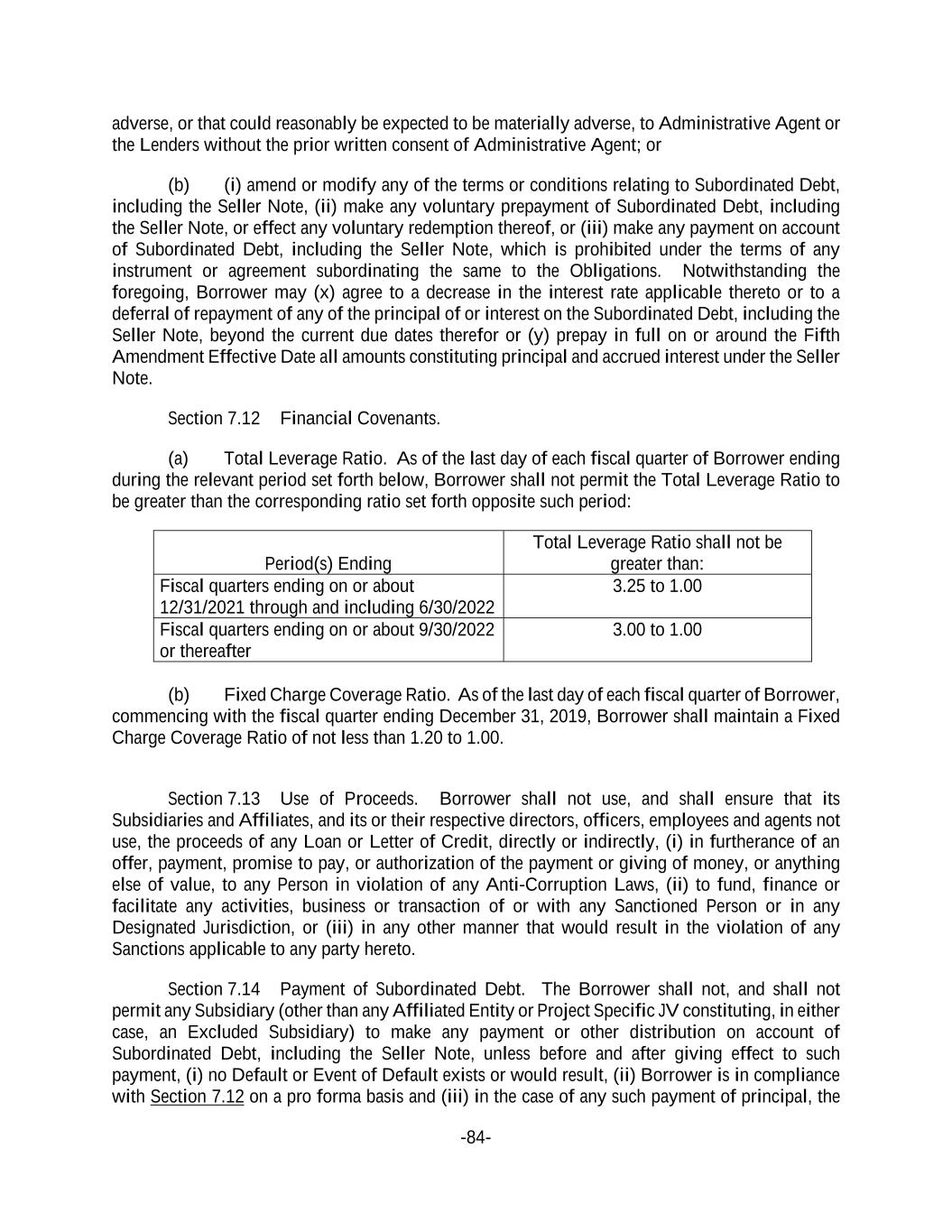 -84- adverse, or that could reasonably be expected to be materially adverse, to Administrative Agent or the Lenders without the prior written consent of Administrative Agent; or (b) (i) amend or modify any of the terms or conditions relating to Subordinated Debt, including the Seller Note, (ii) make any voluntary prepayment of Subordinated Debt, including the Seller Note, or effect any voluntary redemption thereof, or (iii) make any payment on account of Subordinated Debt, including the Seller Note, which is prohibited under the terms of any instrument or agreement subordinating the same to the Obligations. Notwithstanding the foregoing, Borrower may (x) agree to a decrease in the interest rate applicable thereto or to a deferral of repayment of any of the principal of or interest on the Subordinated Debt, including the Seller Note, beyond the current due dates therefor or (y) prepay in full on or around the Fifth Amendment Effective Date all amounts constituting principal and accrued interest under the Seller Note. Section 7.12 Financial Covenants. (a) Total Leverage Ratio. As of the last day of each fiscal quarter of Borrower ending during the relevant period set forth below, Borrower shall not permit the Total Leverage Ratio to be greater than the corresponding ratio set forth opposite such period: Period(s) Ending Total Leverage Ratio shall not be greater than: Fiscal quarters ending on or about 12/31/2021 through and including 6/30/2022 3.25 to 1.00 Fiscal quarters ending on or about 9/30/2022 or thereafter 3.00 to 1.00 (b) Fixed Charge Coverage Ratio. As of the last day of each fiscal quarter of Borrower, commencing with the fiscal quarter ending December 31, 2019, Borrower shall maintain a Fixed Charge Coverage Ratio of not less than 1.20 to 1.00. Section 7.13 Use of Proceeds. Borrower shall not use, and shall ensure that its Subsidiaries and Affiliates, and its or their respective directors, officers, employees and agents not use, the proceeds of any Loan or Letter of Credit, directly or indirectly, (i) in furtherance of an offer, payment, promise to pay, or authorization of the payment or giving of money, or anything else of value, to any Person in violation of any Anti-Corruption Laws, (ii) to fund, finance or facilitate any activities, business or transaction of or with any Sanctioned Person or in any Designated Jurisdiction, or (iii) in any other manner that would result in the violation of any Sanctions applicable to any party hereto. Section 7.14 Payment of Subordinated Debt. The Borrower shall not, and shall not permit any Subsidiary (other than any Affiliated Entity or Project Specific JV constituting, in either case, an Excluded Subsidiary) to make any payment or other distribution on account of Subordinated Debt, including the Seller Note, unless before and after giving effect to such payment, (i) no Default or Event of Default exists or would result, (ii) Borrower is in compliance with Section 7.12 on a pro forma basis and (iii) in the case of any such payment of principal, the
