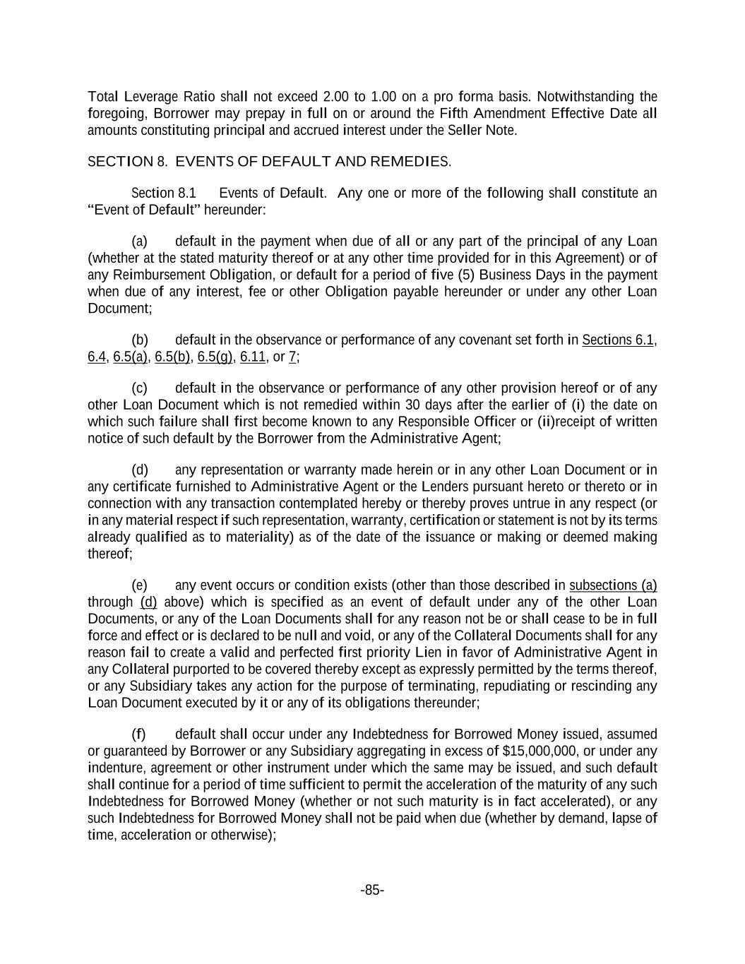 -85- Total Leverage Ratio shall not exceed 2.00 to 1.00 on a pro forma basis. Notwithstanding the foregoing, Borrower may prepay in full on or around the Fifth Amendment Effective Date all amounts constituting principal and accrued interest under the Seller Note. SECTION 8. EVENTS OF DEFAULT AND REMEDIES. Section 8.1 Events of Default. Any one or more of the following shall constitute an “Event of Default” hereunder: (a) default in the payment when due of all or any part of the principal of any Loan (whether at the stated maturity thereof or at any other time provided for in this Agreement) or of any Reimbursement Obligation, or default for a period of five (5) Business Days in the payment when due of any interest, fee or other Obligation payable hereunder or under any other Loan Document; (b) default in the observance or performance of any covenant set forth in Sections 6.1, 6.4, 6.5(a), 6.5(b), 6.5(g), 6.11, or 7; (c) default in the observance or performance of any other provision hereof or of any other Loan Document which is not remedied within 30 days after the earlier of (i) the date on which such failure shall first become known to any Responsible Officer or (ii)receipt of written notice of such default by the Borrower from the Administrative Agent; (d) any representation or warranty made herein or in any other Loan Document or in any certificate furnished to Administrative Agent or the Lenders pursuant hereto or thereto or in connection with any transaction contemplated hereby or thereby proves untrue in any respect (or in any material respect if such representation, warranty, certification or statement is not by its terms already qualified as to materiality) as of the date of the issuance or making or deemed making thereof; (e) any event occurs or condition exists (other than those described in subsections (a) through (d) above) which is specified as an event of default under any of the other Loan Documents, or any of the Loan Documents shall for any reason not be or shall cease to be in full force and effect or is declared to be null and void, or any of the Collateral Documents shall for any reason fail to create a valid and perfected first priority Lien in favor of Administrative Agent in any Collateral purported to be covered thereby except as expressly permitted by the terms thereof, or any Subsidiary takes any action for the purpose of terminating, repudiating or rescinding any Loan Document executed by it or any of its obligations thereunder; (f) default shall occur under any Indebtedness for Borrowed Money issued, assumed or guaranteed by Borrower or any Subsidiary aggregating in excess of $15,000,000, or under any indenture, agreement or other instrument under which the same may be issued, and such default shall continue for a period of time sufficient to permit the acceleration of the maturity of any such Indebtedness for Borrowed Money (whether or not such maturity is in fact accelerated), or any such Indebtedness for Borrowed Money shall not be paid when due (whether by demand, lapse of time, acceleration or otherwise);