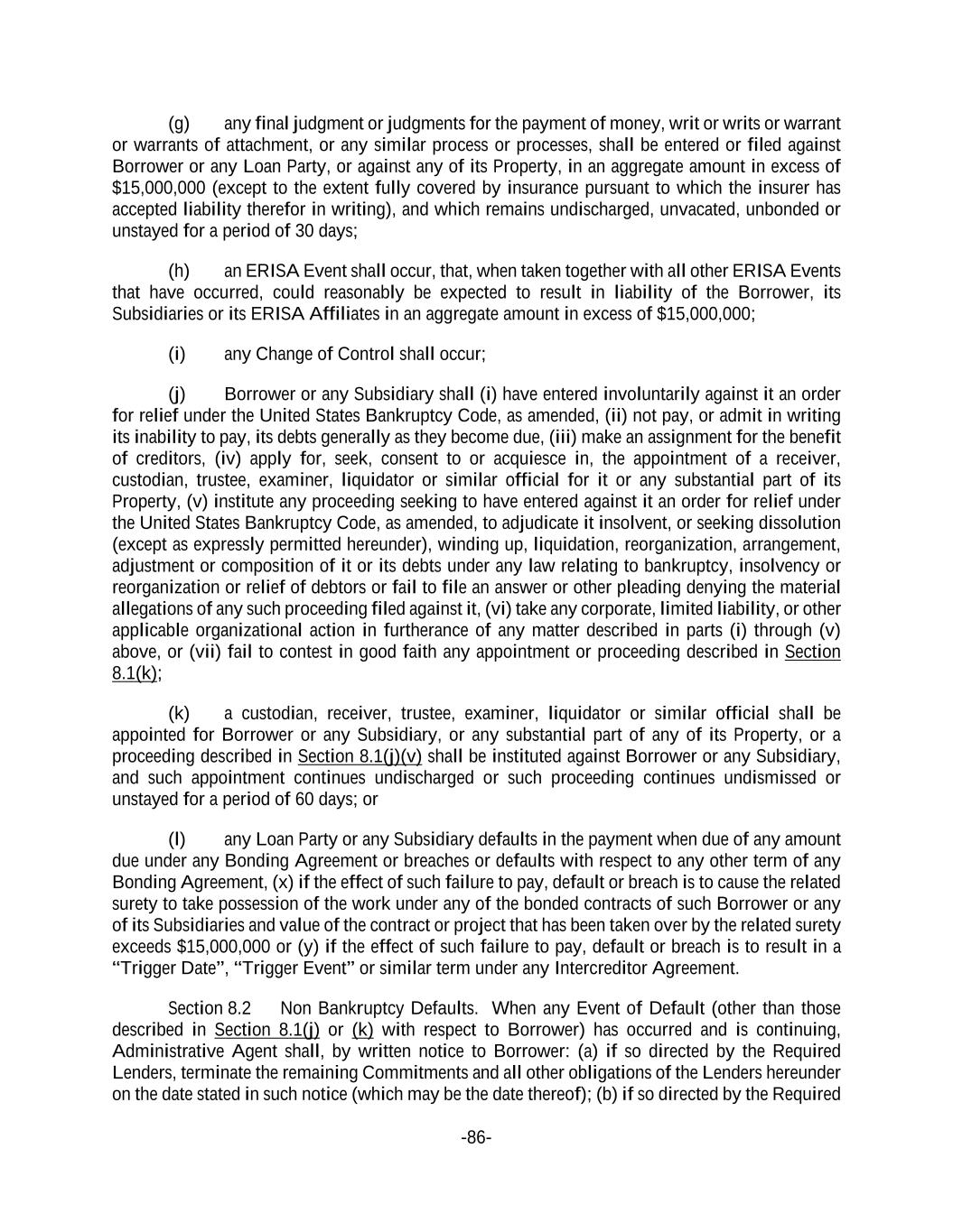 -86- (g) any final judgment or judgments for the payment of money, writ or writs or warrant or warrants of attachment, or any similar process or processes, shall be entered or filed against Borrower or any Loan Party, or against any of its Property, in an aggregate amount in excess of $15,000,000 (except to the extent fully covered by insurance pursuant to which the insurer has accepted liability therefor in writing), and which remains undischarged, unvacated, unbonded or unstayed for a period of 30 days; (h) an ERISA Event shall occur, that, when taken together with all other ERISA Events that have occurred, could reasonably be expected to result in liability of the Borrower, its Subsidiaries or its ERISA Affiliates in an aggregate amount in excess of $15,000,000; (i) any Change of Control shall occur; (j) Borrower or any Subsidiary shall (i) have entered involuntarily against it an order for relief under the United States Bankruptcy Code, as amended, (ii) not pay, or admit in writing its inability to pay, its debts generally as they become due, (iii) make an assignment for the benefit of creditors, (iv) apply for, seek, consent to or acquiesce in, the appointment of a receiver, custodian, trustee, examiner, liquidator or similar official for it or any substantial part of its Property, (v) institute any proceeding seeking to have entered against it an order for relief under the United States Bankruptcy Code, as amended, to adjudicate it insolvent, or seeking dissolution (except as expressly permitted hereunder), winding up, liquidation, reorganization, arrangement, adjustment or composition of it or its debts under any law relating to bankruptcy, insolvency or reorganization or relief of debtors or fail to file an answer or other pleading denying the material allegations of any such proceeding filed against it, (vi) take any corporate, limited liability, or other applicable organizational action in furtherance of any matter described in parts (i) through (v) above, or (vii) fail to contest in good faith any appointment or proceeding described in Section 8.1(k); (k) a custodian, receiver, trustee, examiner, liquidator or similar official shall be appointed for Borrower or any Subsidiary, or any substantial part of any of its Property, or a proceeding described in Section 8.1(j)(v) shall be instituted against Borrower or any Subsidiary, and such appointment continues undischarged or such proceeding continues undismissed or unstayed for a period of 60 days; or (l) any Loan Party or any Subsidiary defaults in the payment when due of any amount due under any Bonding Agreement or breaches or defaults with respect to any other term of any Bonding Agreement, (x) if the effect of such failure to pay, default or breach is to cause the related surety to take possession of the work under any of the bonded contracts of such Borrower or any of its Subsidiaries and value of the contract or project that has been taken over by the related surety exceeds $15,000,000 or (y) if the effect of such failure to pay, default or breach is to result in a “Trigger Date”, “Trigger Event” or similar term under any Intercreditor Agreement. Section 8.2 Non Bankruptcy Defaults. When any Event of Default (other than those described in Section 8.1(j) or (k) with respect to Borrower) has occurred and is continuing, Administrative Agent shall, by written notice to Borrower: (a) if so directed by the Required Lenders, terminate the remaining Commitments and all other obligations of the Lenders hereunder on the date stated in such notice (which may be the date thereof); (b) if so directed by the Required