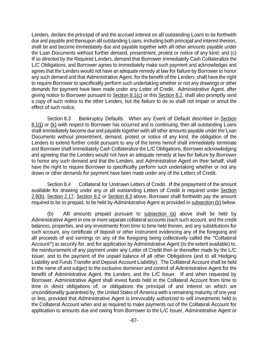 -87- Lenders, declare the principal of and the accrued interest on all outstanding Loans to be forthwith due and payable and thereupon all outstanding Loans, including both principal and interest thereon, shall be and become immediately due and payable together with all other amounts payable under the Loan Documents without further demand, presentment, protest or notice of any kind; and (c) if so directed by the Required Lenders, demand that Borrower immediately Cash Collateralize the L/C Obligations, and Borrower agrees to immediately make such payment and acknowledges and agrees that the Lenders would not have an adequate remedy at law for failure by Borrower to honor any such demand and that Administrative Agent, for the benefit of the Lenders, shall have the right to require Borrower to specifically perform such undertaking whether or not any drawings or other demands for payment have been made under any Letter of Credit. Administrative Agent, after giving notice to Borrower pursuant to Section 8.1(c) or this Section 8.2, shall also promptly send a copy of such notice to the other Lenders, but the failure to do so shall not impair or annul the effect of such notice. Section 8.3 Bankruptcy Defaults. When any Event of Default described in Section 8.1(j) or (k) with respect to Borrower has occurred and is continuing, then all outstanding Loans shall immediately become due and payable together with all other amounts payable under the Loan Documents without presentment, demand, protest or notice of any kind, the obligation of the Lenders to extend further credit pursuant to any of the terms hereof shall immediately terminate and Borrower shall immediately Cash Collateralize the L/C Obligations, Borrower acknowledging and agreeing that the Lenders would not have an adequate remedy at law for failure by Borrower to honor any such demand and that the Lenders, and Administrative Agent on their behalf, shall have the right to require Borrower to specifically perform such undertaking whether or not any draws or other demands for payment have been made under any of the Letters of Credit. Section 8.4 Collateral for Undrawn Letters of Credit. If the prepayment of the amount available for drawing under any or all outstanding Letters of Credit is required under Section 2.9(b), Section 2.17, Section 8.2 or Section 8.3 above, Borrower shall forthwith pay the amount required to be so prepaid, to be held by Administrative Agent as provided in subsection (b) below. (b) All amounts prepaid pursuant to subsection (a) above shall be held by Administrative Agent in one or more separate collateral accounts (each such account, and the credit balances, properties, and any investments from time to time held therein, and any substitutions for such account, any certificate of deposit or other instrument evidencing any of the foregoing and all proceeds of and earnings on any of the foregoing being collectively called the “Collateral Account”) as security for, and for application by Administrative Agent (to the extent available) to, the reimbursement of any payment under any Letter of Credit then or thereafter made by the L/C Issuer, and to the payment of the unpaid balance of all other Obligations (and to all Hedging Liability and Funds Transfer and Deposit Account Liability). The Collateral Account shall be held in the name of and subject to the exclusive dominion and control of Administrative Agent for the benefit of Administrative Agent, the Lenders, and the L/C Issuer. If and when requested by Borrower, Administrative Agent shall invest funds held in the Collateral Account from time to time in direct obligations of, or obligations the principal of and interest on which are unconditionally guaranteed by, the United States of America with a remaining maturity of one year or less, provided that Administrative Agent is irrevocably authorized to sell investments held in the Collateral Account when and as required to make payments out of the Collateral Account for application to amounts due and owing from Borrower to the L/C Issuer, Administrative Agent or