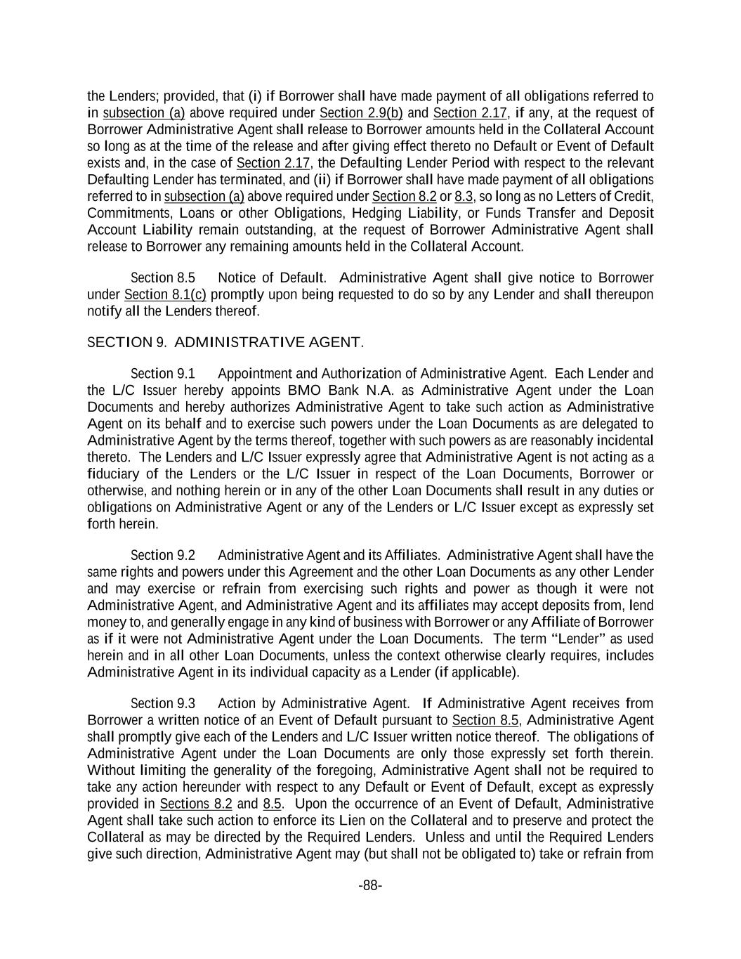 -88- the Lenders; provided, that (i) if Borrower shall have made payment of all obligations referred to in subsection (a) above required under Section 2.9(b) and Section 2.17, if any, at the request of Borrower Administrative Agent shall release to Borrower amounts held in the Collateral Account so long as at the time of the release and after giving effect thereto no Default or Event of Default exists and, in the case of Section 2.17, the Defaulting Lender Period with respect to the relevant Defaulting Lender has terminated, and (ii) if Borrower shall have made payment of all obligations referred to in subsection (a) above required under Section 8.2 or 8.3, so long as no Letters of Credit, Commitments, Loans or other Obligations, Hedging Liability, or Funds Transfer and Deposit Account Liability remain outstanding, at the request of Borrower Administrative Agent shall release to Borrower any remaining amounts held in the Collateral Account. Section 8.5 Notice of Default. Administrative Agent shall give notice to Borrower under Section 8.1(c) promptly upon being requested to do so by any Lender and shall thereupon notify all the Lenders thereof. SECTION 9. ADMINISTRATIVE AGENT. Section 9.1 Appointment and Authorization of Administrative Agent. Each Lender and the L/C Issuer hereby appoints BMO Bank N.A. as Administrative Agent under the Loan Documents and hereby authorizes Administrative Agent to take such action as Administrative Agent on its behalf and to exercise such powers under the Loan Documents as are delegated to Administrative Agent by the terms thereof, together with such powers as are reasonably incidental thereto. The Lenders and L/C Issuer expressly agree that Administrative Agent is not acting as a fiduciary of the Lenders or the L/C Issuer in respect of the Loan Documents, Borrower or otherwise, and nothing herein or in any of the other Loan Documents shall result in any duties or obligations on Administrative Agent or any of the Lenders or L/C Issuer except as expressly set forth herein. Section 9.2 Administrative Agent and its Affiliates. Administrative Agent shall have the same rights and powers under this Agreement and the other Loan Documents as any other Lender and may exercise or refrain from exercising such rights and power as though it were not Administrative Agent, and Administrative Agent and its affiliates may accept deposits from, lend money to, and generally engage in any kind of business with Borrower or any Affiliate of Borrower as if it were not Administrative Agent under the Loan Documents. The term “Lender” as used herein and in all other Loan Documents, unless the context otherwise clearly requires, includes Administrative Agent in its individual capacity as a Lender (if applicable). Section 9.3 Action by Administrative Agent. If Administrative Agent receives from Borrower a written notice of an Event of Default pursuant to Section 8.5, Administrative Agent shall promptly give each of the Lenders and L/C Issuer written notice thereof. The obligations of Administrative Agent under the Loan Documents are only those expressly set forth therein. Without limiting the generality of the foregoing, Administrative Agent shall not be required to take any action hereunder with respect to any Default or Event of Default, except as expressly provided in Sections 8.2 and 8.5. Upon the occurrence of an Event of Default, Administrative Agent shall take such action to enforce its Lien on the Collateral and to preserve and protect the Collateral as may be directed by the Required Lenders. Unless and until the Required Lenders give such direction, Administrative Agent may (but shall not be obligated to) take or refrain from