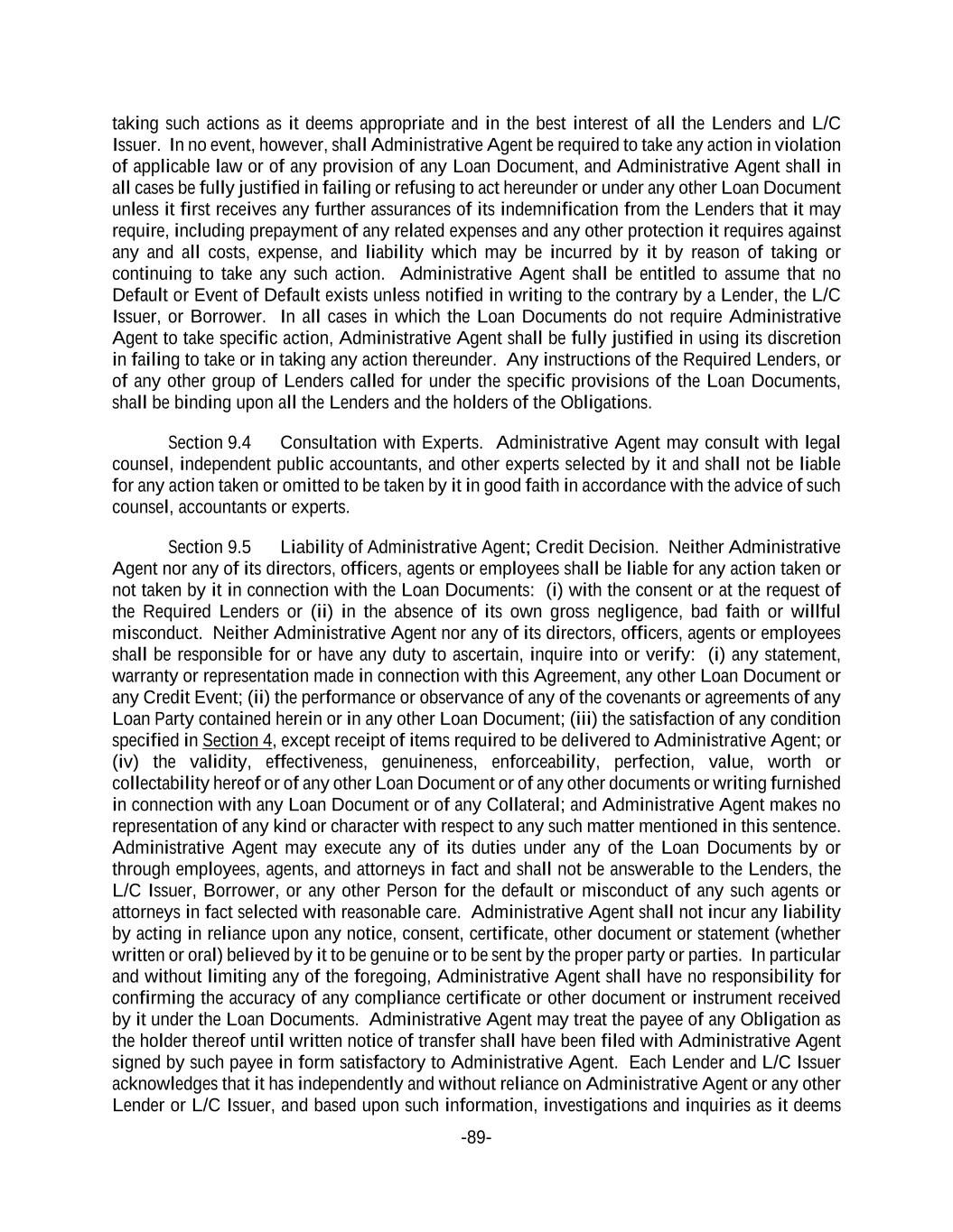 -89- taking such actions as it deems appropriate and in the best interest of all the Lenders and L/C Issuer. In no event, however, shall Administrative Agent be required to take any action in violation of applicable law or of any provision of any Loan Document, and Administrative Agent shall in all cases be fully justified in failing or refusing to act hereunder or under any other Loan Document unless it first receives any further assurances of its indemnification from the Lenders that it may require, including prepayment of any related expenses and any other protection it requires against any and all costs, expense, and liability which may be incurred by it by reason of taking or continuing to take any such action. Administrative Agent shall be entitled to assume that no Default or Event of Default exists unless notified in writing to the contrary by a Lender, the L/C Issuer, or Borrower. In all cases in which the Loan Documents do not require Administrative Agent to take specific action, Administrative Agent shall be fully justified in using its discretion in failing to take or in taking any action thereunder. Any instructions of the Required Lenders, or of any other group of Lenders called for under the specific provisions of the Loan Documents, shall be binding upon all the Lenders and the holders of the Obligations. Section 9.4 Consultation with Experts. Administrative Agent may consult with legal counsel, independent public accountants, and other experts selected by it and shall not be liable for any action taken or omitted to be taken by it in good faith in accordance with the advice of such counsel, accountants or experts. Section 9.5 Liability of Administrative Agent; Credit Decision. Neither Administrative Agent nor any of its directors, officers, agents or employees shall be liable for any action taken or not taken by it in connection with the Loan Documents: (i) with the consent or at the request of the Required Lenders or (ii) in the absence of its own gross negligence, bad faith or willful misconduct. Neither Administrative Agent nor any of its directors, officers, agents or employees shall be responsible for or have any duty to ascertain, inquire into or verify: (i) any statement, warranty or representation made in connection with this Agreement, any other Loan Document or any Credit Event; (ii) the performance or observance of any of the covenants or agreements of any Loan Party contained herein or in any other Loan Document; (iii) the satisfaction of any condition specified in Section 4, except receipt of items required to be delivered to Administrative Agent; or (iv) the validity, effectiveness, genuineness, enforceability, perfection, value, worth or collectability hereof or of any other Loan Document or of any other documents or writing furnished in connection with any Loan Document or of any Collateral; and Administrative Agent makes no representation of any kind or character with respect to any such matter mentioned in this sentence. Administrative Agent may execute any of its duties under any of the Loan Documents by or through employees, agents, and attorneys in fact and shall not be answerable to the Lenders, the L/C Issuer, Borrower, or any other Person for the default or misconduct of any such agents or attorneys in fact selected with reasonable care. Administrative Agent shall not incur any liability by acting in reliance upon any notice, consent, certificate, other document or statement (whether written or oral) believed by it to be genuine or to be sent by the proper party or parties. In particular and without limiting any of the foregoing, Administrative Agent shall have no responsibility for confirming the accuracy of any compliance certificate or other document or instrument received by it under the Loan Documents. Administrative Agent may treat the payee of any Obligation as the holder thereof until written notice of transfer shall have been filed with Administrative Agent signed by such payee in form satisfactory to Administrative Agent. Each Lender and L/C Issuer acknowledges that it has independently and without reliance on Administrative Agent or any other Lender or L/C Issuer, and based upon such information, investigations and inquiries as it deems