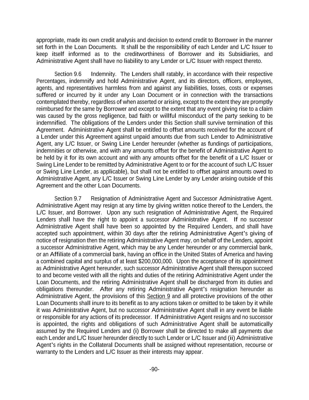 -90- appropriate, made its own credit analysis and decision to extend credit to Borrower in the manner set forth in the Loan Documents. It shall be the responsibility of each Lender and L/C Issuer to keep itself informed as to the creditworthiness of Borrower and its Subsidiaries, and Administrative Agent shall have no liability to any Lender or L/C Issuer with respect thereto. Section 9.6 Indemnity. The Lenders shall ratably, in accordance with their respective Percentages, indemnify and hold Administrative Agent, and its directors, officers, employees, agents, and representatives harmless from and against any liabilities, losses, costs or expenses suffered or incurred by it under any Loan Document or in connection with the transactions contemplated thereby, regardless of when asserted or arising, except to the extent they are promptly reimbursed for the same by Borrower and except to the extent that any event giving rise to a claim was caused by the gross negligence, bad faith or willful misconduct of the party seeking to be indemnified. The obligations of the Lenders under this Section shall survive termination of this Agreement. Administrative Agent shall be entitled to offset amounts received for the account of a Lender under this Agreement against unpaid amounts due from such Lender to Administrative Agent, any L/C Issuer, or Swing Line Lender hereunder (whether as fundings of participations, indemnities or otherwise, and with any amounts offset for the benefit of Administrative Agent to be held by it for its own account and with any amounts offset for the benefit of a L/C Issuer or Swing Line Lender to be remitted by Administrative Agent to or for the account of such L/C Issuer or Swing Line Lender, as applicable), but shall not be entitled to offset against amounts owed to Administrative Agent, any L/C Issuer or Swing Line Lender by any Lender arising outside of this Agreement and the other Loan Documents. Section 9.7 Resignation of Administrative Agent and Successor Administrative Agent. Administrative Agent may resign at any time by giving written notice thereof to the Lenders, the L/C Issuer, and Borrower. Upon any such resignation of Administrative Agent, the Required Lenders shall have the right to appoint a successor Administrative Agent. If no successor Administrative Agent shall have been so appointed by the Required Lenders, and shall have accepted such appointment, within 30 days after the retiring Administrative Agent’s giving of notice of resignation then the retiring Administrative Agent may, on behalf of the Lenders, appoint a successor Administrative Agent, which may be any Lender hereunder or any commercial bank, or an Affiliate of a commercial bank, having an office in the United States of America and having a combined capital and surplus of at least $200,000,000. Upon the acceptance of its appointment as Administrative Agent hereunder, such successor Administrative Agent shall thereupon succeed to and become vested with all the rights and duties of the retiring Administrative Agent under the Loan Documents, and the retiring Administrative Agent shall be discharged from its duties and obligations thereunder. After any retiring Administrative Agent’s resignation hereunder as Administrative Agent, the provisions of this Section 9 and all protective provisions of the other Loan Documents shall inure to its benefit as to any actions taken or omitted to be taken by it while it was Administrative Agent, but no successor Administrative Agent shall in any event be liable or responsible for any actions of its predecessor. If Administrative Agent resigns and no successor is appointed, the rights and obligations of such Administrative Agent shall be automatically assumed by the Required Lenders and (i) Borrower shall be directed to make all payments due each Lender and L/C Issuer hereunder directly to such Lender or L/C Issuer and (ii) Administrative Agent’s rights in the Collateral Documents shall be assigned without representation, recourse or warranty to the Lenders and L/C Issuer as their interests may appear.