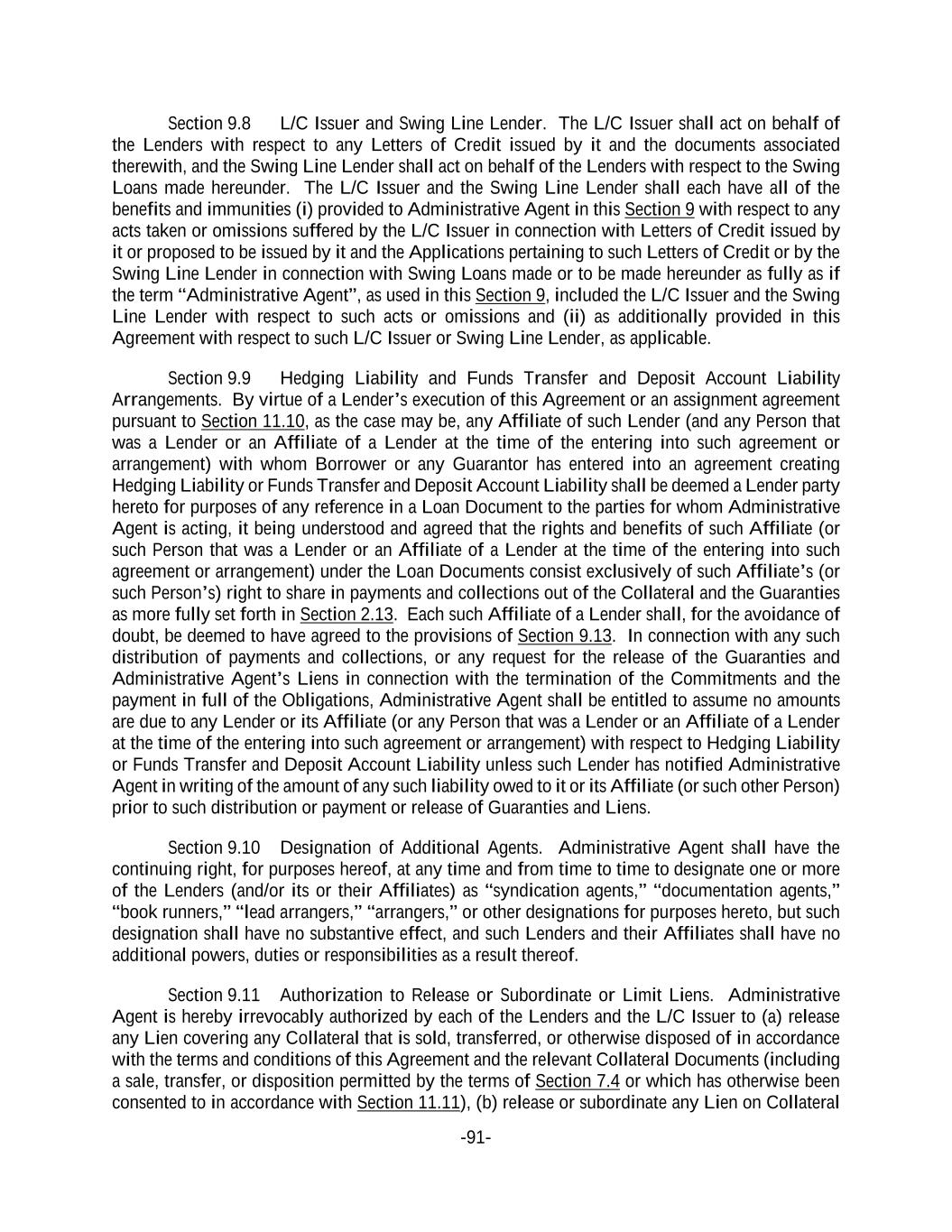 -91- Section 9.8 L/C Issuer and Swing Line Lender. The L/C Issuer shall act on behalf of the Lenders with respect to any Letters of Credit issued by it and the documents associated therewith, and the Swing Line Lender shall act on behalf of the Lenders with respect to the Swing Loans made hereunder. The L/C Issuer and the Swing Line Lender shall each have all of the benefits and immunities (i) provided to Administrative Agent in this Section 9 with respect to any acts taken or omissions suffered by the L/C Issuer in connection with Letters of Credit issued by it or proposed to be issued by it and the Applications pertaining to such Letters of Credit or by the Swing Line Lender in connection with Swing Loans made or to be made hereunder as fully as if the term “Administrative Agent”, as used in this Section 9, included the L/C Issuer and the Swing Line Lender with respect to such acts or omissions and (ii) as additionally provided in this Agreement with respect to such L/C Issuer or Swing Line Lender, as applicable. Section 9.9 Hedging Liability and Funds Transfer and Deposit Account Liability Arrangements. By virtue of a Lender’s execution of this Agreement or an assignment agreement pursuant to Section 11.10, as the case may be, any Affiliate of such Lender (and any Person that was a Lender or an Affiliate of a Lender at the time of the entering into such agreement or arrangement) with whom Borrower or any Guarantor has entered into an agreement creating Hedging Liability or Funds Transfer and Deposit Account Liability shall be deemed a Lender party hereto for purposes of any reference in a Loan Document to the parties for whom Administrative Agent is acting, it being understood and agreed that the rights and benefits of such Affiliate (or such Person that was a Lender or an Affiliate of a Lender at the time of the entering into such agreement or arrangement) under the Loan Documents consist exclusively of such Affiliate’s (or such Person’s) right to share in payments and collections out of the Collateral and the Guaranties as more fully set forth in Section 2.13. Each such Affiliate of a Lender shall, for the avoidance of doubt, be deemed to have agreed to the provisions of Section 9.13. In connection with any such distribution of payments and collections, or any request for the release of the Guaranties and Administrative Agent’s Liens in connection with the termination of the Commitments and the payment in full of the Obligations, Administrative Agent shall be entitled to assume no amounts are due to any Lender or its Affiliate (or any Person that was a Lender or an Affiliate of a Lender at the time of the entering into such agreement or arrangement) with respect to Hedging Liability or Funds Transfer and Deposit Account Liability unless such Lender has notified Administrative Agent in writing of the amount of any such liability owed to it or its Affiliate (or such other Person) prior to such distribution or payment or release of Guaranties and Liens. Section 9.10 Designation of Additional Agents. Administrative Agent shall have the continuing right, for purposes hereof, at any time and from time to time to designate one or more of the Lenders (and/or its or their Affiliates) as “syndication agents,” “documentation agents,” “book runners,” “lead arrangers,” “arrangers,” or other designations for purposes hereto, but such designation shall have no substantive effect, and such Lenders and their Affiliates shall have no additional powers, duties or responsibilities as a result thereof. Section 9.11 Authorization to Release or Subordinate or Limit Liens. Administrative Agent is hereby irrevocably authorized by each of the Lenders and the L/C Issuer to (a) release any Lien covering any Collateral that is sold, transferred, or otherwise disposed of in accordance with the terms and conditions of this Agreement and the relevant Collateral Documents (including a sale, transfer, or disposition permitted by the terms of Section 7.4 or which has otherwise been consented to in accordance with Section 11.11), (b) release or subordinate any Lien on Collateral