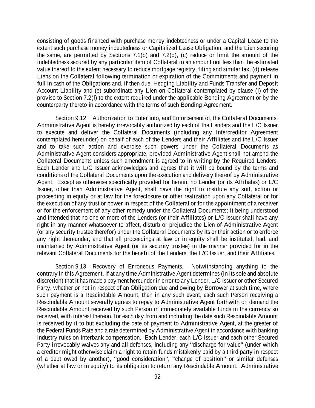 -92- consisting of goods financed with purchase money indebtedness or under a Capital Lease to the extent such purchase money indebtedness or Capitalized Lease Obligation, and the Lien securing the same, are permitted by Sections 7.1(b) and 7.2(d), (c) reduce or limit the amount of the indebtedness secured by any particular item of Collateral to an amount not less than the estimated value thereof to the extent necessary to reduce mortgage registry, filing and similar tax, (d) release Liens on the Collateral following termination or expiration of the Commitments and payment in full in cash of the Obligations and, if then due, Hedging Liability and Funds Transfer and Deposit Account Liability and (e) subordinate any Lien on Collateral contemplated by clause (i) of the proviso to Section 7.2(l) to the extent required under the applicable Bonding Agreement or by the counterparty thereto in accordance with the terms of such Bonding Agreement. Section 9.12 Authorization to Enter into, and Enforcement of, the Collateral Documents. Administrative Agent is hereby irrevocably authorized by each of the Lenders and the L/C Issuer to execute and deliver the Collateral Documents (including any Intercreditor Agreement contemplated hereunder) on behalf of each of the Lenders and their Affiliates and the L/C Issuer and to take such action and exercise such powers under the Collateral Documents as Administrative Agent considers appropriate, provided Administrative Agent shall not amend the Collateral Documents unless such amendment is agreed to in writing by the Required Lenders. Each Lender and L/C Issuer acknowledges and agrees that it will be bound by the terms and conditions of the Collateral Documents upon the execution and delivery thereof by Administrative Agent. Except as otherwise specifically provided for herein, no Lender (or its Affiliates) or L/C Issuer, other than Administrative Agent, shall have the right to institute any suit, action or proceeding in equity or at law for the foreclosure or other realization upon any Collateral or for the execution of any trust or power in respect of the Collateral or for the appointment of a receiver or for the enforcement of any other remedy under the Collateral Documents; it being understood and intended that no one or more of the Lenders (or their Affiliates) or L/C Issuer shall have any right in any manner whatsoever to affect, disturb or prejudice the Lien of Administrative Agent (or any security trustee therefor) under the Collateral Documents by its or their action or to enforce any right thereunder, and that all proceedings at law or in equity shall be instituted, had, and maintained by Administrative Agent (or its security trustee) in the manner provided for in the relevant Collateral Documents for the benefit of the Lenders, the L/C Issuer, and their Affiliates. Section 9.13 Recovery of Erroneous Payments. Notwithstanding anything to the contrary in this Agreement, if at any time Administrative Agent determines (in its sole and absolute discretion) that it has made a payment hereunder in error to any Lender, L/C Issuer or other Secured Party, whether or not in respect of an Obligation due and owing by Borrower at such time, where such payment is a Rescindable Amount, then in any such event, each such Person receiving a Rescindable Amount severally agrees to repay to Administrative Agent forthwith on demand the Rescindable Amount received by such Person in immediately available funds in the currency so received, with interest thereon, for each day from and including the date such Rescindable Amount is received by it to but excluding the date of payment to Administrative Agent, at the greater of the Federal Funds Rate and a rate determined by Administrative Agent in accordance with banking industry rules on interbank compensation. Each Lender, each L/C Issuer and each other Secured Party irrevocably waives any and all defenses, including any “discharge for value” (under which a creditor might otherwise claim a right to retain funds mistakenly paid by a third party in respect of a debt owed by another), “good consideration”, “change of position” or similar defenses (whether at law or in equity) to its obligation to return any Rescindable Amount. Administrative