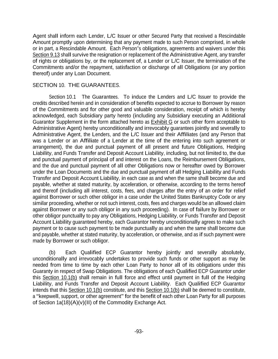 -93- Agent shall inform each Lender, L/C Issuer or other Secured Party that received a Rescindable Amount promptly upon determining that any payment made to such Person comprised, in whole or in part, a Rescindable Amount. Each Person’s obligations, agreements and waivers under this Section 9.13 shall survive the resignation or replacement of the Administrative Agent, any transfer of rights or obligations by, or the replacement of, a Lender or L/C Issuer, the termination of the Commitments and/or the repayment, satisfaction or discharge of all Obligations (or any portion thereof) under any Loan Document. SECTION 10. THE GUARANTEES. Section 10.1 The Guarantees. To induce the Lenders and L/C Issuer to provide the credits described herein and in consideration of benefits expected to accrue to Borrower by reason of the Commitments and for other good and valuable consideration, receipt of which is hereby acknowledged, each Subsidiary party hereto (including any Subsidiary executing an Additional Guarantor Supplement in the form attached hereto as Exhibit G or such other form acceptable to Administrative Agent) hereby unconditionally and irrevocably guarantees jointly and severally to Administrative Agent, the Lenders, and the L/C Issuer and their Affiliates (and any Person that was a Lender or an Affiliate of a Lender at the time of the entering into such agreement or arrangement), the due and punctual payment of all present and future Obligations, Hedging Liability, and Funds Transfer and Deposit Account Liability, including, but not limited to, the due and punctual payment of principal of and interest on the Loans, the Reimbursement Obligations, and the due and punctual payment of all other Obligations now or hereafter owed by Borrower under the Loan Documents and the due and punctual payment of all Hedging Liability and Funds Transfer and Deposit Account Liability, in each case as and when the same shall become due and payable, whether at stated maturity, by acceleration, or otherwise, according to the terms hereof and thereof (including all interest, costs, fees, and charges after the entry of an order for relief against Borrower or such other obligor in a case under the United States Bankruptcy Code or any similar proceeding, whether or not such interest, costs, fees and charges would be an allowed claim against Borrower or any such obligor in any such proceeding). In case of failure by Borrower or other obligor punctually to pay any Obligations, Hedging Liability, or Funds Transfer and Deposit Account Liability guaranteed hereby, each Guarantor hereby unconditionally agrees to make such payment or to cause such payment to be made punctually as and when the same shall become due and payable, whether at stated maturity, by acceleration, or otherwise, and as if such payment were made by Borrower or such obligor. (b) Each Qualified ECP Guarantor hereby jointly and severally absolutely, unconditionally and irrevocably undertakes to provide such funds or other support as may be needed from time to time by each other Loan Party to honor all of its obligations under this Guaranty in respect of Swap Obligations. The obligations of each Qualified ECP Guarantor under this Section 10.1(b) shall remain in full force and effect until payment in full of the Hedging Liability, and Funds Transfer and Deposit Account Liability. Each Qualified ECP Guarantor intends that this Section 10.1(b) constitute, and this Section 10.1(b) shall be deemed to constitute, a “keepwell, support, or other agreement” for the benefit of each other Loan Party for all purposes of Section 1a(18)(A)(v)(II) of the Commodity Exchange Act.