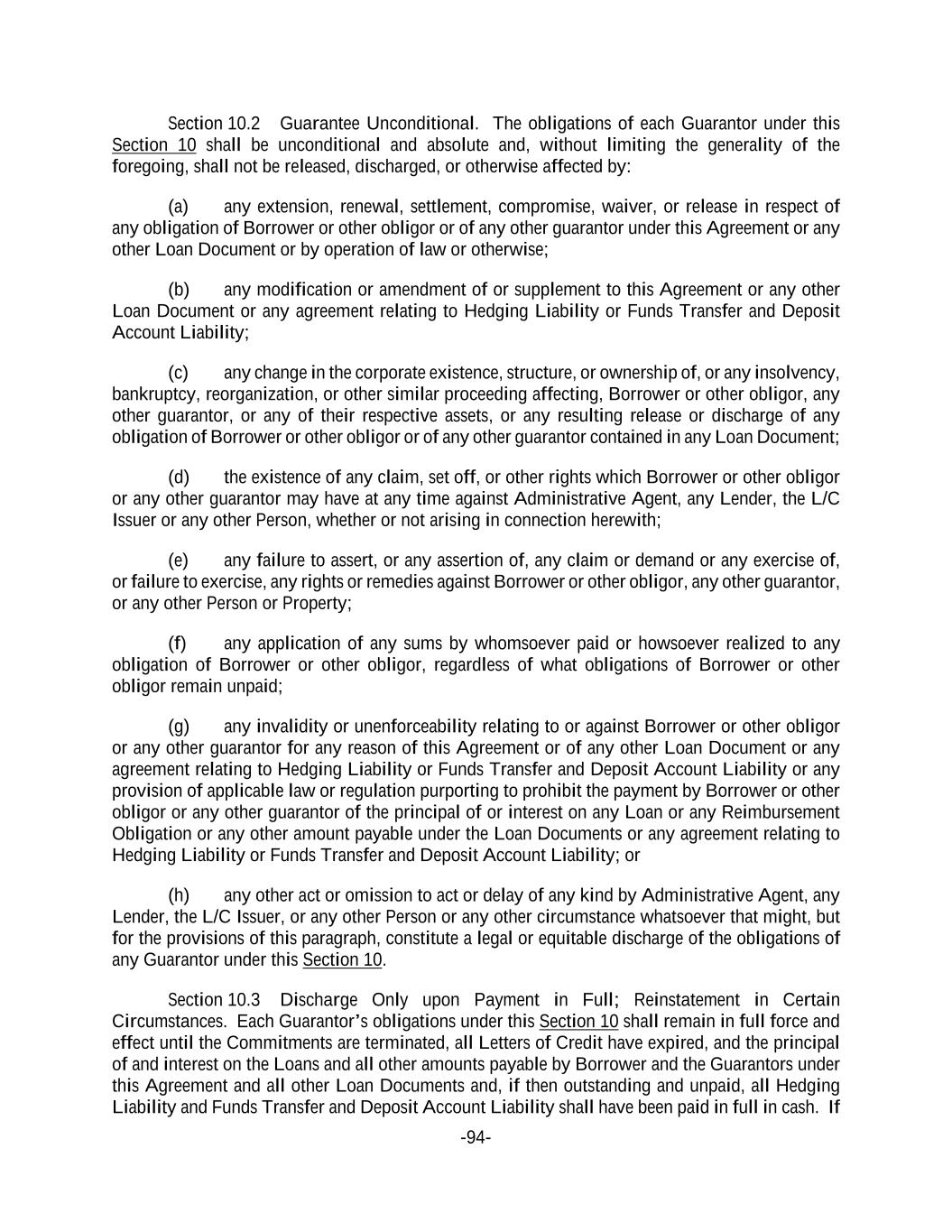 -94- Section 10.2 Guarantee Unconditional. The obligations of each Guarantor under this Section 10 shall be unconditional and absolute and, without limiting the generality of the foregoing, shall not be released, discharged, or otherwise affected by: (a) any extension, renewal, settlement, compromise, waiver, or release in respect of any obligation of Borrower or other obligor or of any other guarantor under this Agreement or any other Loan Document or by operation of law or otherwise; (b) any modification or amendment of or supplement to this Agreement or any other Loan Document or any agreement relating to Hedging Liability or Funds Transfer and Deposit Account Liability; (c) any change in the corporate existence, structure, or ownership of, or any insolvency, bankruptcy, reorganization, or other similar proceeding affecting, Borrower or other obligor, any other guarantor, or any of their respective assets, or any resulting release or discharge of any obligation of Borrower or other obligor or of any other guarantor contained in any Loan Document; (d) the existence of any claim, set off, or other rights which Borrower or other obligor or any other guarantor may have at any time against Administrative Agent, any Lender, the L/C Issuer or any other Person, whether or not arising in connection herewith; (e) any failure to assert, or any assertion of, any claim or demand or any exercise of, or failure to exercise, any rights or remedies against Borrower or other obligor, any other guarantor, or any other Person or Property; (f) any application of any sums by whomsoever paid or howsoever realized to any obligation of Borrower or other obligor, regardless of what obligations of Borrower or other obligor remain unpaid; (g) any invalidity or unenforceability relating to or against Borrower or other obligor or any other guarantor for any reason of this Agreement or of any other Loan Document or any agreement relating to Hedging Liability or Funds Transfer and Deposit Account Liability or any provision of applicable law or regulation purporting to prohibit the payment by Borrower or other obligor or any other guarantor of the principal of or interest on any Loan or any Reimbursement Obligation or any other amount payable under the Loan Documents or any agreement relating to Hedging Liability or Funds Transfer and Deposit Account Liability; or (h) any other act or omission to act or delay of any kind by Administrative Agent, any Lender, the L/C Issuer, or any other Person or any other circumstance whatsoever that might, but for the provisions of this paragraph, constitute a legal or equitable discharge of the obligations of any Guarantor under this Section 10. Section 10.3 Discharge Only upon Payment in Full; Reinstatement in Certain Circumstances. Each Guarantor’s obligations under this Section 10 shall remain in full force and effect until the Commitments are terminated, all Letters of Credit have expired, and the principal of and interest on the Loans and all other amounts payable by Borrower and the Guarantors under this Agreement and all other Loan Documents and, if then outstanding and unpaid, all Hedging Liability and Funds Transfer and Deposit Account Liability shall have been paid in full in cash. If