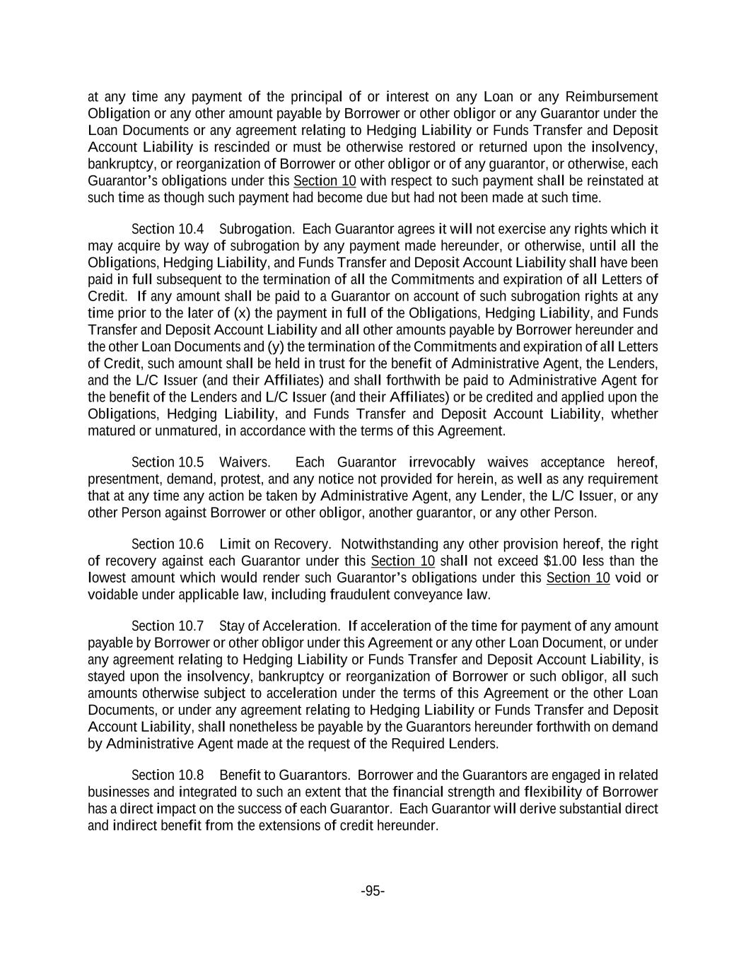 -95- at any time any payment of the principal of or interest on any Loan or any Reimbursement Obligation or any other amount payable by Borrower or other obligor or any Guarantor under the Loan Documents or any agreement relating to Hedging Liability or Funds Transfer and Deposit Account Liability is rescinded or must be otherwise restored or returned upon the insolvency, bankruptcy, or reorganization of Borrower or other obligor or of any guarantor, or otherwise, each Guarantor’s obligations under this Section 10 with respect to such payment shall be reinstated at such time as though such payment had become due but had not been made at such time. Section 10.4 Subrogation. Each Guarantor agrees it will not exercise any rights which it may acquire by way of subrogation by any payment made hereunder, or otherwise, until all the Obligations, Hedging Liability, and Funds Transfer and Deposit Account Liability shall have been paid in full subsequent to the termination of all the Commitments and expiration of all Letters of Credit. If any amount shall be paid to a Guarantor on account of such subrogation rights at any time prior to the later of (x) the payment in full of the Obligations, Hedging Liability, and Funds Transfer and Deposit Account Liability and all other amounts payable by Borrower hereunder and the other Loan Documents and (y) the termination of the Commitments and expiration of all Letters of Credit, such amount shall be held in trust for the benefit of Administrative Agent, the Lenders, and the L/C Issuer (and their Affiliates) and shall forthwith be paid to Administrative Agent for the benefit of the Lenders and L/C Issuer (and their Affiliates) or be credited and applied upon the Obligations, Hedging Liability, and Funds Transfer and Deposit Account Liability, whether matured or unmatured, in accordance with the terms of this Agreement. Section 10.5 Waivers. Each Guarantor irrevocably waives acceptance hereof, presentment, demand, protest, and any notice not provided for herein, as well as any requirement that at any time any action be taken by Administrative Agent, any Lender, the L/C Issuer, or any other Person against Borrower or other obligor, another guarantor, or any other Person. Section 10.6 Limit on Recovery. Notwithstanding any other provision hereof, the right of recovery against each Guarantor under this Section 10 shall not exceed $1.00 less than the lowest amount which would render such Guarantor’s obligations under this Section 10 void or voidable under applicable law, including fraudulent conveyance law. Section 10.7 Stay of Acceleration. If acceleration of the time for payment of any amount payable by Borrower or other obligor under this Agreement or any other Loan Document, or under any agreement relating to Hedging Liability or Funds Transfer and Deposit Account Liability, is stayed upon the insolvency, bankruptcy or reorganization of Borrower or such obligor, all such amounts otherwise subject to acceleration under the terms of this Agreement or the other Loan Documents, or under any agreement relating to Hedging Liability or Funds Transfer and Deposit Account Liability, shall nonetheless be payable by the Guarantors hereunder forthwith on demand by Administrative Agent made at the request of the Required Lenders. Section 10.8 Benefit to Guarantors. Borrower and the Guarantors are engaged in related businesses and integrated to such an extent that the financial strength and flexibility of Borrower has a direct impact on the success of each Guarantor. Each Guarantor will derive substantial direct and indirect benefit from the extensions of credit hereunder.