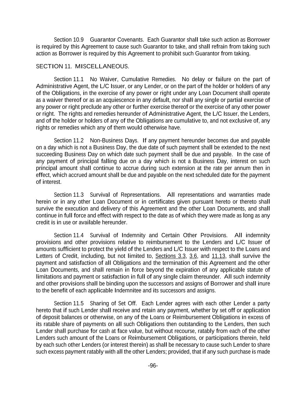 -96- Section 10.9 Guarantor Covenants. Each Guarantor shall take such action as Borrower is required by this Agreement to cause such Guarantor to take, and shall refrain from taking such action as Borrower is required by this Agreement to prohibit such Guarantor from taking. SECTION 11. MISCELLANEOUS. Section 11.1 No Waiver, Cumulative Remedies. No delay or failure on the part of Administrative Agent, the L/C Issuer, or any Lender, or on the part of the holder or holders of any of the Obligations, in the exercise of any power or right under any Loan Document shall operate as a waiver thereof or as an acquiescence in any default, nor shall any single or partial exercise of any power or right preclude any other or further exercise thereof or the exercise of any other power or right. The rights and remedies hereunder of Administrative Agent, the L/C Issuer, the Lenders, and of the holder or holders of any of the Obligations are cumulative to, and not exclusive of, any rights or remedies which any of them would otherwise have. Section 11.2 Non-Business Days. If any payment hereunder becomes due and payable on a day which is not a Business Day, the due date of such payment shall be extended to the next succeeding Business Day on which date such payment shall be due and payable. In the case of any payment of principal falling due on a day which is not a Business Day, interest on such principal amount shall continue to accrue during such extension at the rate per annum then in effect, which accrued amount shall be due and payable on the next scheduled date for the payment of interest. Section 11.3 Survival of Representations. All representations and warranties made herein or in any other Loan Document or in certificates given pursuant hereto or thereto shall survive the execution and delivery of this Agreement and the other Loan Documents, and shall continue in full force and effect with respect to the date as of which they were made as long as any credit is in use or available hereunder. Section 11.4 Survival of Indemnity and Certain Other Provisions. All indemnity provisions and other provisions relative to reimbursement to the Lenders and L/C Issuer of amounts sufficient to protect the yield of the Lenders and L/C Issuer with respect to the Loans and Letters of Credit, including, but not limited to, Sections 3.3, 3.6, and 11.13, shall survive the payment and satisfaction of all Obligations and the termination of this Agreement and the other Loan Documents, and shall remain in force beyond the expiration of any applicable statute of limitations and payment or satisfaction in full of any single claim thereunder. All such indemnity and other provisions shall be binding upon the successors and assigns of Borrower and shall inure to the benefit of each applicable Indemnitee and its successors and assigns. Section 11.5 Sharing of Set Off. Each Lender agrees with each other Lender a party hereto that if such Lender shall receive and retain any payment, whether by set off or application of deposit balances or otherwise, on any of the Loans or Reimbursement Obligations in excess of its ratable share of payments on all such Obligations then outstanding to the Lenders, then such Lender shall purchase for cash at face value, but without recourse, ratably from each of the other Lenders such amount of the Loans or Reimbursement Obligations, or participations therein, held by each such other Lenders (or interest therein) as shall be necessary to cause such Lender to share such excess payment ratably with all the other Lenders; provided, that if any such purchase is made