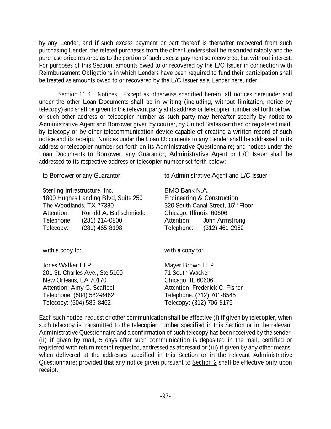 -97- by any Lender, and if such excess payment or part thereof is thereafter recovered from such purchasing Lender, the related purchases from the other Lenders shall be rescinded ratably and the purchase price restored as to the portion of such excess payment so recovered, but without interest. For purposes of this Section, amounts owed to or recovered by the L/C Issuer in connection with Reimbursement Obligations in which Lenders have been required to fund their participation shall be treated as amounts owed to or recovered by the L/C Issuer as a Lender hereunder. Section 11.6 Notices. Except as otherwise specified herein, all notices hereunder and under the other Loan Documents shall be in writing (including, without limitation, notice by telecopy) and shall be given to the relevant party at its address or telecopier number set forth below, or such other address or telecopier number as such party may hereafter specify by notice to Administrative Agent and Borrower given by courier, by United States certified or registered mail, by telecopy or by other telecommunication device capable of creating a written record of such notice and its receipt. Notices under the Loan Documents to any Lender shall be addressed to its address or telecopier number set forth on its Administrative Questionnaire; and notices under the Loan Documents to Borrower, any Guarantor, Administrative Agent or L/C Issuer shall be addressed to its respective address or telecopier number set forth below: to Borrower or any Guarantor: Sterling Infrastructure, Inc. 1800 Hughes Landing Blvd, Suite 250 The Woodlands, TX 77380 Attention: Ronald A. Ballschmiede Telephone: (281) 214-0800 Telecopy: (281) 465-8198 with a copy to: Jones Walker LLP 201 St. Charles Ave., Ste 5100 New Orleans, LA 70170 Attention: Amy G. Scafidel Telephone: (504) 582-8462 Telecopy: (504) 589-8462 to Administrative Agent and L/C Issuer : BMO Bank N.A. Engineering & Construction 320 South Canal Street, 15th Floor Chicago, Illinois 60606 Attention: John Armstrong Telephone: (312) 461-2962 with a copy to: Mayer Brown LLP 71 South Wacker Chicago, IL 60606 Attention: Frederick C. Fisher Telephone: (312) 701-8545 Telecopy: (312) 706-8179 Each such notice, request or other communication shall be effective (i) if given by telecopier, when such telecopy is transmitted to the telecopier number specified in this Section or in the relevant Administrative Questionnaire and a confirmation of such telecopy has been received by the sender, (ii) if given by mail, 5 days after such communication is deposited in the mail, certified or registered with return receipt requested, addressed as aforesaid or (iii) if given by any other means, when delivered at the addresses specified in this Section or in the relevant Administrative Questionnaire; provided that any notice given pursuant to Section 2 shall be effective only upon receipt.