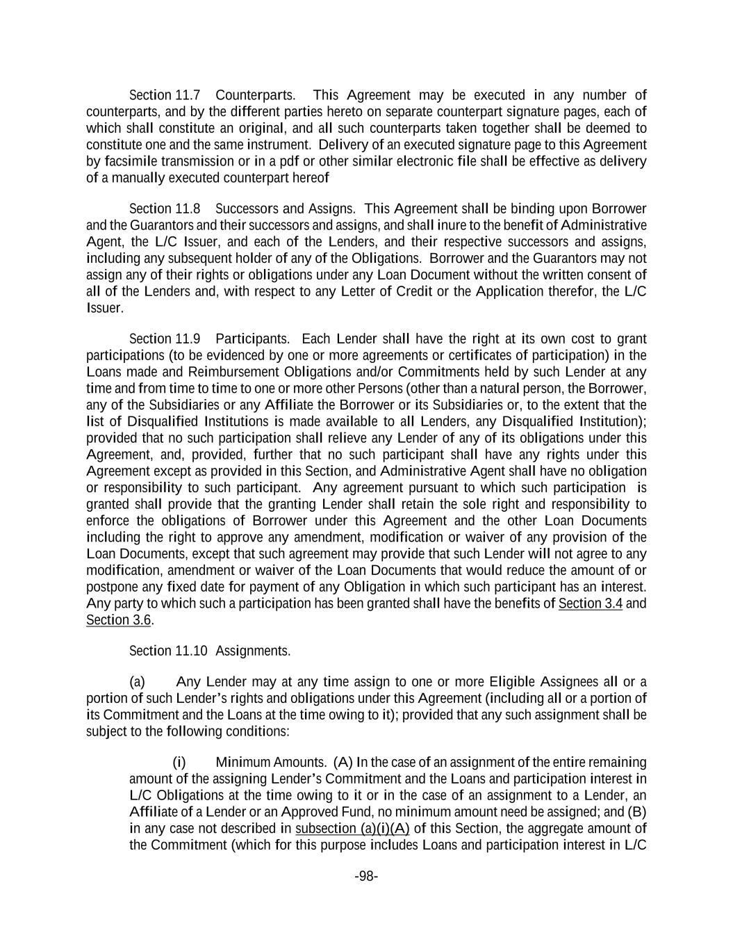 -98- Section 11.7 Counterparts. This Agreement may be executed in any number of counterparts, and by the different parties hereto on separate counterpart signature pages, each of which shall constitute an original, and all such counterparts taken together shall be deemed to constitute one and the same instrument. Delivery of an executed signature page to this Agreement by facsimile transmission or in a pdf or other similar electronic file shall be effective as delivery of a manually executed counterpart hereof Section 11.8 Successors and Assigns. This Agreement shall be binding upon Borrower and the Guarantors and their successors and assigns, and shall inure to the benefit of Administrative Agent, the L/C Issuer, and each of the Lenders, and their respective successors and assigns, including any subsequent holder of any of the Obligations. Borrower and the Guarantors may not assign any of their rights or obligations under any Loan Document without the written consent of all of the Lenders and, with respect to any Letter of Credit or the Application therefor, the L/C Issuer. Section 11.9 Participants. Each Lender shall have the right at its own cost to grant participations (to be evidenced by one or more agreements or certificates of participation) in the Loans made and Reimbursement Obligations and/or Commitments held by such Lender at any time and from time to time to one or more other Persons (other than a natural person, the Borrower, any of the Subsidiaries or any Affiliate the Borrower or its Subsidiaries or, to the extent that the list of Disqualified Institutions is made available to all Lenders, any Disqualified Institution); provided that no such participation shall relieve any Lender of any of its obligations under this Agreement, and, provided, further that no such participant shall have any rights under this Agreement except as provided in this Section, and Administrative Agent shall have no obligation or responsibility to such participant. Any agreement pursuant to which such participation is granted shall provide that the granting Lender shall retain the sole right and responsibility to enforce the obligations of Borrower under this Agreement and the other Loan Documents including the right to approve any amendment, modification or waiver of any provision of the Loan Documents, except that such agreement may provide that such Lender will not agree to any modification, amendment or waiver of the Loan Documents that would reduce the amount of or postpone any fixed date for payment of any Obligation in which such participant has an interest. Any party to which such a participation has been granted shall have the benefits of Section 3.4 and Section 3.6. Section 11.10 Assignments. (a) Any Lender may at any time assign to one or more Eligible Assignees all or a portion of such Lender’s rights and obligations under this Agreement (including all or a portion of its Commitment and the Loans at the time owing to it); provided that any such assignment shall be subject to the following conditions: (i) Minimum Amounts. (A) In the case of an assignment of the entire remaining amount of the assigning Lender’s Commitment and the Loans and participation interest in L/C Obligations at the time owing to it or in the case of an assignment to a Lender, an Affiliate of a Lender or an Approved Fund, no minimum amount need be assigned; and (B) in any case not described in subsection (a)(i)(A) of this Section, the aggregate amount of the Commitment (which for this purpose includes Loans and participation interest in L/C