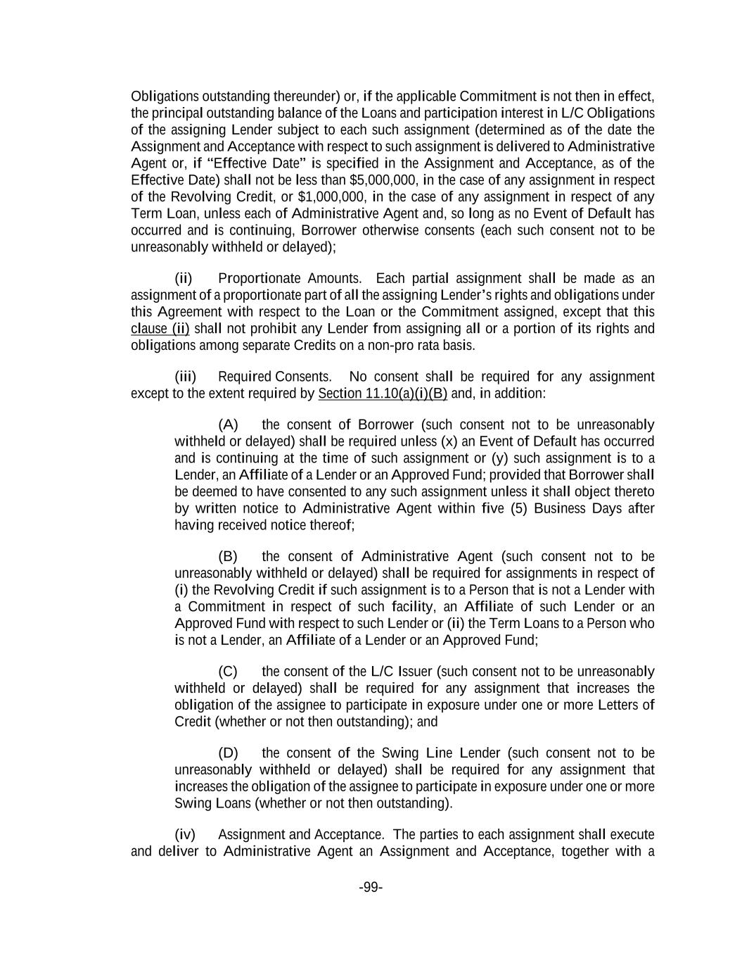-99- Obligations outstanding thereunder) or, if the applicable Commitment is not then in effect, the principal outstanding balance of the Loans and participation interest in L/C Obligations of the assigning Lender subject to each such assignment (determined as of the date the Assignment and Acceptance with respect to such assignment is delivered to Administrative Agent or, if “Effective Date” is specified in the Assignment and Acceptance, as of the Effective Date) shall not be less than $5,000,000, in the case of any assignment in respect of the Revolving Credit, or $1,000,000, in the case of any assignment in respect of any Term Loan, unless each of Administrative Agent and, so long as no Event of Default has occurred and is continuing, Borrower otherwise consents (each such consent not to be unreasonably withheld or delayed); (ii) Proportionate Amounts. Each partial assignment shall be made as an assignment of a proportionate part of all the assigning Lender’s rights and obligations under this Agreement with respect to the Loan or the Commitment assigned, except that this clause (ii) shall not prohibit any Lender from assigning all or a portion of its rights and obligations among separate Credits on a non-pro rata basis. (iii) Required Consents. No consent shall be required for any assignment except to the extent required by Section 11.10(a)(i)(B) and, in addition: (A) the consent of Borrower (such consent not to be unreasonably withheld or delayed) shall be required unless (x) an Event of Default has occurred and is continuing at the time of such assignment or (y) such assignment is to a Lender, an Affiliate of a Lender or an Approved Fund; provided that Borrower shall be deemed to have consented to any such assignment unless it shall object thereto by written notice to Administrative Agent within five (5) Business Days after having received notice thereof; (B) the consent of Administrative Agent (such consent not to be unreasonably withheld or delayed) shall be required for assignments in respect of (i) the Revolving Credit if such assignment is to a Person that is not a Lender with a Commitment in respect of such facility, an Affiliate of such Lender or an Approved Fund with respect to such Lender or (ii) the Term Loans to a Person who is not a Lender, an Affiliate of a Lender or an Approved Fund; (C) the consent of the L/C Issuer (such consent not to be unreasonably withheld or delayed) shall be required for any assignment that increases the obligation of the assignee to participate in exposure under one or more Letters of Credit (whether or not then outstanding); and (D) the consent of the Swing Line Lender (such consent not to be unreasonably withheld or delayed) shall be required for any assignment that increases the obligation of the assignee to participate in exposure under one or more Swing Loans (whether or not then outstanding). (iv) Assignment and Acceptance. The parties to each assignment shall execute and deliver to Administrative Agent an Assignment and Acceptance, together with a