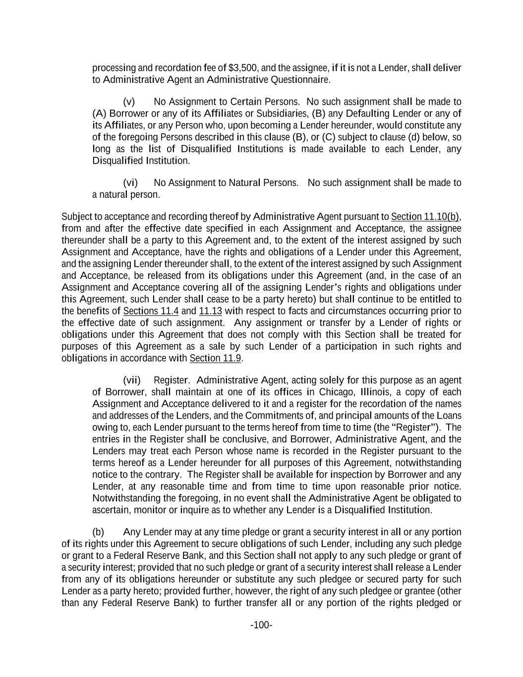 -100- processing and recordation fee of $3,500, and the assignee, if it is not a Lender, shall deliver to Administrative Agent an Administrative Questionnaire. (v) No Assignment to Certain Persons. No such assignment shall be made to (A) Borrower or any of its Affiliates or Subsidiaries, (B) any Defaulting Lender or any of its Affiliates, or any Person who, upon becoming a Lender hereunder, would constitute any of the foregoing Persons described in this clause (B), or (C) subject to clause (d) below, so long as the list of Disqualified Institutions is made available to each Lender, any Disqualified Institution. (vi) No Assignment to Natural Persons. No such assignment shall be made to a natural person. Subject to acceptance and recording thereof by Administrative Agent pursuant to Section 11.10(b), from and after the effective date specified in each Assignment and Acceptance, the assignee thereunder shall be a party to this Agreement and, to the extent of the interest assigned by such Assignment and Acceptance, have the rights and obligations of a Lender under this Agreement, and the assigning Lender thereunder shall, to the extent of the interest assigned by such Assignment and Acceptance, be released from its obligations under this Agreement (and, in the case of an Assignment and Acceptance covering all of the assigning Lender’s rights and obligations under this Agreement, such Lender shall cease to be a party hereto) but shall continue to be entitled to the benefits of Sections 11.4 and 11.13 with respect to facts and circumstances occurring prior to the effective date of such assignment. Any assignment or transfer by a Lender of rights or obligations under this Agreement that does not comply with this Section shall be treated for purposes of this Agreement as a sale by such Lender of a participation in such rights and obligations in accordance with Section 11.9. (vii) Register. Administrative Agent, acting solely for this purpose as an agent of Borrower, shall maintain at one of its offices in Chicago, Illinois, a copy of each Assignment and Acceptance delivered to it and a register for the recordation of the names and addresses of the Lenders, and the Commitments of, and principal amounts of the Loans owing to, each Lender pursuant to the terms hereof from time to time (the “Register”). The entries in the Register shall be conclusive, and Borrower, Administrative Agent, and the Lenders may treat each Person whose name is recorded in the Register pursuant to the terms hereof as a Lender hereunder for all purposes of this Agreement, notwithstanding notice to the contrary. The Register shall be available for inspection by Borrower and any Lender, at any reasonable time and from time to time upon reasonable prior notice. Notwithstanding the foregoing, in no event shall the Administrative Agent be obligated to ascertain, monitor or inquire as to whether any Lender is a Disqualified Institution. (b) Any Lender may at any time pledge or grant a security interest in all or any portion of its rights under this Agreement to secure obligations of such Lender, including any such pledge or grant to a Federal Reserve Bank, and this Section shall not apply to any such pledge or grant of a security interest; provided that no such pledge or grant of a security interest shall release a Lender from any of its obligations hereunder or substitute any such pledgee or secured party for such Lender as a party hereto; provided further, however, the right of any such pledgee or grantee (other than any Federal Reserve Bank) to further transfer all or any portion of the rights pledged or