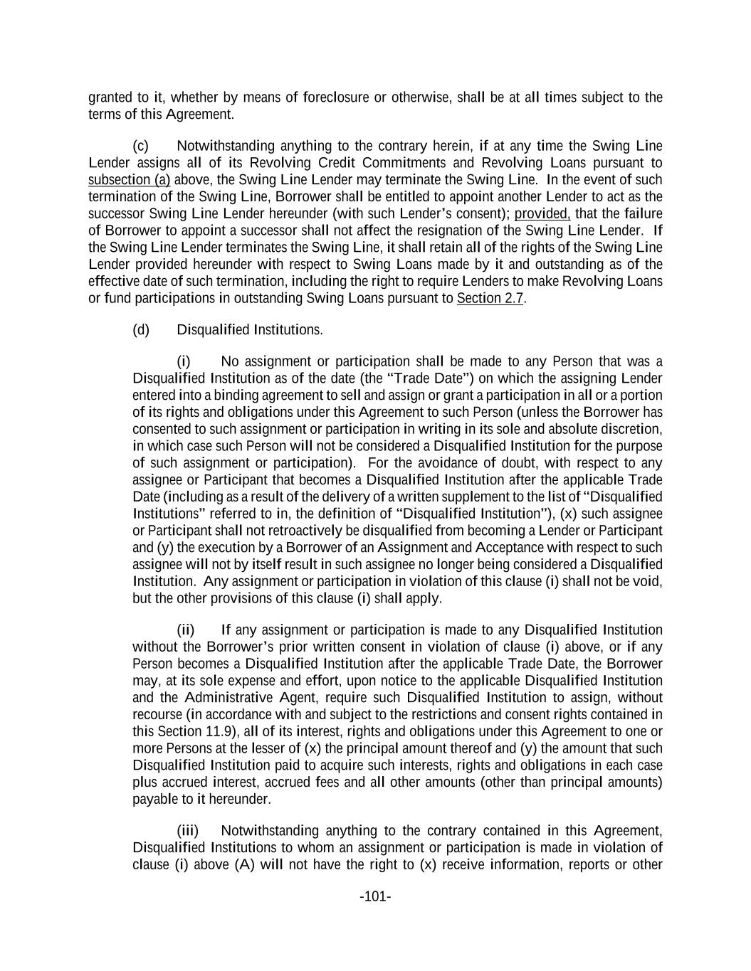 -101- granted to it, whether by means of foreclosure or otherwise, shall be at all times subject to the terms of this Agreement. (c) Notwithstanding anything to the contrary herein, if at any time the Swing Line Lender assigns all of its Revolving Credit Commitments and Revolving Loans pursuant to subsection (a) above, the Swing Line Lender may terminate the Swing Line. In the event of such termination of the Swing Line, Borrower shall be entitled to appoint another Lender to act as the successor Swing Line Lender hereunder (with such Lender’s consent); provided, that the failure of Borrower to appoint a successor shall not affect the resignation of the Swing Line Lender. If the Swing Line Lender terminates the Swing Line, it shall retain all of the rights of the Swing Line Lender provided hereunder with respect to Swing Loans made by it and outstanding as of the effective date of such termination, including the right to require Lenders to make Revolving Loans or fund participations in outstanding Swing Loans pursuant to Section 2.7. (d) Disqualified Institutions. (i) No assignment or participation shall be made to any Person that was a Disqualified Institution as of the date (the “Trade Date”) on which the assigning Lender entered into a binding agreement to sell and assign or grant a participation in all or a portion of its rights and obligations under this Agreement to such Person (unless the Borrower has consented to such assignment or participation in writing in its sole and absolute discretion, in which case such Person will not be considered a Disqualified Institution for the purpose of such assignment or participation). For the avoidance of doubt, with respect to any assignee or Participant that becomes a Disqualified Institution after the applicable Trade Date (including as a result of the delivery of a written supplement to the list of “Disqualified Institutions” referred to in, the definition of “Disqualified Institution”), (x) such assignee or Participant shall not retroactively be disqualified from becoming a Lender or Participant and (y) the execution by a Borrower of an Assignment and Acceptance with respect to such assignee will not by itself result in such assignee no longer being considered a Disqualified Institution. Any assignment or participation in violation of this clause (i) shall not be void, but the other provisions of this clause (i) shall apply. (ii) If any assignment or participation is made to any Disqualified Institution without the Borrower’s prior written consent in violation of clause (i) above, or if any Person becomes a Disqualified Institution after the applicable Trade Date, the Borrower may, at its sole expense and effort, upon notice to the applicable Disqualified Institution and the Administrative Agent, require such Disqualified Institution to assign, without recourse (in accordance with and subject to the restrictions and consent rights contained in this Section 11.9), all of its interest, rights and obligations under this Agreement to one or more Persons at the lesser of (x) the principal amount thereof and (y) the amount that such Disqualified Institution paid to acquire such interests, rights and obligations in each case plus accrued interest, accrued fees and all other amounts (other than principal amounts) payable to it hereunder. (iii) Notwithstanding anything to the contrary contained in this Agreement, Disqualified Institutions to whom an assignment or participation is made in violation of clause (i) above (A) will not have the right to (x) receive information, reports or other