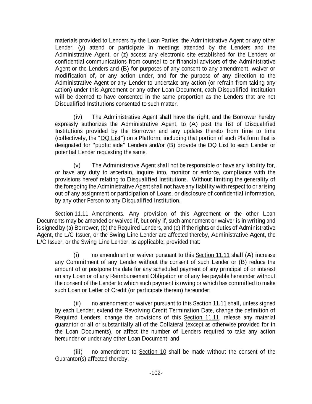 -102- materials provided to Lenders by the Loan Parties, the Administrative Agent or any other Lender, (y) attend or participate in meetings attended by the Lenders and the Administrative Agent, or (z) access any electronic site established for the Lenders or confidential communications from counsel to or financial advisors of the Administrative Agent or the Lenders and (B) for purposes of any consent to any amendment, waiver or modification of, or any action under, and for the purpose of any direction to the Administrative Agent or any Lender to undertake any action (or refrain from taking any action) under this Agreement or any other Loan Document, each Disqualified Institution will be deemed to have consented in the same proportion as the Lenders that are not Disqualified Institutions consented to such matter. (iv) The Administrative Agent shall have the right, and the Borrower hereby expressly authorizes the Administrative Agent, to (A) post the list of Disqualified Institutions provided by the Borrower and any updates thereto from time to time (collectively, the “DQ List”) on a Platform, including that portion of such Platform that is designated for “public side” Lenders and/or (B) provide the DQ List to each Lender or potential Lender requesting the same. (v) The Administrative Agent shall not be responsible or have any liability for, or have any duty to ascertain, inquire into, monitor or enforce, compliance with the provisions hereof relating to Disqualified Institutions. Without limiting the generality of the foregoing the Administrative Agent shall not have any liability with respect to or arising out of any assignment or participation of Loans, or disclosure of confidential information, by any other Person to any Disqualified Institution. Section 11.11 Amendments. Any provision of this Agreement or the other Loan Documents may be amended or waived if, but only if, such amendment or waiver is in writing and is signed by (a) Borrower, (b) the Required Lenders, and (c) if the rights or duties of Administrative Agent, the L/C Issuer, or the Swing Line Lender are affected thereby, Administrative Agent, the L/C Issuer, or the Swing Line Lender, as applicable; provided that: (i) no amendment or waiver pursuant to this Section 11.11 shall (A) increase any Commitment of any Lender without the consent of such Lender or (B) reduce the amount of or postpone the date for any scheduled payment of any principal of or interest on any Loan or of any Reimbursement Obligation or of any fee payable hereunder without the consent of the Lender to which such payment is owing or which has committed to make such Loan or Letter of Credit (or participate therein) hereunder; (ii) no amendment or waiver pursuant to this Section 11.11 shall, unless signed by each Lender, extend the Revolving Credit Termination Date, change the definition of Required Lenders, change the provisions of this Section 11.11, release any material guarantor or all or substantially all of the Collateral (except as otherwise provided for in the Loan Documents), or affect the number of Lenders required to take any action hereunder or under any other Loan Document; and (iii) no amendment to Section 10 shall be made without the consent of the Guarantor(s) affected thereby.