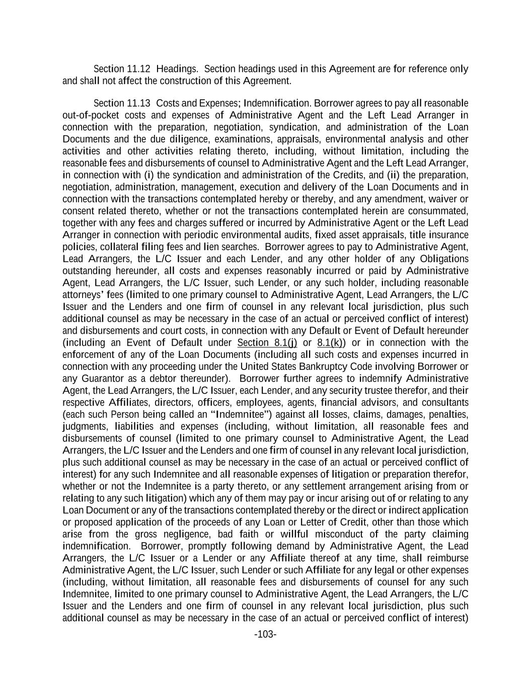 -103- Section 11.12 Headings. Section headings used in this Agreement are for reference only and shall not affect the construction of this Agreement. Section 11.13 Costs and Expenses; Indemnification. Borrower agrees to pay all reasonable out-of-pocket costs and expenses of Administrative Agent and the Left Lead Arranger in connection with the preparation, negotiation, syndication, and administration of the Loan Documents and the due diligence, examinations, appraisals, environmental analysis and other activities and other activities relating thereto, including, without limitation, including the reasonable fees and disbursements of counsel to Administrative Agent and the Left Lead Arranger, in connection with (i) the syndication and administration of the Credits, and (ii) the preparation, negotiation, administration, management, execution and delivery of the Loan Documents and in connection with the transactions contemplated hereby or thereby, and any amendment, waiver or consent related thereto, whether or not the transactions contemplated herein are consummated, together with any fees and charges suffered or incurred by Administrative Agent or the Left Lead Arranger in connection with periodic environmental audits, fixed asset appraisals, title insurance policies, collateral filing fees and lien searches. Borrower agrees to pay to Administrative Agent, Lead Arrangers, the L/C Issuer and each Lender, and any other holder of any Obligations outstanding hereunder, all costs and expenses reasonably incurred or paid by Administrative Agent, Lead Arrangers, the L/C Issuer, such Lender, or any such holder, including reasonable attorneys’ fees (limited to one primary counsel to Administrative Agent, Lead Arrangers, the L/C Issuer and the Lenders and one firm of counsel in any relevant local jurisdiction, plus such additional counsel as may be necessary in the case of an actual or perceived conflict of interest) and disbursements and court costs, in connection with any Default or Event of Default hereunder (including an Event of Default under Section 8.1(j) or 8.1(k)) or in connection with the enforcement of any of the Loan Documents (including all such costs and expenses incurred in connection with any proceeding under the United States Bankruptcy Code involving Borrower or any Guarantor as a debtor thereunder). Borrower further agrees to indemnify Administrative Agent, the Lead Arrangers, the L/C Issuer, each Lender, and any security trustee therefor, and their respective Affiliates, directors, officers, employees, agents, financial advisors, and consultants (each such Person being called an “Indemnitee”) against all losses, claims, damages, penalties, judgments, liabilities and expenses (including, without limitation, all reasonable fees and disbursements of counsel (limited to one primary counsel to Administrative Agent, the Lead Arrangers, the L/C Issuer and the Lenders and one firm of counsel in any relevant local jurisdiction, plus such additional counsel as may be necessary in the case of an actual or perceived conflict of interest) for any such Indemnitee and all reasonable expenses of litigation or preparation therefor, whether or not the Indemnitee is a party thereto, or any settlement arrangement arising from or relating to any such litigation) which any of them may pay or incur arising out of or relating to any Loan Document or any of the transactions contemplated thereby or the direct or indirect application or proposed application of the proceeds of any Loan or Letter of Credit, other than those which arise from the gross negligence, bad faith or willful misconduct of the party claiming indemnification. Borrower, promptly following demand by Administrative Agent, the Lead Arrangers, the L/C Issuer or a Lender or any Affiliate thereof at any time, shall reimburse Administrative Agent, the L/C Issuer, such Lender or such Affiliate for any legal or other expenses (including, without limitation, all reasonable fees and disbursements of counsel for any such Indemnitee, limited to one primary counsel to Administrative Agent, the Lead Arrangers, the L/C Issuer and the Lenders and one firm of counsel in any relevant local jurisdiction, plus such additional counsel as may be necessary in the case of an actual or perceived conflict of interest)