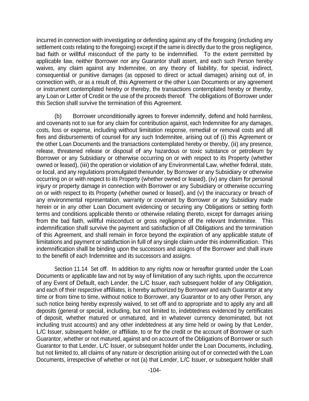 -104- incurred in connection with investigating or defending against any of the foregoing (including any settlement costs relating to the foregoing) except if the same is directly due to the gross negligence, bad faith or willful misconduct of the party to be indemnified. To the extent permitted by applicable law, neither Borrower nor any Guarantor shall assert, and each such Person hereby waives, any claim against any Indemnitee, on any theory of liability, for special, indirect, consequential or punitive damages (as opposed to direct or actual damages) arising out of, in connection with, or as a result of, this Agreement or the other Loan Documents or any agreement or instrument contemplated hereby or thereby, the transactions contemplated hereby or thereby, any Loan or Letter of Credit or the use of the proceeds thereof. The obligations of Borrower under this Section shall survive the termination of this Agreement. (b) Borrower unconditionally agrees to forever indemnify, defend and hold harmless, and covenants not to sue for any claim for contribution against, each Indemnitee for any damages, costs, loss or expense, including without limitation response, remedial or removal costs and all fees and disbursements of counsel for any such Indemnitee, arising out of (i) this Agreement or the other Loan Documents and the transactions contemplated hereby or thereby, (ii) any presence, release, threatened release or disposal of any hazardous or toxic substance or petroleum by Borrower or any Subsidiary or otherwise occurring on or with respect to its Property (whether owned or leased), (iii) the operation or violation of any Environmental Law, whether federal, state, or local, and any regulations promulgated thereunder, by Borrower or any Subsidiary or otherwise occurring on or with respect to its Property (whether owned or leased), (iv) any claim for personal injury or property damage in connection with Borrower or any Subsidiary or otherwise occurring on or with respect to its Property (whether owned or leased), and (v) the inaccuracy or breach of any environmental representation, warranty or covenant by Borrower or any Subsidiary made herein or in any other Loan Document evidencing or securing any Obligations or setting forth terms and conditions applicable thereto or otherwise relating thereto, except for damages arising from the bad faith, willful misconduct or gross negligence of the relevant Indemnitee. This indemnification shall survive the payment and satisfaction of all Obligations and the termination of this Agreement, and shall remain in force beyond the expiration of any applicable statute of limitations and payment or satisfaction in full of any single claim under this indemnification. This indemnification shall be binding upon the successors and assigns of the Borrower and shall inure to the benefit of each Indemnitee and its successors and assigns. Section 11.14 Set off. In addition to any rights now or hereafter granted under the Loan Documents or applicable law and not by way of limitation of any such rights, upon the occurrence of any Event of Default, each Lender, the L/C Issuer, each subsequent holder of any Obligation, and each of their respective affiliates, is hereby authorized by Borrower and each Guarantor at any time or from time to time, without notice to Borrower, any Guarantor or to any other Person, any such notice being hereby expressly waived, to set off and to appropriate and to apply any and all deposits (general or special, including, but not limited to, indebtedness evidenced by certificates of deposit, whether matured or unmatured, and in whatever currency denominated, but not including trust accounts) and any other indebtedness at any time held or owing by that Lender, L/C Issuer, subsequent holder, or affiliate, to or for the credit or the account of Borrower or such Guarantor, whether or not matured, against and on account of the Obligations of Borrower or such Guarantor to that Lender, L/C Issuer, or subsequent holder under the Loan Documents, including, but not limited to, all claims of any nature or description arising out of or connected with the Loan Documents, irrespective of whether or not (a) that Lender, L/C Issuer, or subsequent holder shall