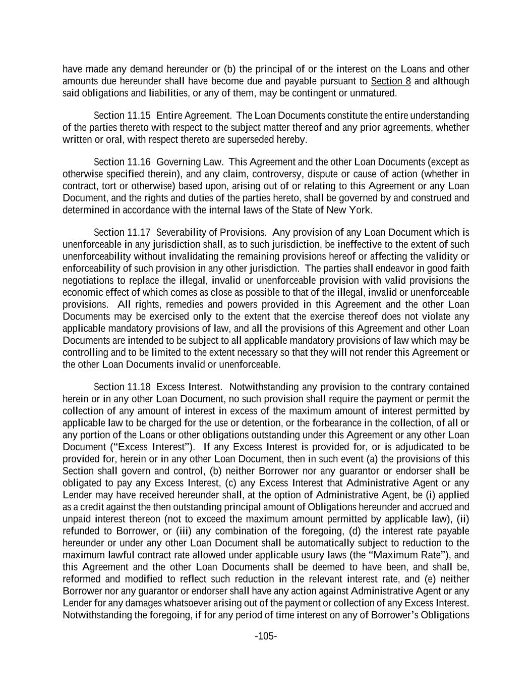 -105- have made any demand hereunder or (b) the principal of or the interest on the Loans and other amounts due hereunder shall have become due and payable pursuant to Section 8 and although said obligations and liabilities, or any of them, may be contingent or unmatured. Section 11.15 Entire Agreement. The Loan Documents constitute the entire understanding of the parties thereto with respect to the subject matter thereof and any prior agreements, whether written or oral, with respect thereto are superseded hereby. Section 11.16 Governing Law. This Agreement and the other Loan Documents (except as otherwise specified therein), and any claim, controversy, dispute or cause of action (whether in contract, tort or otherwise) based upon, arising out of or relating to this Agreement or any Loan Document, and the rights and duties of the parties hereto, shall be governed by and construed and determined in accordance with the internal laws of the State of New York. Section 11.17 Severability of Provisions. Any provision of any Loan Document which is unenforceable in any jurisdiction shall, as to such jurisdiction, be ineffective to the extent of such unenforceability without invalidating the remaining provisions hereof or affecting the validity or enforceability of such provision in any other jurisdiction. The parties shall endeavor in good faith negotiations to replace the illegal, invalid or unenforceable provision with valid provisions the economic effect of which comes as close as possible to that of the illegal, invalid or unenforceable provisions. All rights, remedies and powers provided in this Agreement and the other Loan Documents may be exercised only to the extent that the exercise thereof does not violate any applicable mandatory provisions of law, and all the provisions of this Agreement and other Loan Documents are intended to be subject to all applicable mandatory provisions of law which may be controlling and to be limited to the extent necessary so that they will not render this Agreement or the other Loan Documents invalid or unenforceable. Section 11.18 Excess Interest. Notwithstanding any provision to the contrary contained herein or in any other Loan Document, no such provision shall require the payment or permit the collection of any amount of interest in excess of the maximum amount of interest permitted by applicable law to be charged for the use or detention, or the forbearance in the collection, of all or any portion of the Loans or other obligations outstanding under this Agreement or any other Loan Document (“Excess Interest”). If any Excess Interest is provided for, or is adjudicated to be provided for, herein or in any other Loan Document, then in such event (a) the provisions of this Section shall govern and control, (b) neither Borrower nor any guarantor or endorser shall be obligated to pay any Excess Interest, (c) any Excess Interest that Administrative Agent or any Lender may have received hereunder shall, at the option of Administrative Agent, be (i) applied as a credit against the then outstanding principal amount of Obligations hereunder and accrued and unpaid interest thereon (not to exceed the maximum amount permitted by applicable law), (ii) refunded to Borrower, or (iii) any combination of the foregoing, (d) the interest rate payable hereunder or under any other Loan Document shall be automatically subject to reduction to the maximum lawful contract rate allowed under applicable usury laws (the “Maximum Rate”), and this Agreement and the other Loan Documents shall be deemed to have been, and shall be, reformed and modified to reflect such reduction in the relevant interest rate, and (e) neither Borrower nor any guarantor or endorser shall have any action against Administrative Agent or any Lender for any damages whatsoever arising out of the payment or collection of any Excess Interest. Notwithstanding the foregoing, if for any period of time interest on any of Borrower’s Obligations