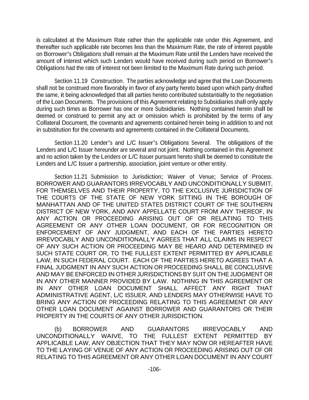 -106- is calculated at the Maximum Rate rather than the applicable rate under this Agreement, and thereafter such applicable rate becomes less than the Maximum Rate, the rate of interest payable on Borrower’s Obligations shall remain at the Maximum Rate until the Lenders have received the amount of interest which such Lenders would have received during such period on Borrower’s Obligations had the rate of interest not been limited to the Maximum Rate during such period. Section 11.19 Construction. The parties acknowledge and agree that the Loan Documents shall not be construed more favorably in favor of any party hereto based upon which party drafted the same, it being acknowledged that all parties hereto contributed substantially to the negotiation of the Loan Documents. The provisions of this Agreement relating to Subsidiaries shall only apply during such times as Borrower has one or more Subsidiaries. Nothing contained herein shall be deemed or construed to permit any act or omission which is prohibited by the terms of any Collateral Document, the covenants and agreements contained herein being in addition to and not in substitution for the covenants and agreements contained in the Collateral Documents. Section 11.20 Lender’s and L/C Issuer’s Obligations Several. The obligations of the Lenders and L/C Issuer hereunder are several and not joint. Nothing contained in this Agreement and no action taken by the Lenders or L/C Issuer pursuant hereto shall be deemed to constitute the Lenders and L/C Issuer a partnership, association, joint venture or other entity. Section 11.21 Submission to Jurisdiction; Waiver of Venue; Service of Process. BORROWER AND GUARANTORS IRREVOCABLY AND UNCONDITIONALLY SUBMIT, FOR THEMSELVES AND THEIR PROPERTY, TO THE EXCLUSIVE JURISDICTION OF THE COURTS OF THE STATE OF NEW YORK SITTING IN THE BOROUGH OF MANHATTAN AND OF THE UNITED STATES DISTRICT COURT OF THE SOUTHERN DISTRICT OF NEW YORK, AND ANY APPELLATE COURT FROM ANY THEREOF, IN ANY ACTION OR PROCEEDING ARISING OUT OF OR RELATING TO THIS AGREEMENT OR ANY OTHER LOAN DOCUMENT, OR FOR RECOGNITION OR ENFORCEMENT OF ANY JUDGMENT, AND EACH OF THE PARTIES HERETO IRREVOCABLY AND UNCONDITIONALLY AGREES THAT ALL CLAIMS IN RESPECT OF ANY SUCH ACTION OR PROCEEDING MAY BE HEARD AND DETERMINED IN SUCH STATE COURT OR, TO THE FULLEST EXTENT PERMITTED BY APPLICABLE LAW, IN SUCH FEDERAL COURT. EACH OF THE PARTIES HERETO AGREES THAT A FINAL JUDGMENT IN ANY SUCH ACTION OR PROCEEDING SHALL BE CONCLUSIVE AND MAY BE ENFORCED IN OTHER JURISDICTIONS BY SUIT ON THE JUDGMENT OR IN ANY OTHER MANNER PROVIDED BY LAW. NOTHING IN THIS AGREEMENT OR IN ANY OTHER LOAN DOCUMENT SHALL AFFECT ANY RIGHT THAT ADMINISTRATIVE AGENT, L/C ISSUER, AND LENDERS MAY OTHERWISE HAVE TO BRING ANY ACTION OR PROCEEDING RELATING TO THIS AGREEMENT OR ANY OTHER LOAN DOCUMENT AGAINST BORROWER AND GUARANTORS OR THEIR PROPERTY IN THE COURTS OF ANY OTHER JURISDICTION. (b) BORROWER AND GUARANTORS IRREVOCABLY AND UNCONDITIONALLY WAIVE, TO THE FULLEST EXTENT PERMITTED BY APPLICABLE LAW, ANY OBJECTION THAT THEY MAY NOW OR HEREAFTER HAVE TO THE LAYING OF VENUE OF ANY ACTION OR PROCEEDING ARISING OUT OF OR RELATING TO THIS AGREEMENT OR ANY OTHER LOAN DOCUMENT IN ANY COURT