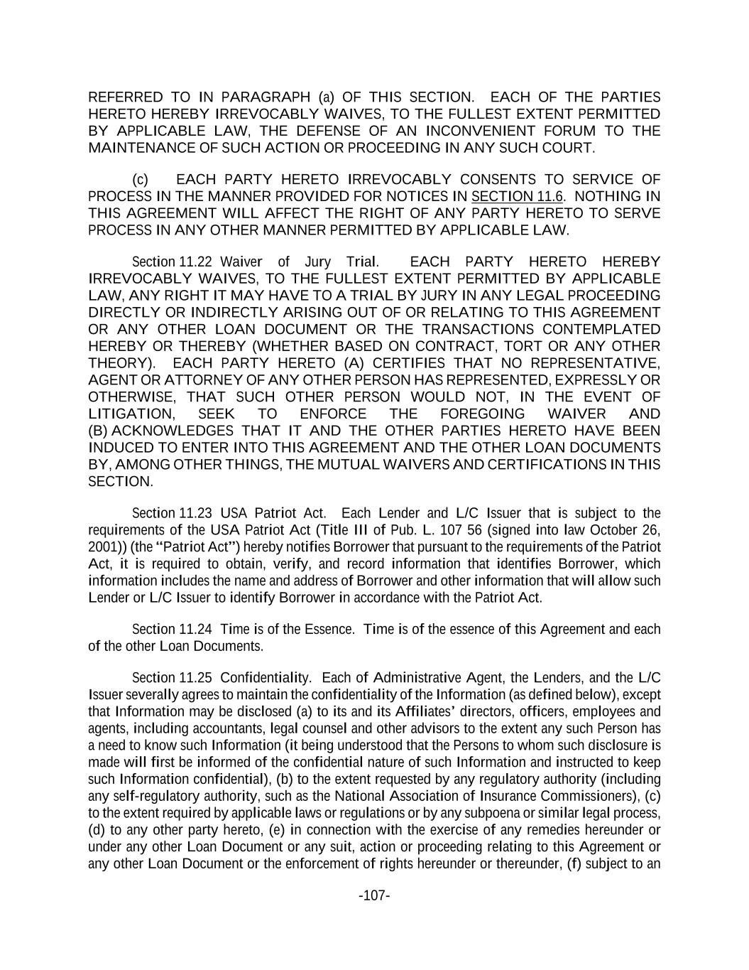 -107- REFERRED TO IN PARAGRAPH (a) OF THIS SECTION. EACH OF THE PARTIES HERETO HEREBY IRREVOCABLY WAIVES, TO THE FULLEST EXTENT PERMITTED BY APPLICABLE LAW, THE DEFENSE OF AN INCONVENIENT FORUM TO THE MAINTENANCE OF SUCH ACTION OR PROCEEDING IN ANY SUCH COURT. (c) EACH PARTY HERETO IRREVOCABLY CONSENTS TO SERVICE OF PROCESS IN THE MANNER PROVIDED FOR NOTICES IN SECTION 11.6. NOTHING IN THIS AGREEMENT WILL AFFECT THE RIGHT OF ANY PARTY HERETO TO SERVE PROCESS IN ANY OTHER MANNER PERMITTED BY APPLICABLE LAW. Section 11.22 Waiver of Jury Trial. EACH PARTY HERETO HEREBY IRREVOCABLY WAIVES, TO THE FULLEST EXTENT PERMITTED BY APPLICABLE LAW, ANY RIGHT IT MAY HAVE TO A TRIAL BY JURY IN ANY LEGAL PROCEEDING DIRECTLY OR INDIRECTLY ARISING OUT OF OR RELATING TO THIS AGREEMENT OR ANY OTHER LOAN DOCUMENT OR THE TRANSACTIONS CONTEMPLATED HEREBY OR THEREBY (WHETHER BASED ON CONTRACT, TORT OR ANY OTHER THEORY). EACH PARTY HERETO (A) CERTIFIES THAT NO REPRESENTATIVE, AGENT OR ATTORNEY OF ANY OTHER PERSON HAS REPRESENTED, EXPRESSLY OR OTHERWISE, THAT SUCH OTHER PERSON WOULD NOT, IN THE EVENT OF LITIGATION, SEEK TO ENFORCE THE FOREGOING WAIVER AND (B) ACKNOWLEDGES THAT IT AND THE OTHER PARTIES HERETO HAVE BEEN INDUCED TO ENTER INTO THIS AGREEMENT AND THE OTHER LOAN DOCUMENTS BY, AMONG OTHER THINGS, THE MUTUAL WAIVERS AND CERTIFICATIONS IN THIS SECTION. Section 11.23 USA Patriot Act. Each Lender and L/C Issuer that is subject to the requirements of the USA Patriot Act (Title III of Pub. L. 107 56 (signed into law October 26, 2001)) (the “Patriot Act”) hereby notifies Borrower that pursuant to the requirements of the Patriot Act, it is required to obtain, verify, and record information that identifies Borrower, which information includes the name and address of Borrower and other information that will allow such Lender or L/C Issuer to identify Borrower in accordance with the Patriot Act. Section 11.24 Time is of the Essence. Time is of the essence of this Agreement and each of the other Loan Documents. Section 11.25 Confidentiality. Each of Administrative Agent, the Lenders, and the L/C Issuer severally agrees to maintain the confidentiality of the Information (as defined below), except that Information may be disclosed (a) to its and its Affiliates’ directors, officers, employees and agents, including accountants, legal counsel and other advisors to the extent any such Person has a need to know such Information (it being understood that the Persons to whom such disclosure is made will first be informed of the confidential nature of such Information and instructed to keep such Information confidential), (b) to the extent requested by any regulatory authority (including any self-regulatory authority, such as the National Association of Insurance Commissioners), (c) to the extent required by applicable laws or regulations or by any subpoena or similar legal process, (d) to any other party hereto, (e) in connection with the exercise of any remedies hereunder or under any other Loan Document or any suit, action or proceeding relating to this Agreement or any other Loan Document or the enforcement of rights hereunder or thereunder, (f) subject to an