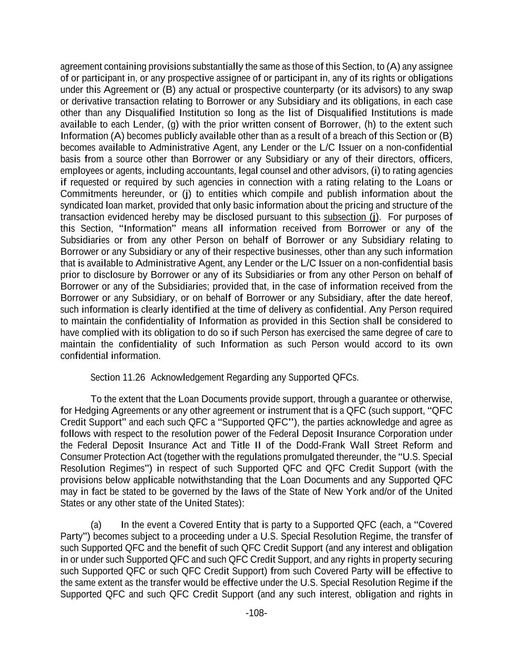 -108- agreement containing provisions substantially the same as those of this Section, to (A) any assignee of or participant in, or any prospective assignee of or participant in, any of its rights or obligations under this Agreement or (B) any actual or prospective counterparty (or its advisors) to any swap or derivative transaction relating to Borrower or any Subsidiary and its obligations, in each case other than any Disqualified Institution so long as the list of Disqualified Institutions is made available to each Lender, (g) with the prior written consent of Borrower, (h) to the extent such Information (A) becomes publicly available other than as a result of a breach of this Section or (B) becomes available to Administrative Agent, any Lender or the L/C Issuer on a non-confidential basis from a source other than Borrower or any Subsidiary or any of their directors, officers, employees or agents, including accountants, legal counsel and other advisors, (i) to rating agencies if requested or required by such agencies in connection with a rating relating to the Loans or Commitments hereunder, or (j) to entities which compile and publish information about the syndicated loan market, provided that only basic information about the pricing and structure of the transaction evidenced hereby may be disclosed pursuant to this subsection (j). For purposes of this Section, “Information” means all information received from Borrower or any of the Subsidiaries or from any other Person on behalf of Borrower or any Subsidiary relating to Borrower or any Subsidiary or any of their respective businesses, other than any such information that is available to Administrative Agent, any Lender or the L/C Issuer on a non-confidential basis prior to disclosure by Borrower or any of its Subsidiaries or from any other Person on behalf of Borrower or any of the Subsidiaries; provided that, in the case of information received from the Borrower or any Subsidiary, or on behalf of Borrower or any Subsidiary, after the date hereof, such information is clearly identified at the time of delivery as confidential. Any Person required to maintain the confidentiality of Information as provided in this Section shall be considered to have complied with its obligation to do so if such Person has exercised the same degree of care to maintain the confidentiality of such Information as such Person would accord to its own confidential information. Section 11.26 Acknowledgement Regarding any Supported QFCs. To the extent that the Loan Documents provide support, through a guarantee or otherwise, for Hedging Agreements or any other agreement or instrument that is a QFC (such support, “QFC Credit Support” and each such QFC a “Supported QFC”), the parties acknowledge and agree as follows with respect to the resolution power of the Federal Deposit Insurance Corporation under the Federal Deposit Insurance Act and Title II of the Dodd-Frank Wall Street Reform and Consumer Protection Act (together with the regulations promulgated thereunder, the “U.S. Special Resolution Regimes”) in respect of such Supported QFC and QFC Credit Support (with the provisions below applicable notwithstanding that the Loan Documents and any Supported QFC may in fact be stated to be governed by the laws of the State of New York and/or of the United States or any other state of the United States): (a) In the event a Covered Entity that is party to a Supported QFC (each, a “Covered Party”) becomes subject to a proceeding under a U.S. Special Resolution Regime, the transfer of such Supported QFC and the benefit of such QFC Credit Support (and any interest and obligation in or under such Supported QFC and such QFC Credit Support, and any rights in property securing such Supported QFC or such QFC Credit Support) from such Covered Party will be effective to the same extent as the transfer would be effective under the U.S. Special Resolution Regime if the Supported QFC and such QFC Credit Support (and any such interest, obligation and rights in